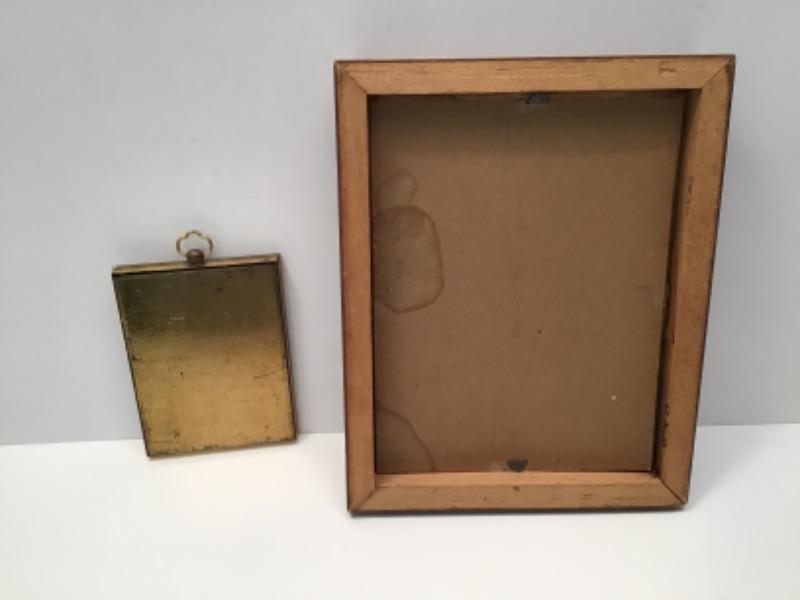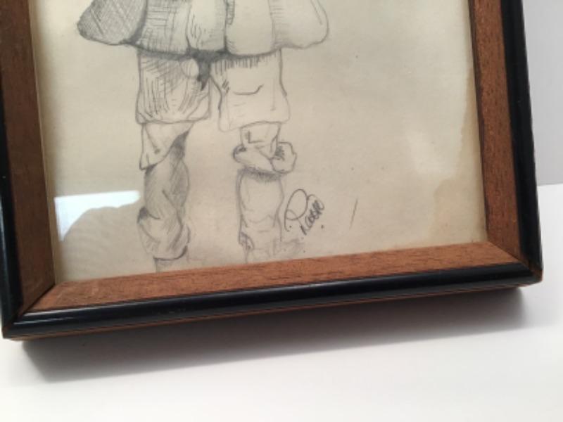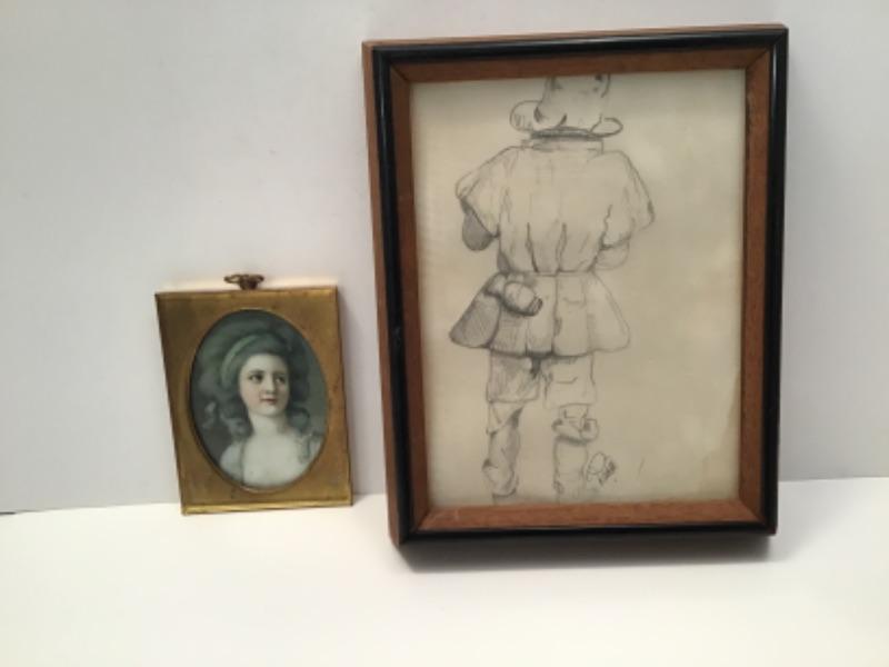 Very old. Female portrait is antique postcard in very nice brass frame. Pencil drawing old and signed.