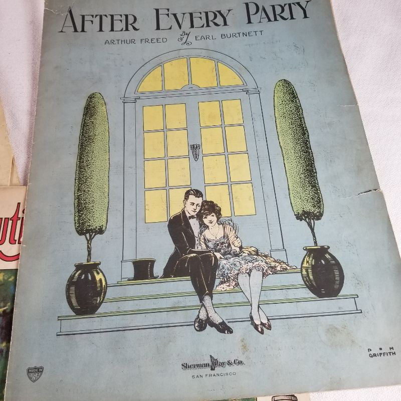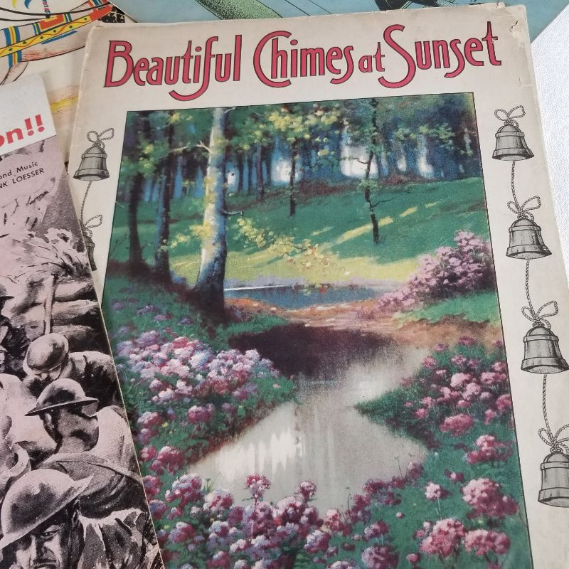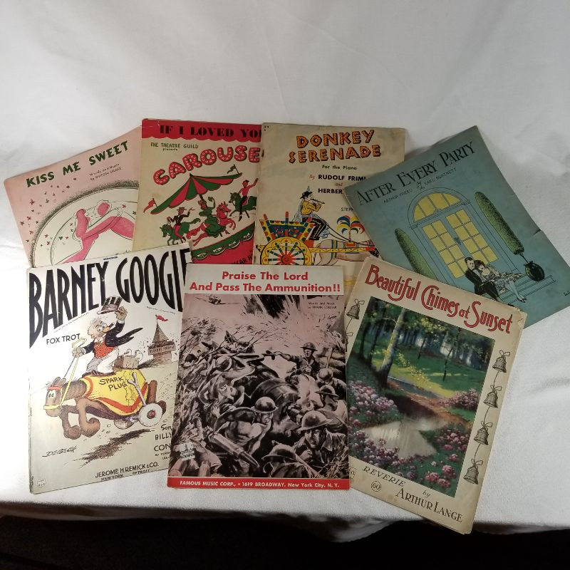 In this offering there are 7 sets of old sheet music with great graphics. If you don't play the piano, they would also be great for decoupage crafts. They are good for their age, some tears, yellowing and a little musty but good color and have the look.