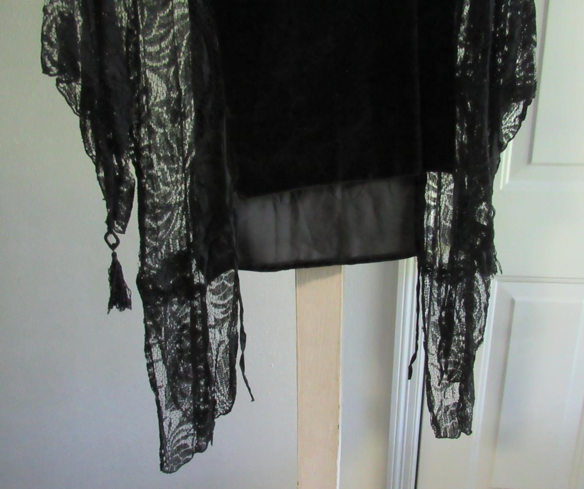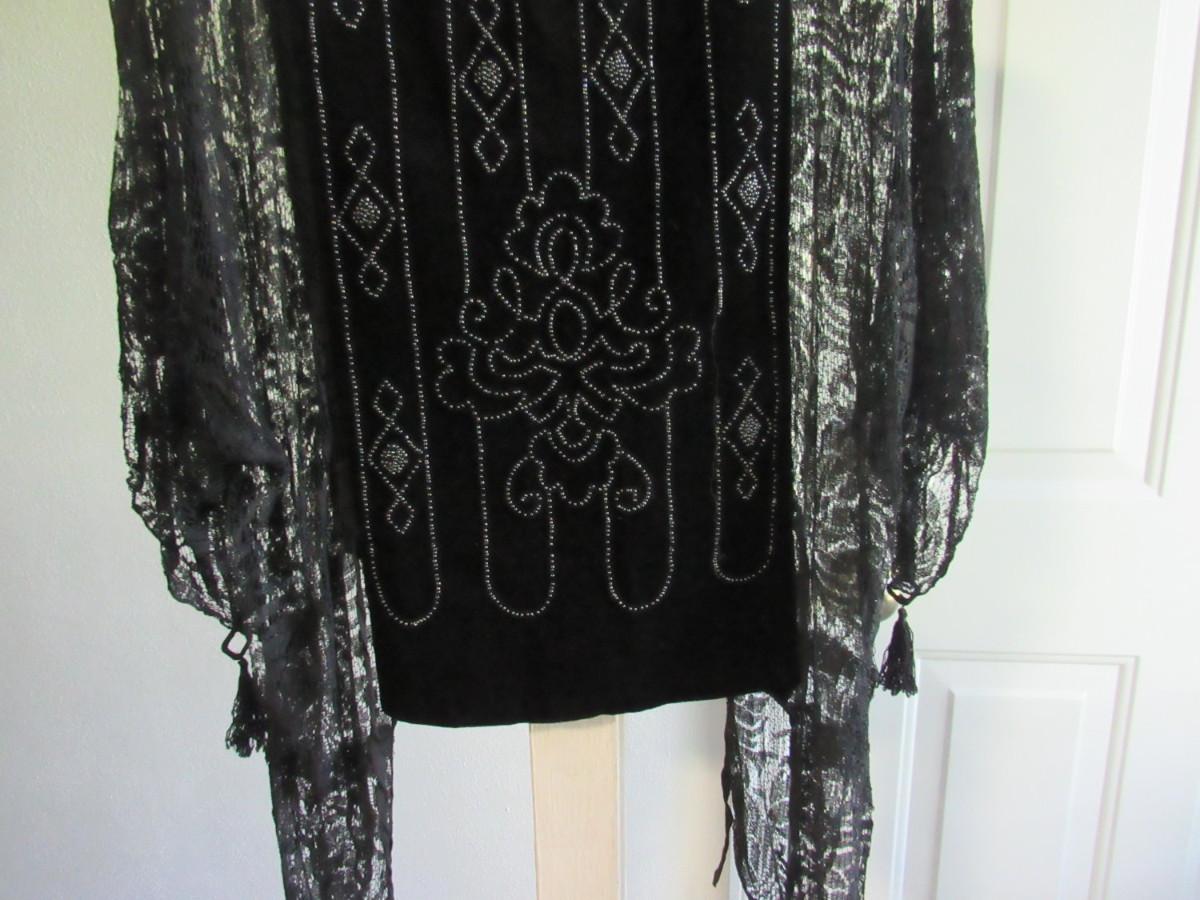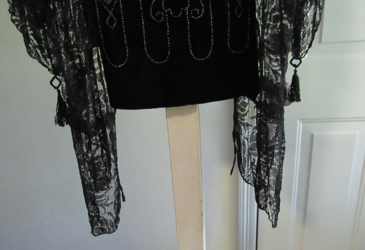 Round black beads on black velvet with lace sleeves. Little fabric dangles at sleeve ends. There are a few areas where the beads are missing. I can't tell if the beads are hand or machine stitched. Top itself is machine stitched. There is one long hole on the side lace panel near the side seam, and another smaller hole in the lace on the other side, as seen in close up photos. Ribbon and lace ties at the waist. Size unknown, no labels.