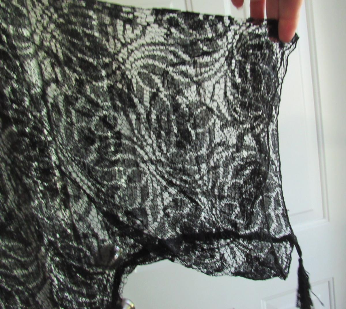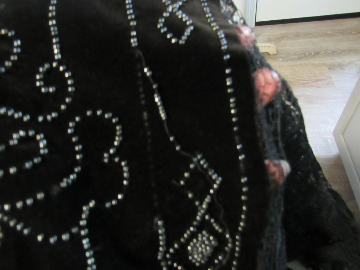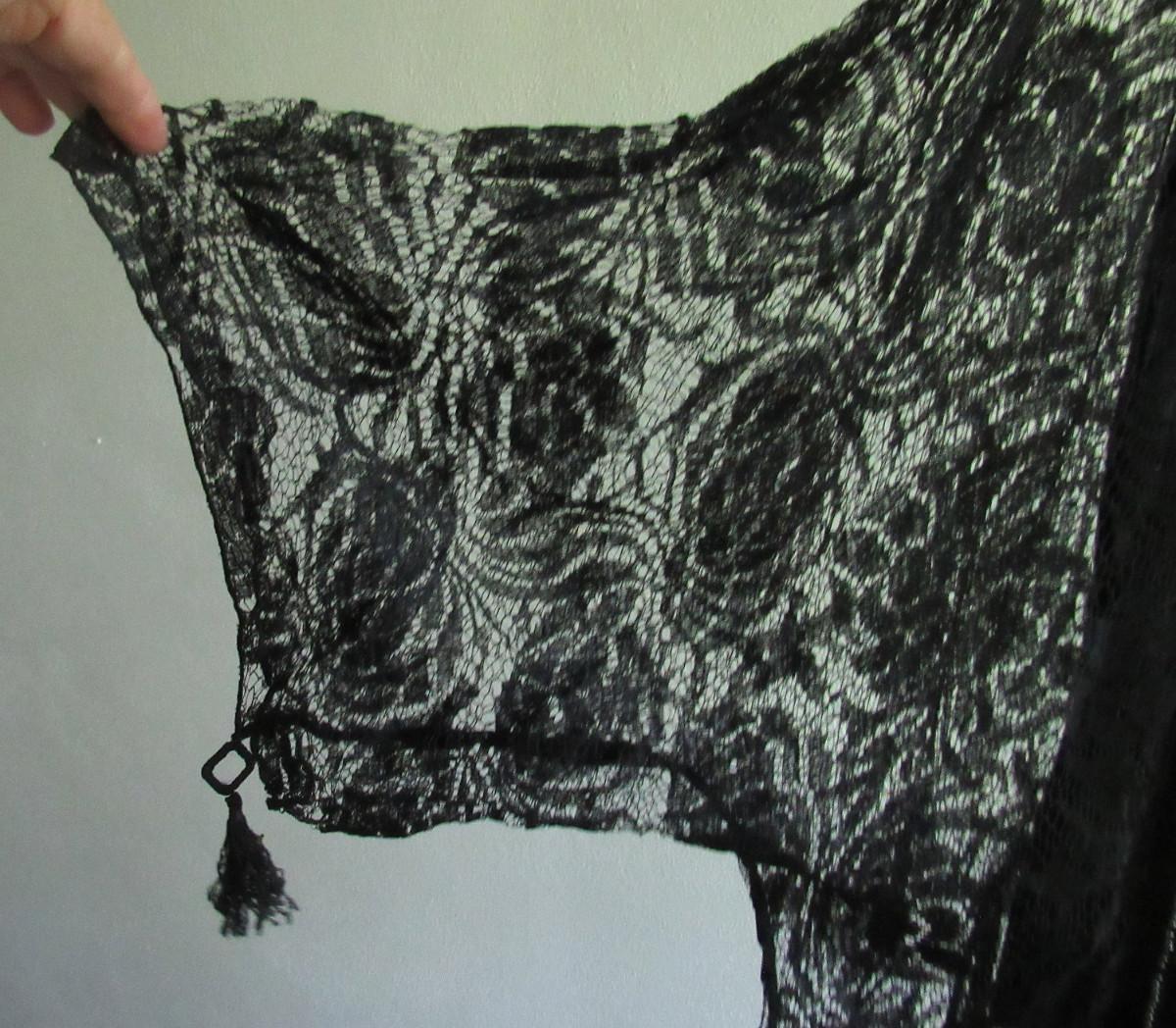 Round black beads on black velvet with lace sleeves. Little fabric dangles at sleeve ends. There are a few areas where the beads are missing. I can't tell if the beads are hand or machine stitched. Top itself is machine stitched. There is one long hole on the side lace panel near the side seam, and another smaller hole in the lace on the other side, as seen in close up photos. Ribbon and lace ties at the waist. Size unknown, no labels.