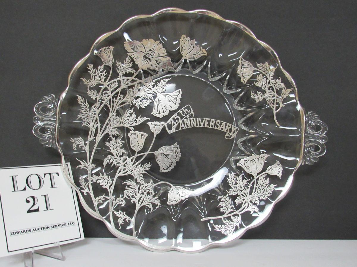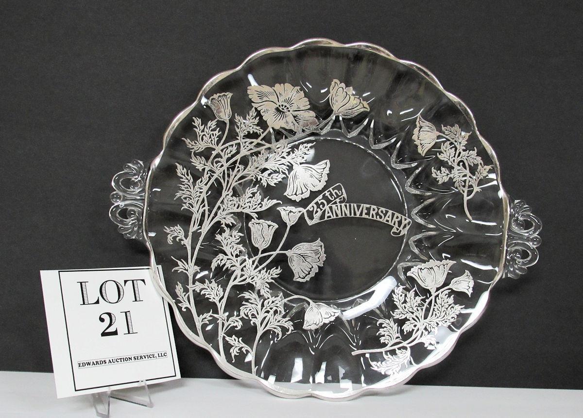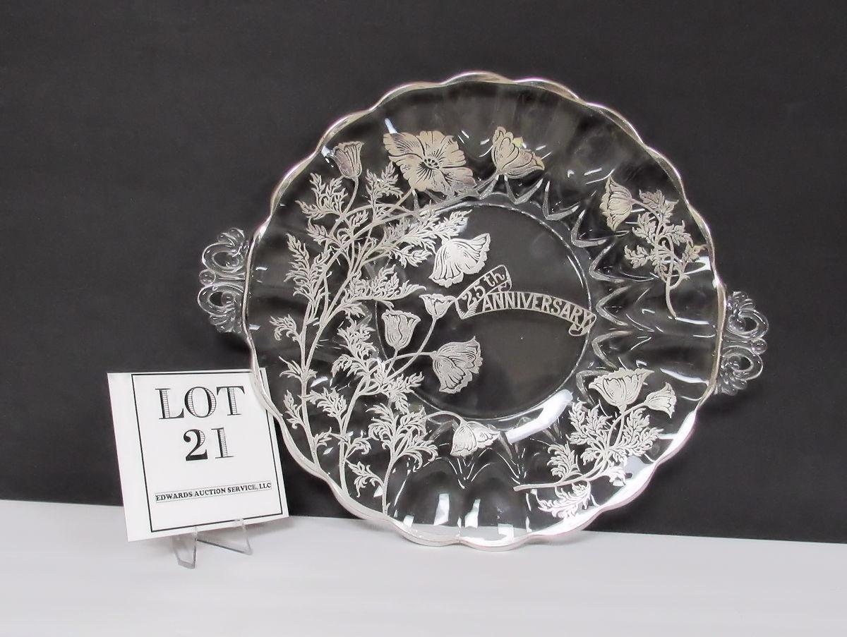 Very Pretty Silver Deposit Flowers on New Martinsville Janice Handled Tray