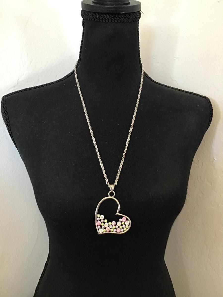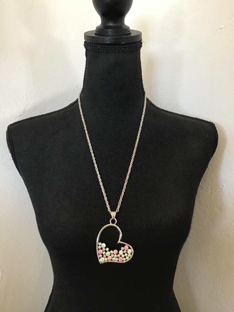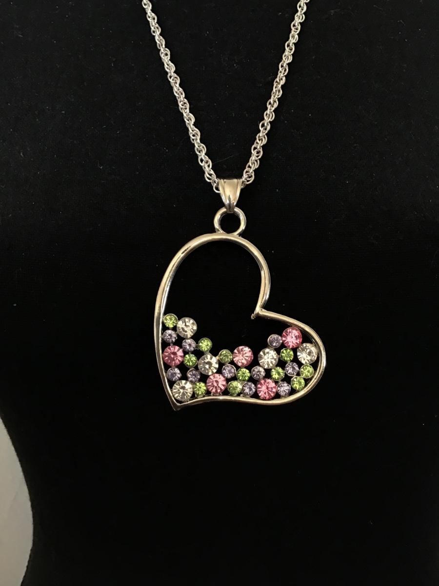 Very pretty silver toned, large, multi colored rhinestone, heart statement, necklace