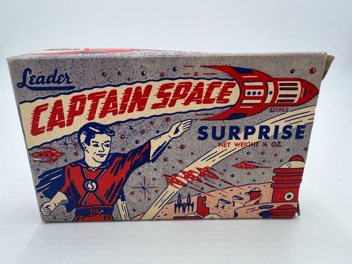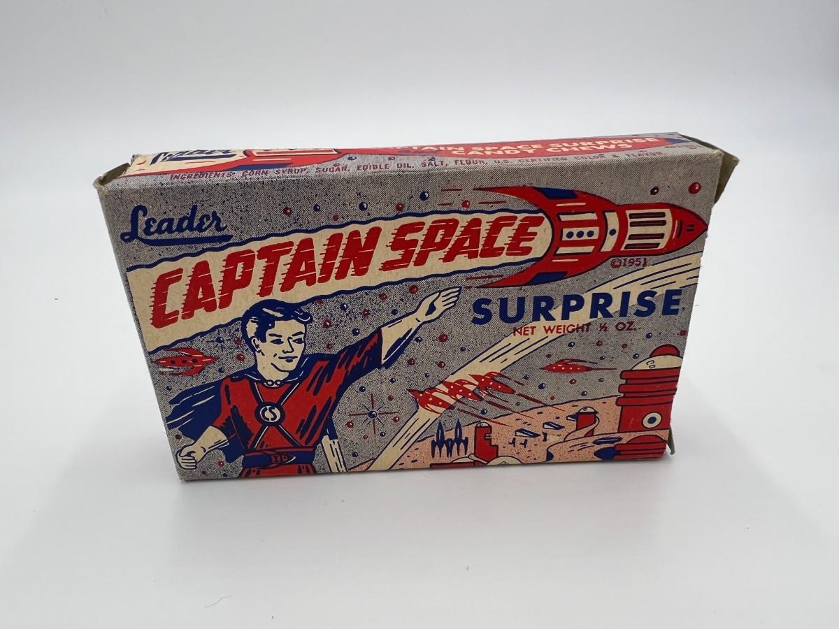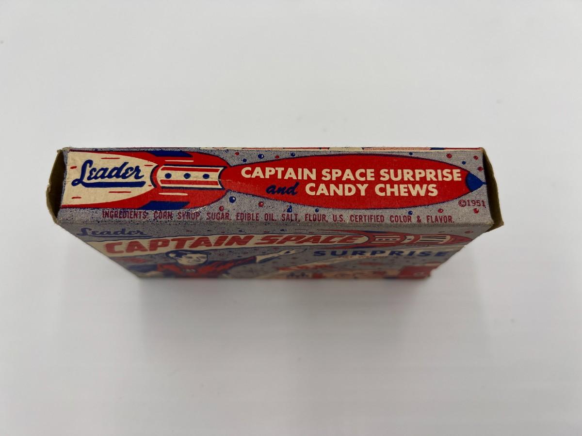 Extremely rare, you will never see one again. In very good condition (as shown). A 1951 box of Leader Candy Chews featuring a Captain Space Surprise! Wonderful blue and red colors, and shows a scene of Captain Space fighting in a space battle of some kind. U.S.A. Leader Novelty Candy Co N.Y.