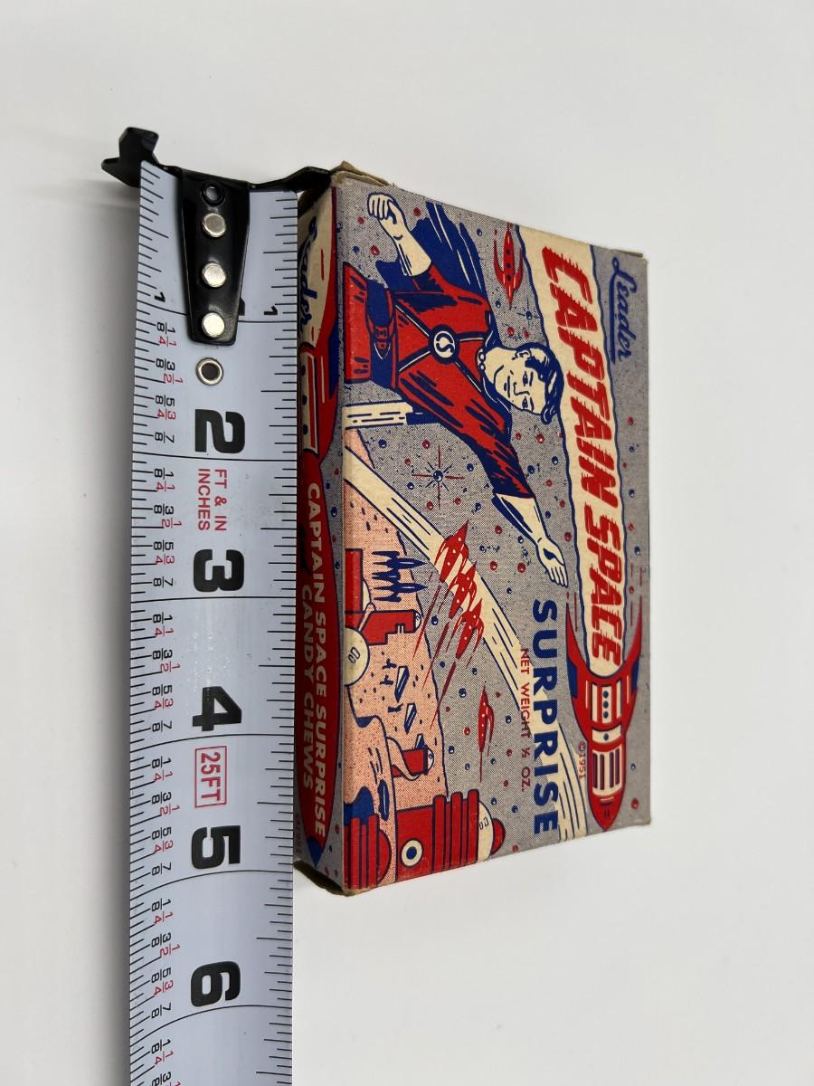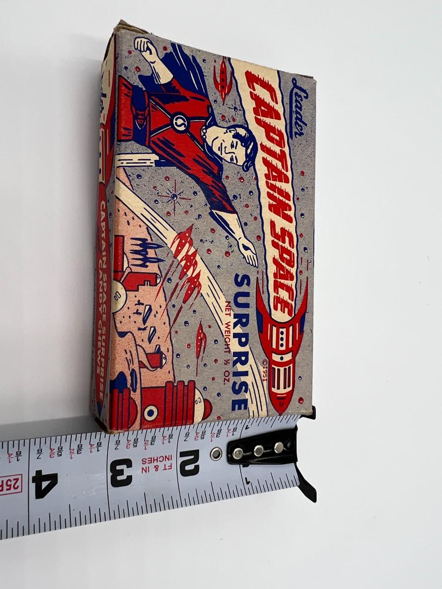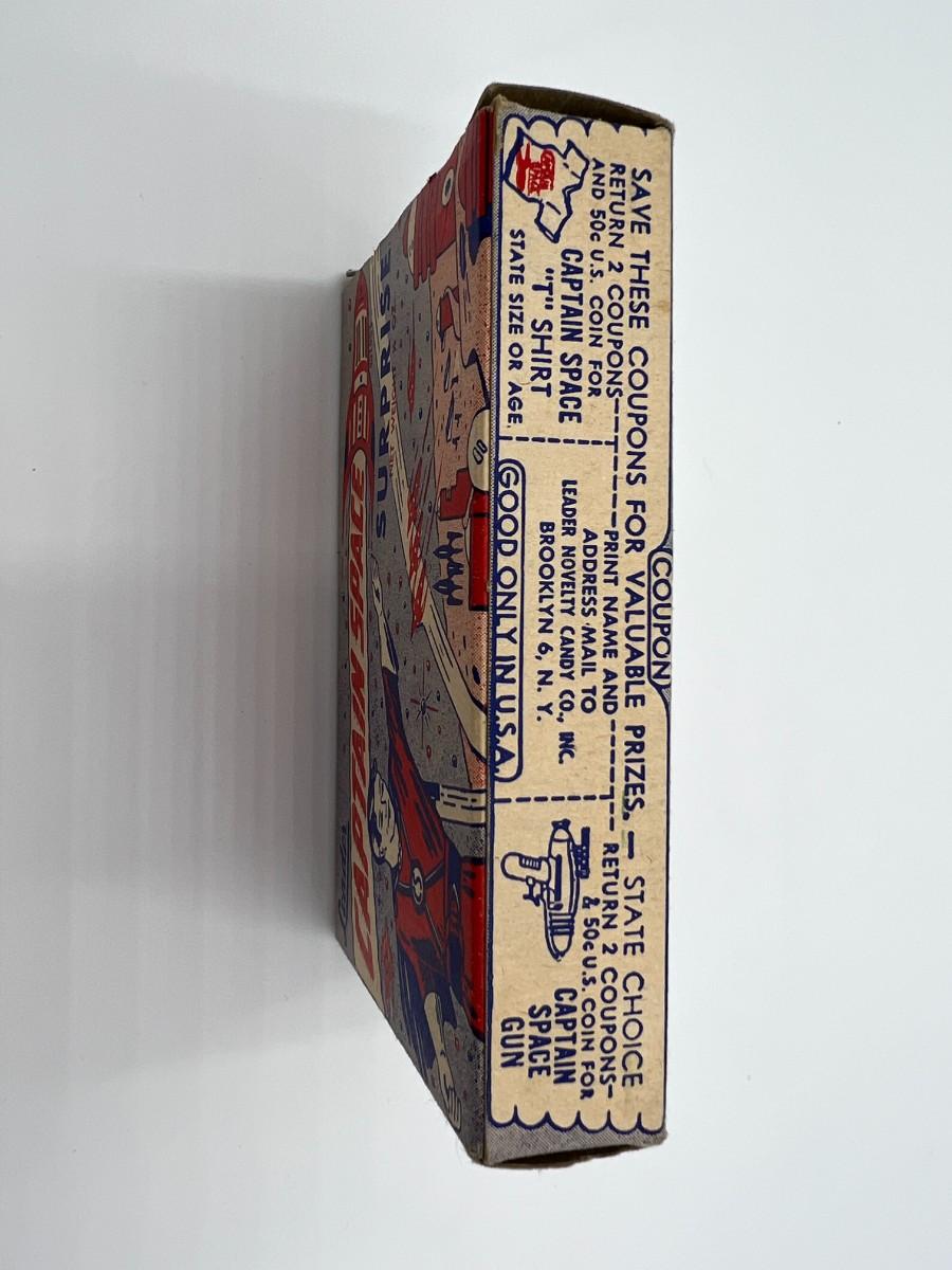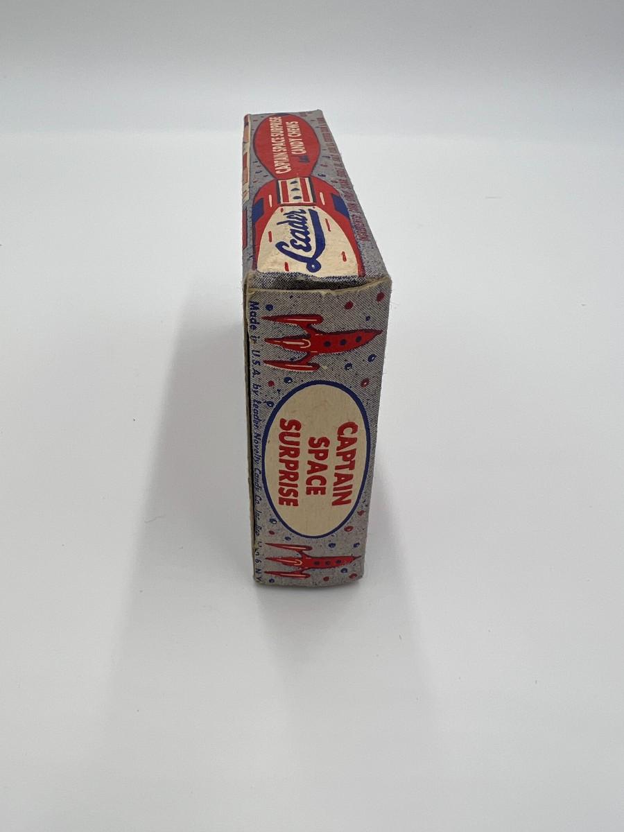 Extremely rare, you will never see one again. In very good condition (as shown). A 1951 box of Leader Candy Chews featuring a Captain Space Surprise! Wonderful blue and red colors, and shows a scene of Captain Space fighting in a space battle of some kind. U.S.A. Leader Novelty Candy Co N.Y.