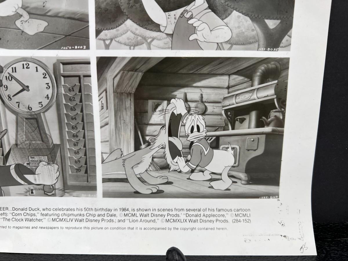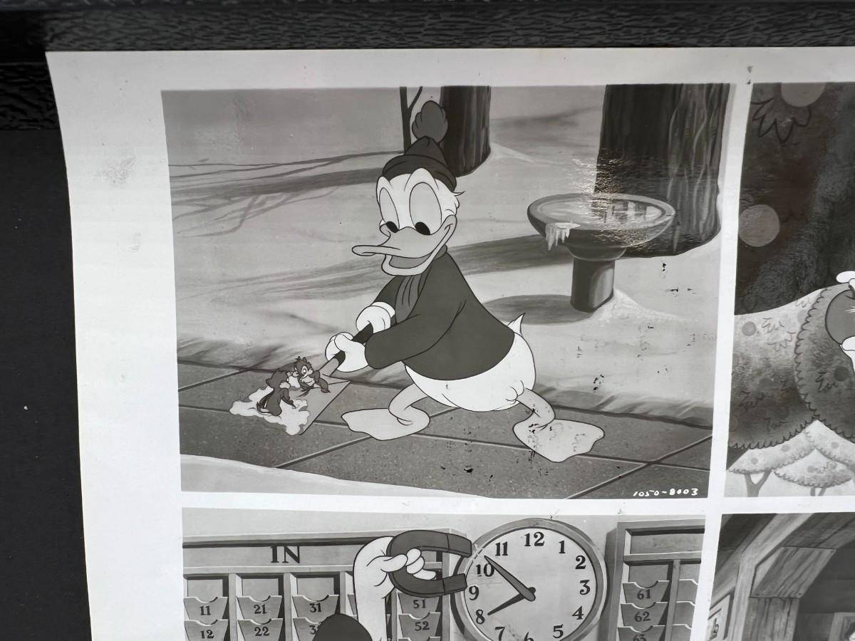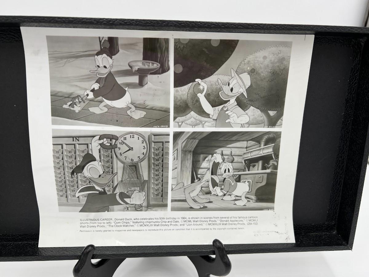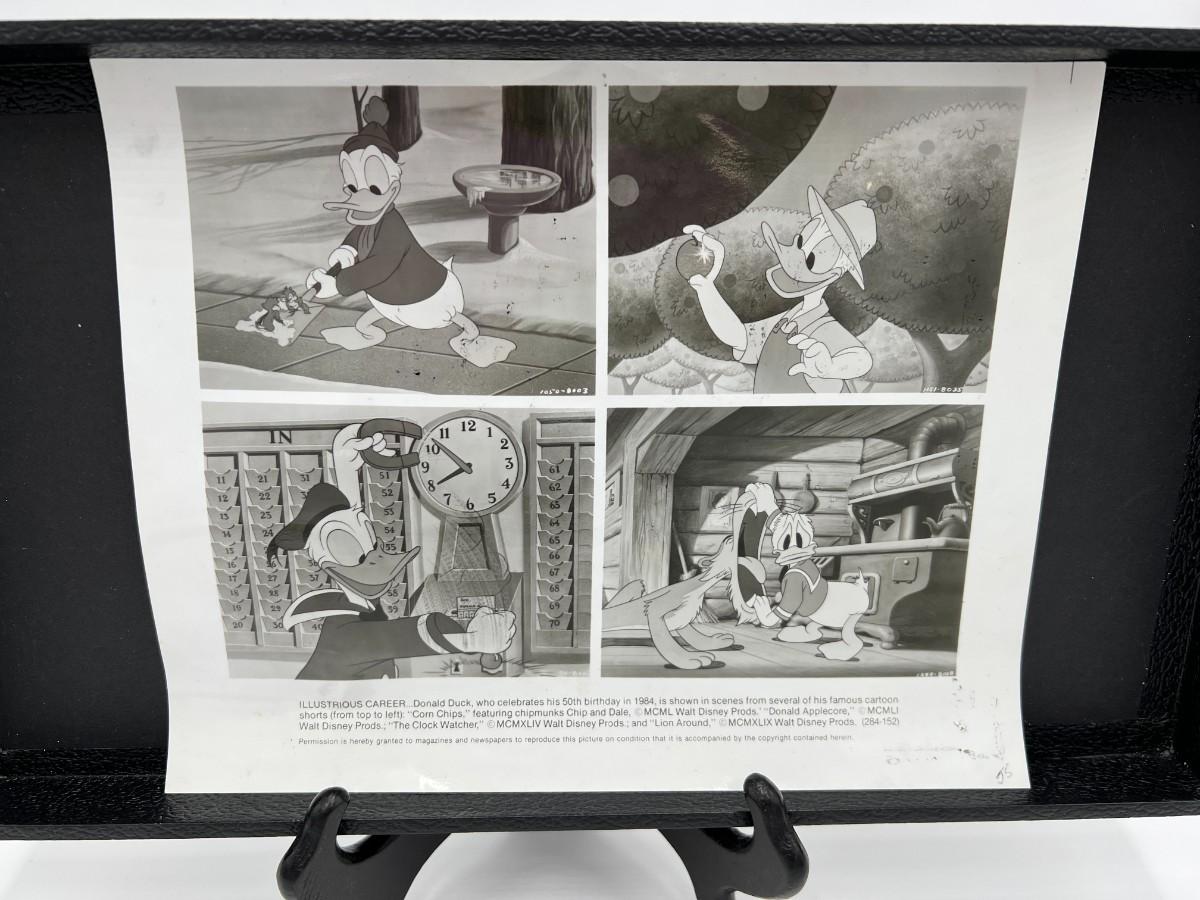 Very Rare Disney Donald Duck Animated Stills Autographed by Bill Justice and Clarence Nash. Features four Donald Duck still frames from his famous scenes (there's some visible surface transfers from something, shown in photos), and a hand drawn sketch of Donald Duck signed by Bill Justice on the back. Says, "Our Best Wishes to Jim". Dated in 1984. Condition as shown.