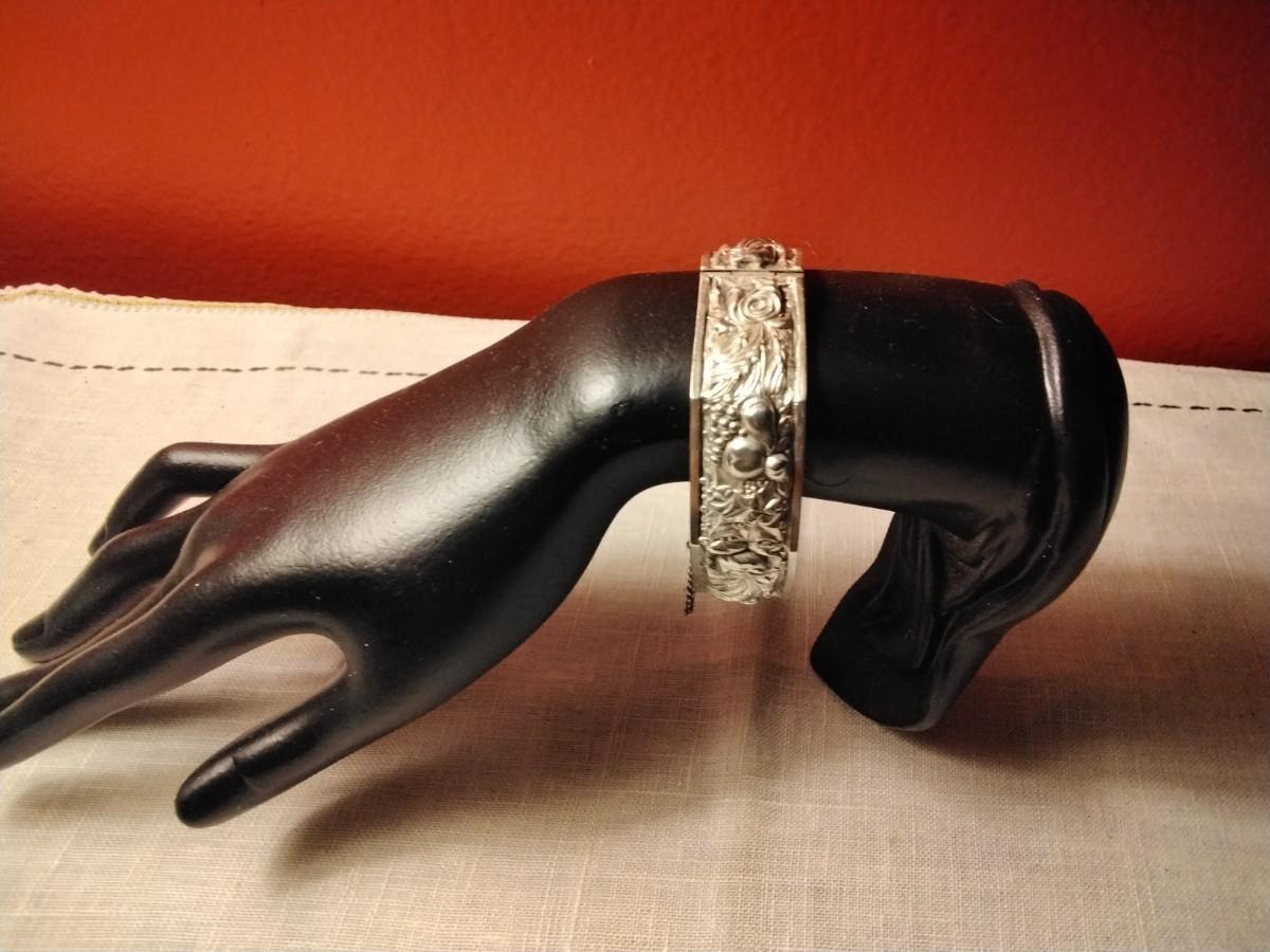 VERY RARE!! ROSAS DE PORTUGAL Silver Repousse Roses and Fruit Bangle Bracelet Circa 1940