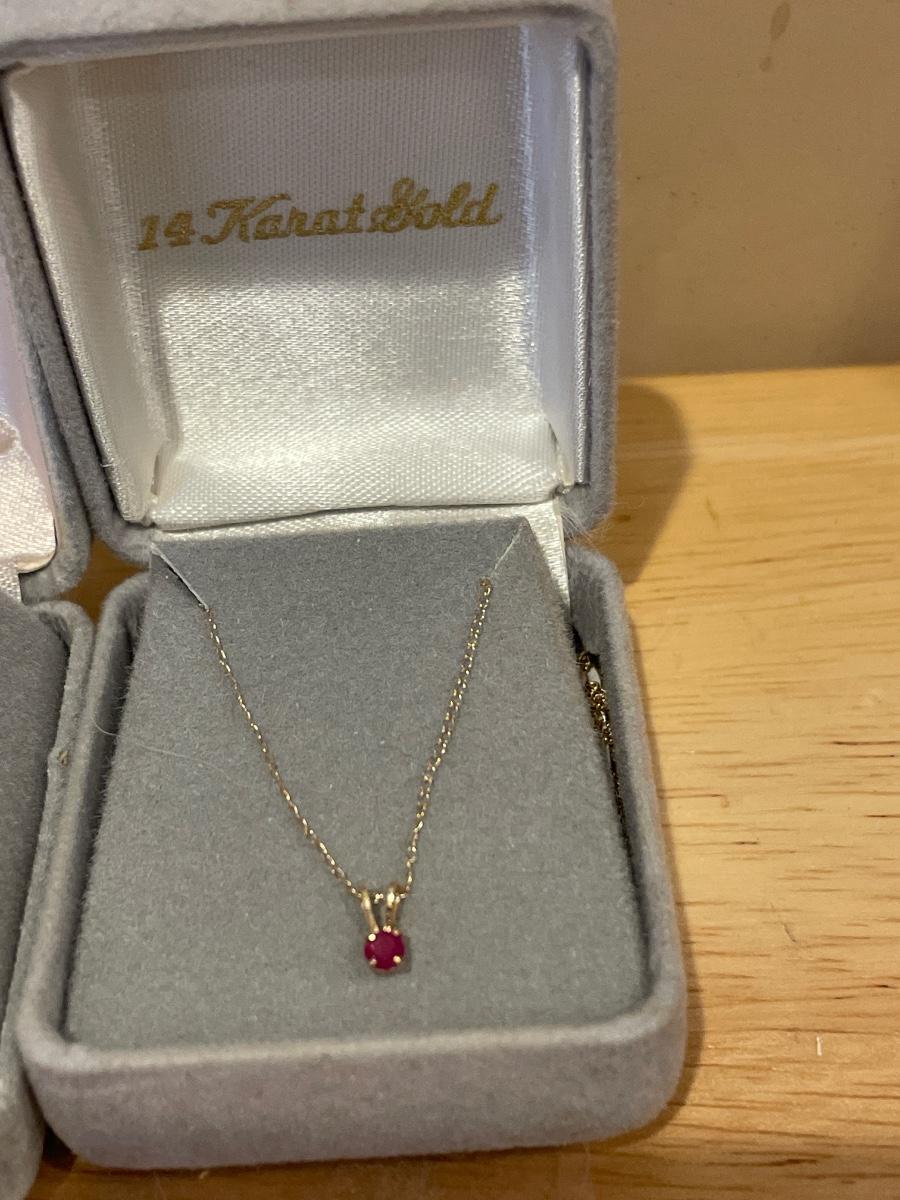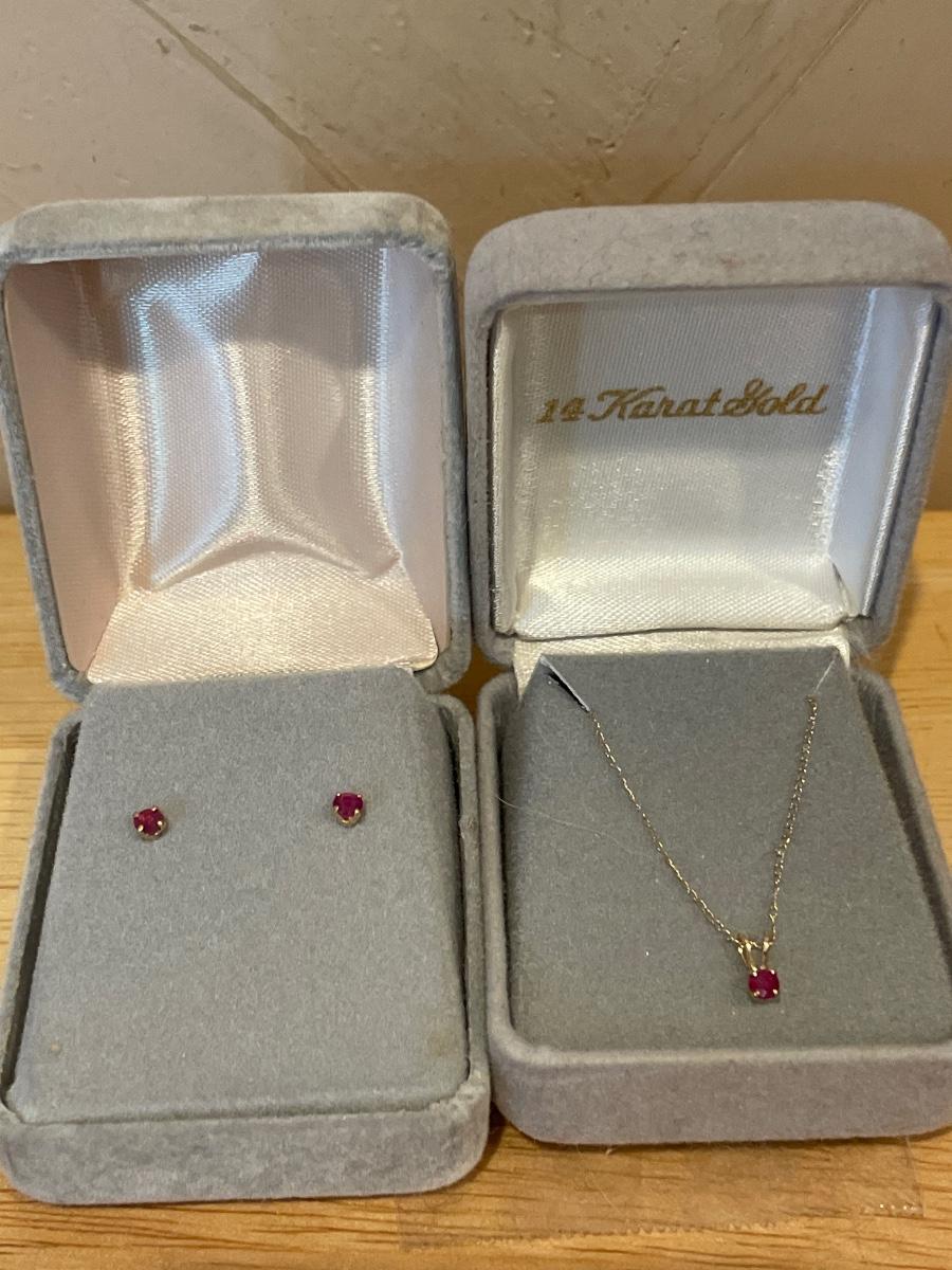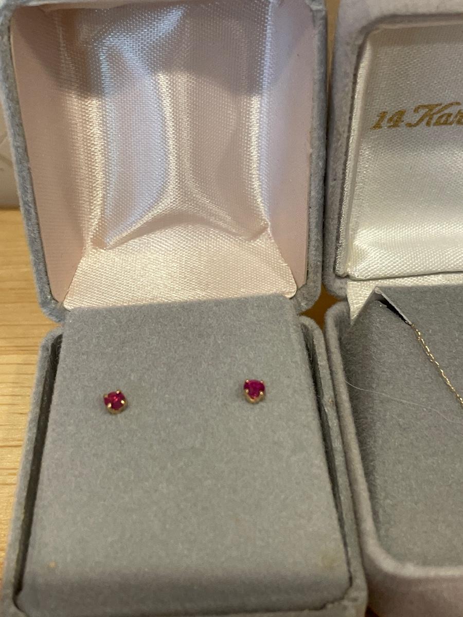 Very small pink stone 14k necklace and earrings