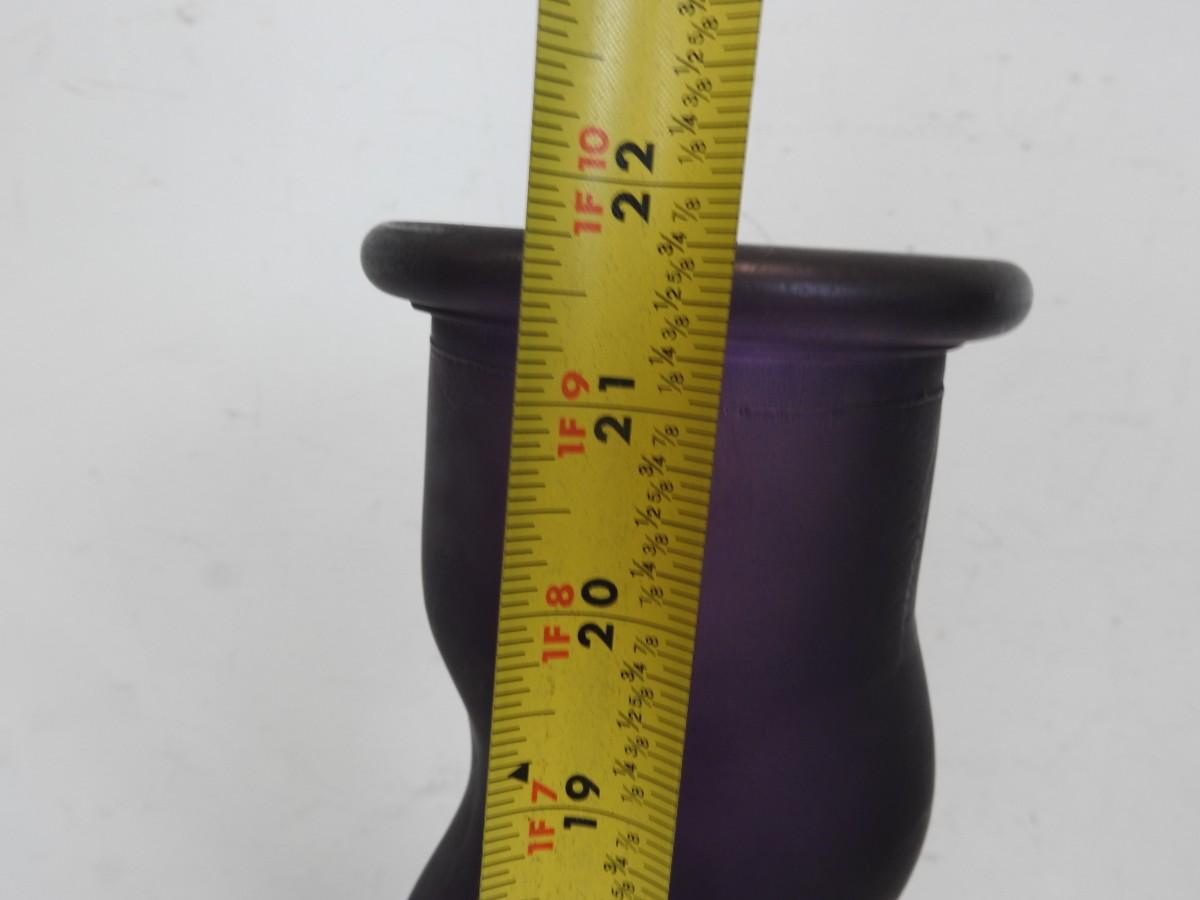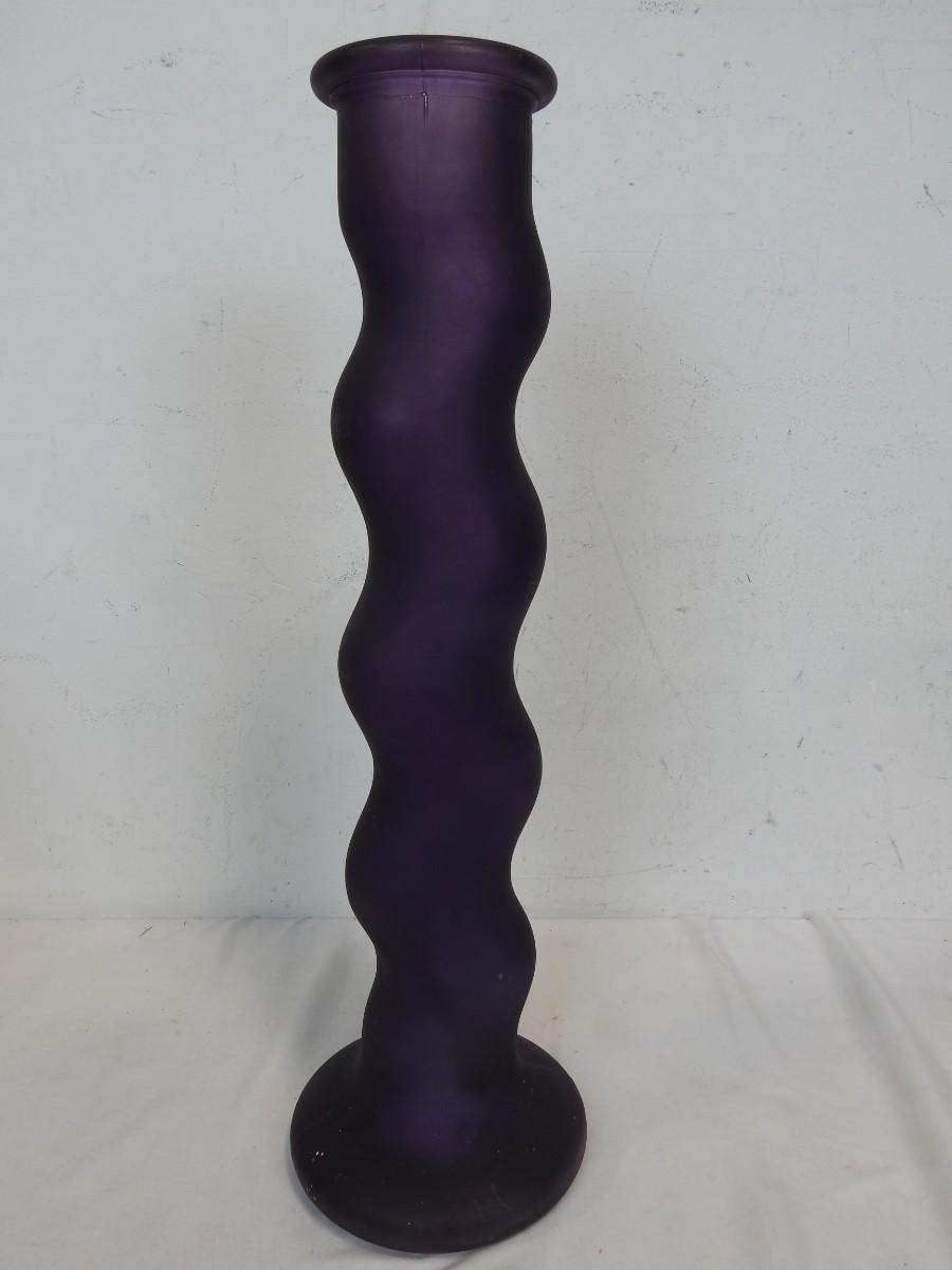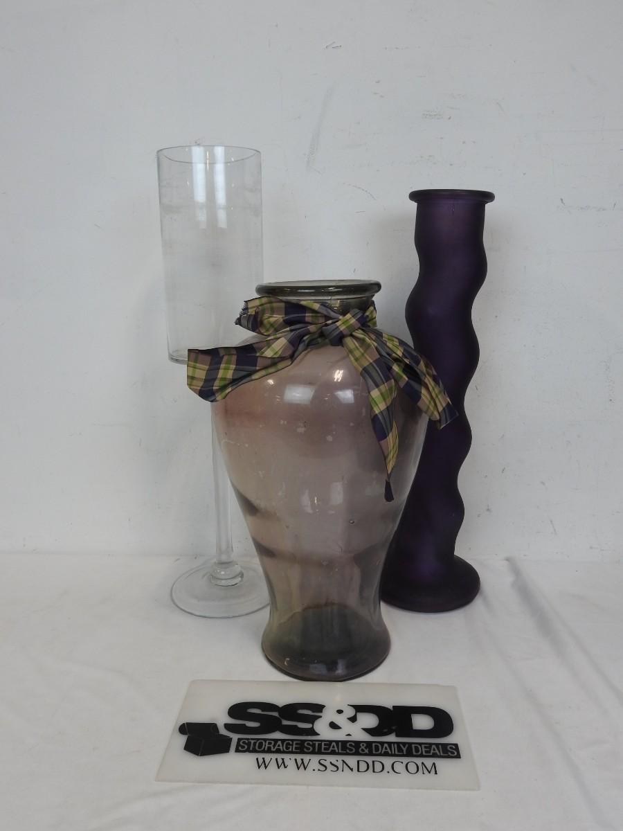 Very Tall Glass Vases: Clear: 24in, Purple: 21 3/4in, Clear w/Bow: 17 3/4in