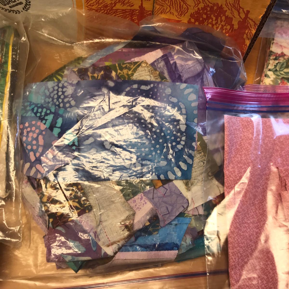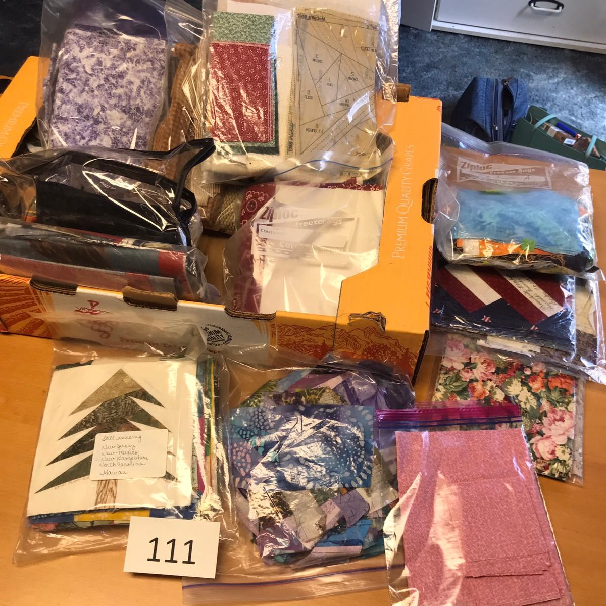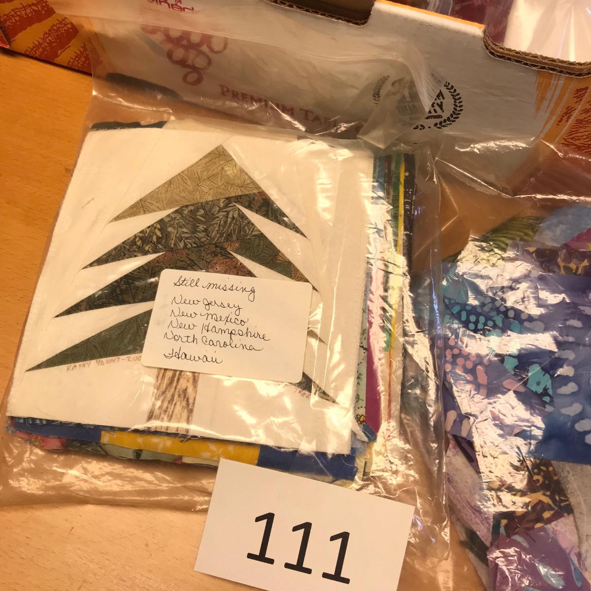 These are all finished blocks. Sandra said that this was a project in which patterns were picked. They each made different patterns and then mailed them to each other. These are from all over the world! It was a quilt that she never got put together. The blocks are all in baggies; no smoking issues!