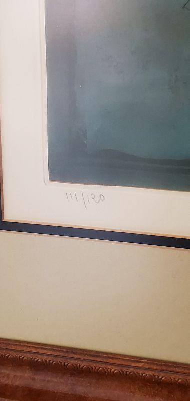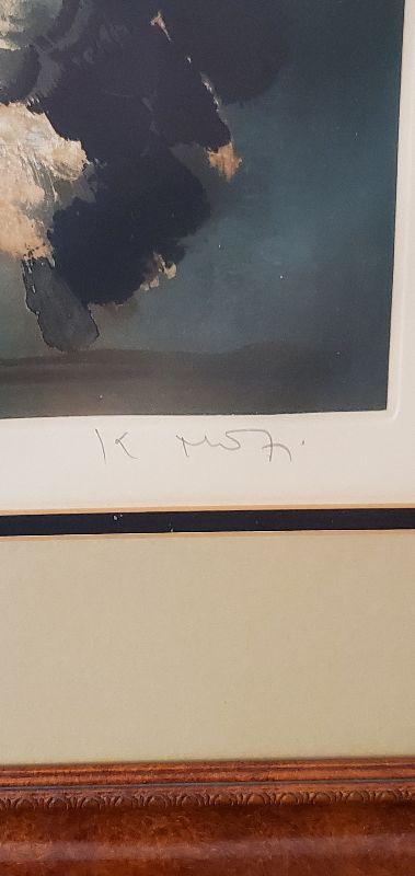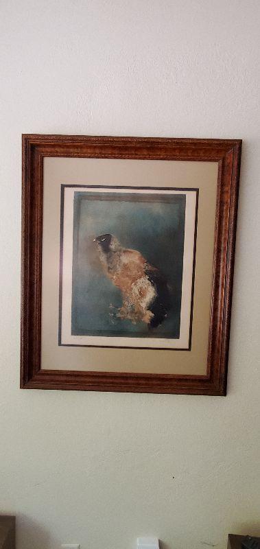 Original Aquatint Etching by Kaiko Moti (Bombay/Paris, 1921-1989). Titled "Golden Eagle." Pencil signed "K. Moti" lower right and numbered 111/120. Image measures 15.5" x 20.25", overall with frame it measures 30" x 36". Valued at $3500!