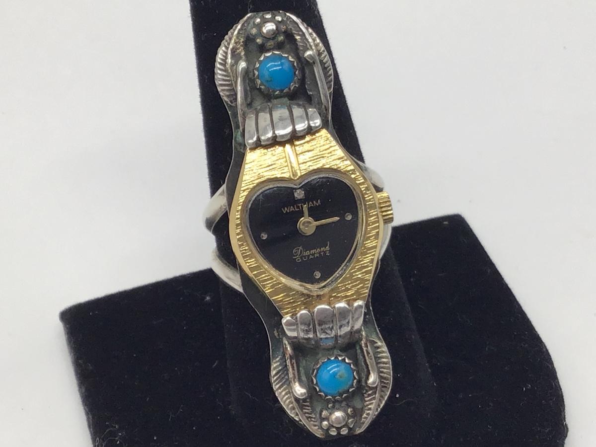 Very Unique Signed Rus Sterling Silver Turquoise Ring With Vintage Waltham Diamond Watch