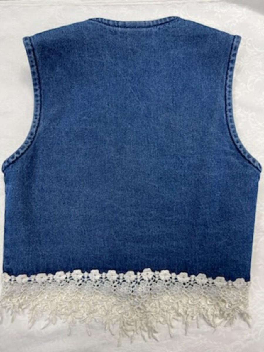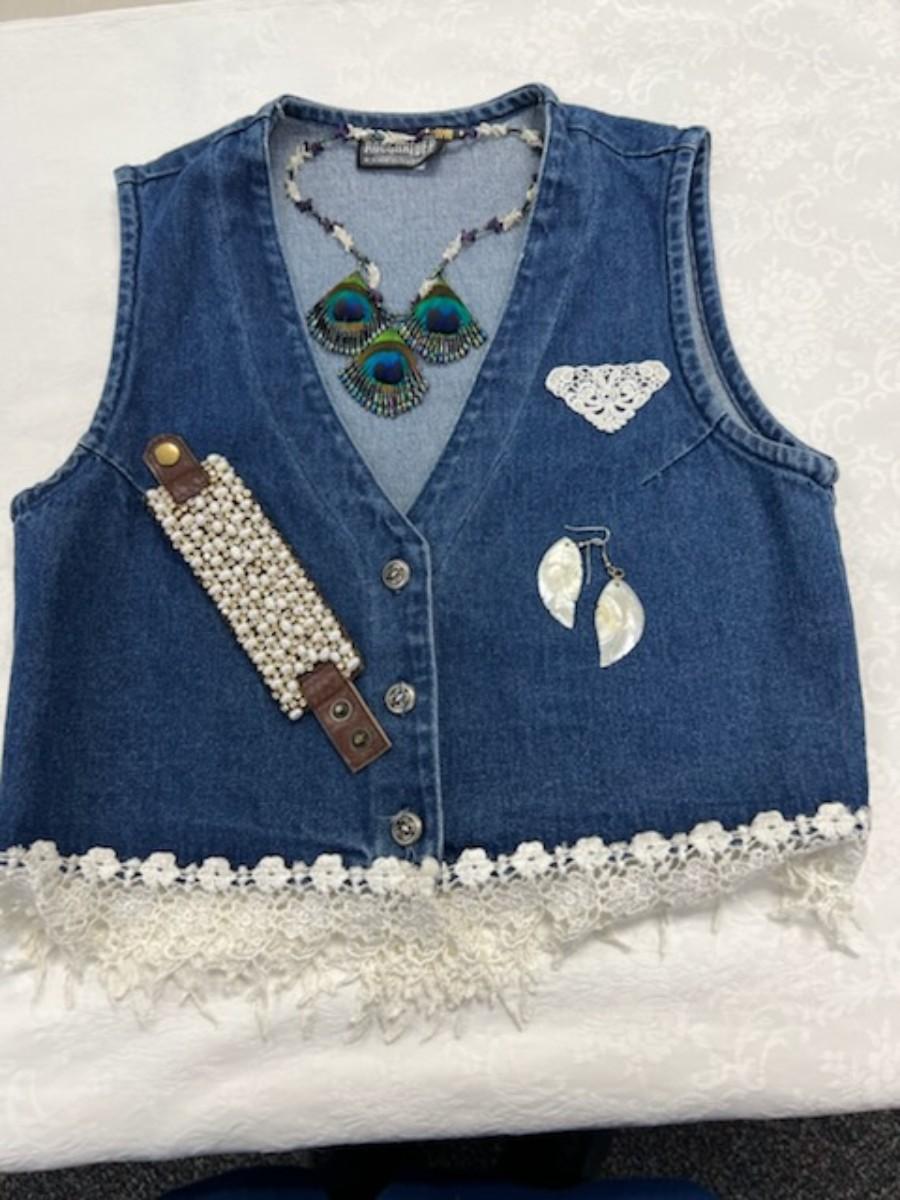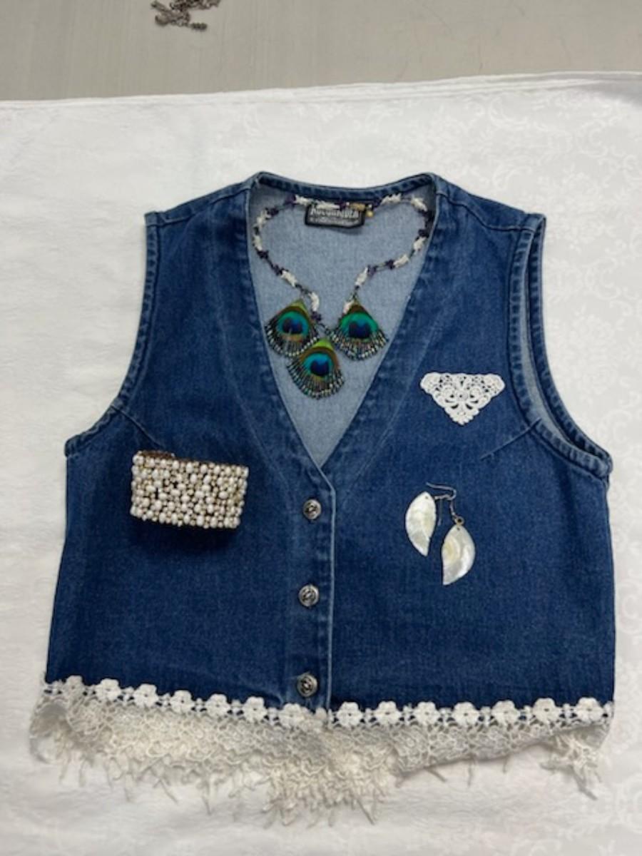 Small denim and lace blue vest, Peacock feather necklace with pearl shells, MOP Shell earrings, and a fun snap closure cuff with pearls and rhinestones. The cuff has 2 snap closures giving you a choice for the sizing.