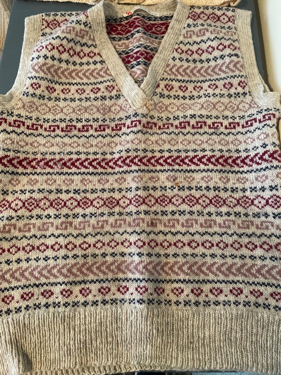 Monies med Knut vest. Appears to be had knit cream color sweater