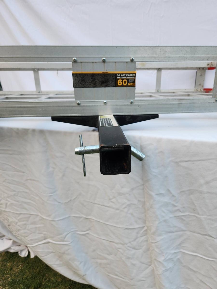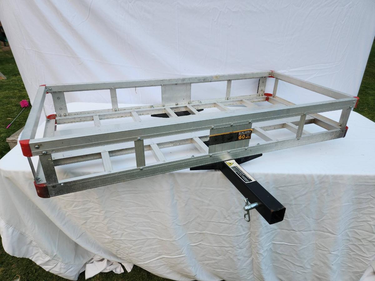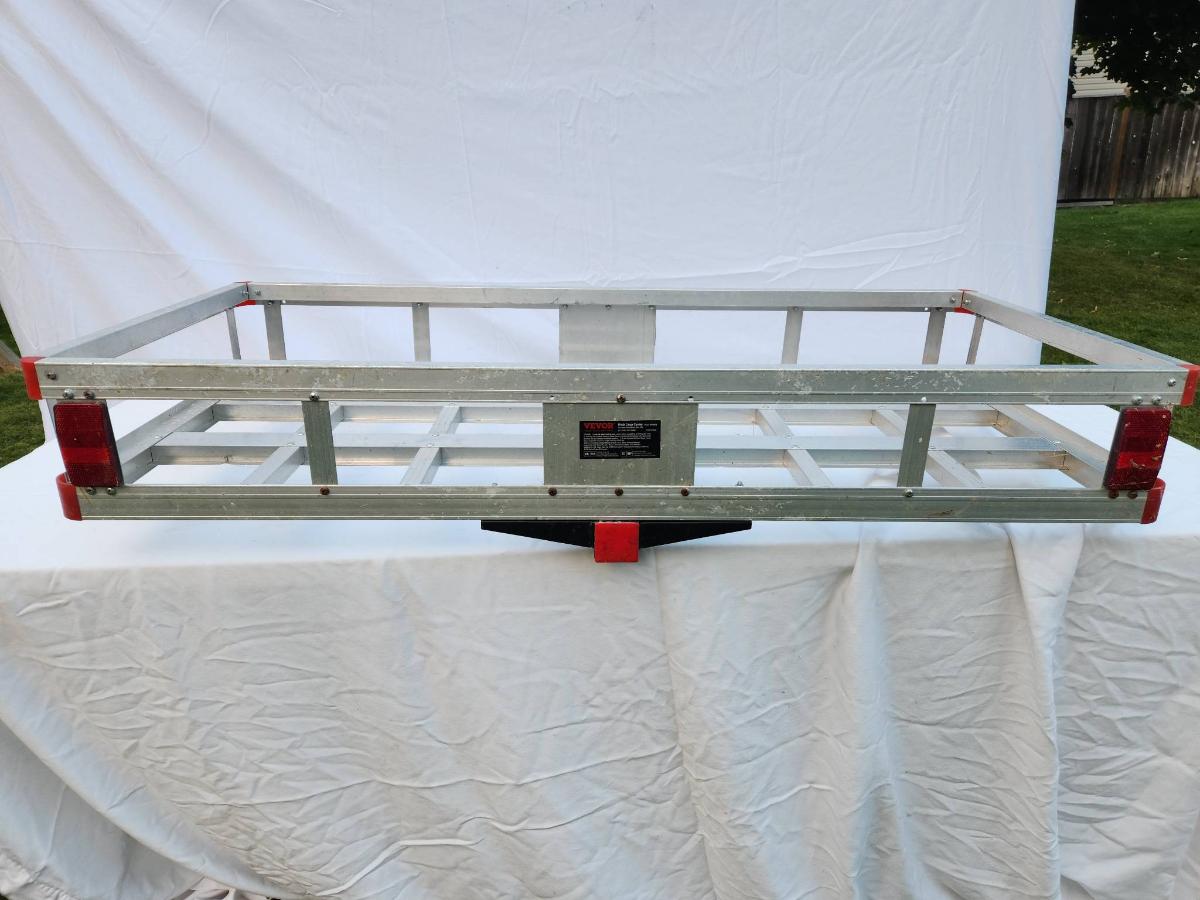 Vevor hitch cargo carrier made from durable aluminum with a 60-inch platform. Designed for vehicles with a standard 2-inch receiver, this cargo carrier features a lightweight, corrosion-resistant frame with reflective elements for safety. Suitable for transporting additional cargo. Good visible condition with attachment hardware included.