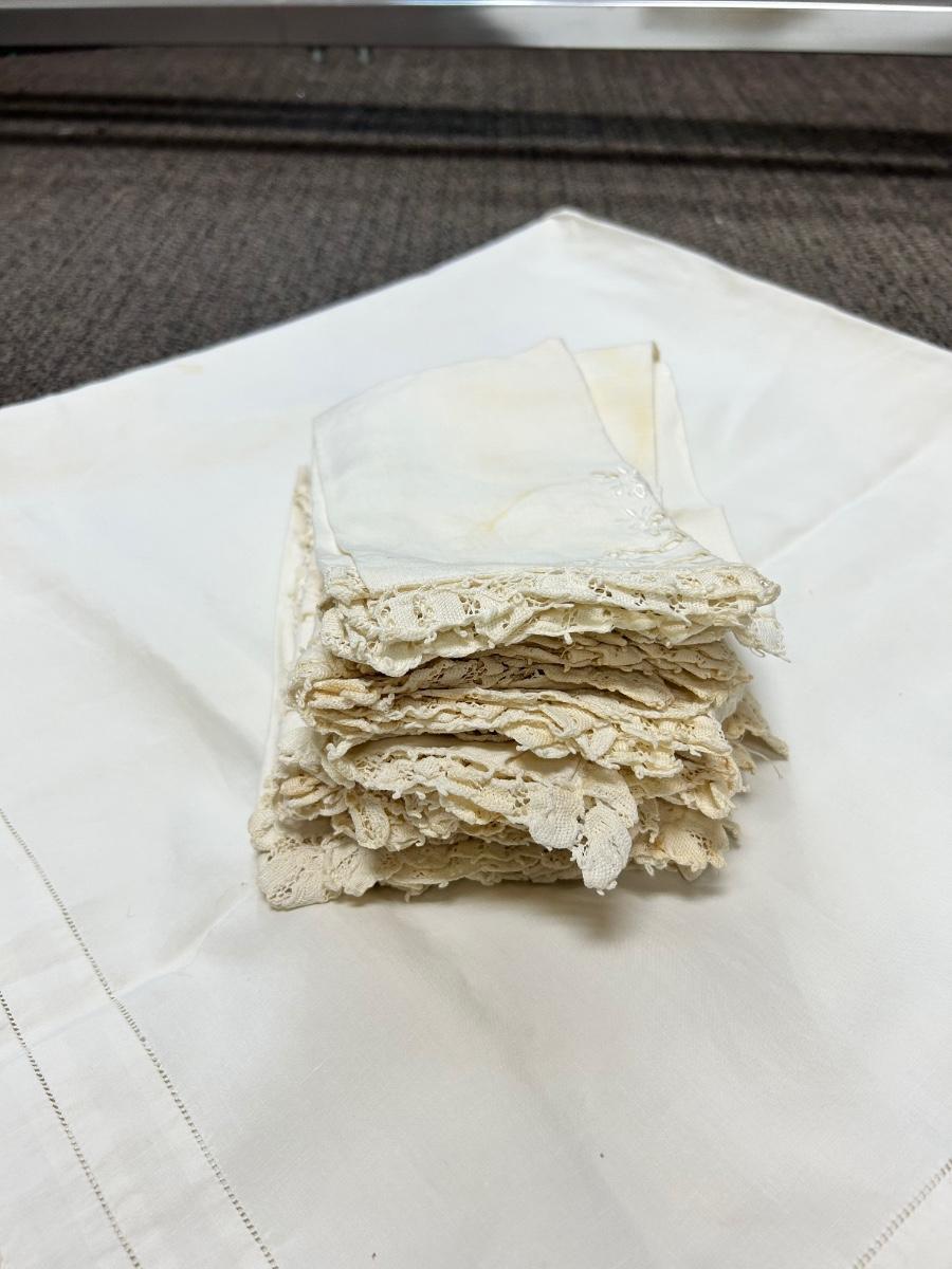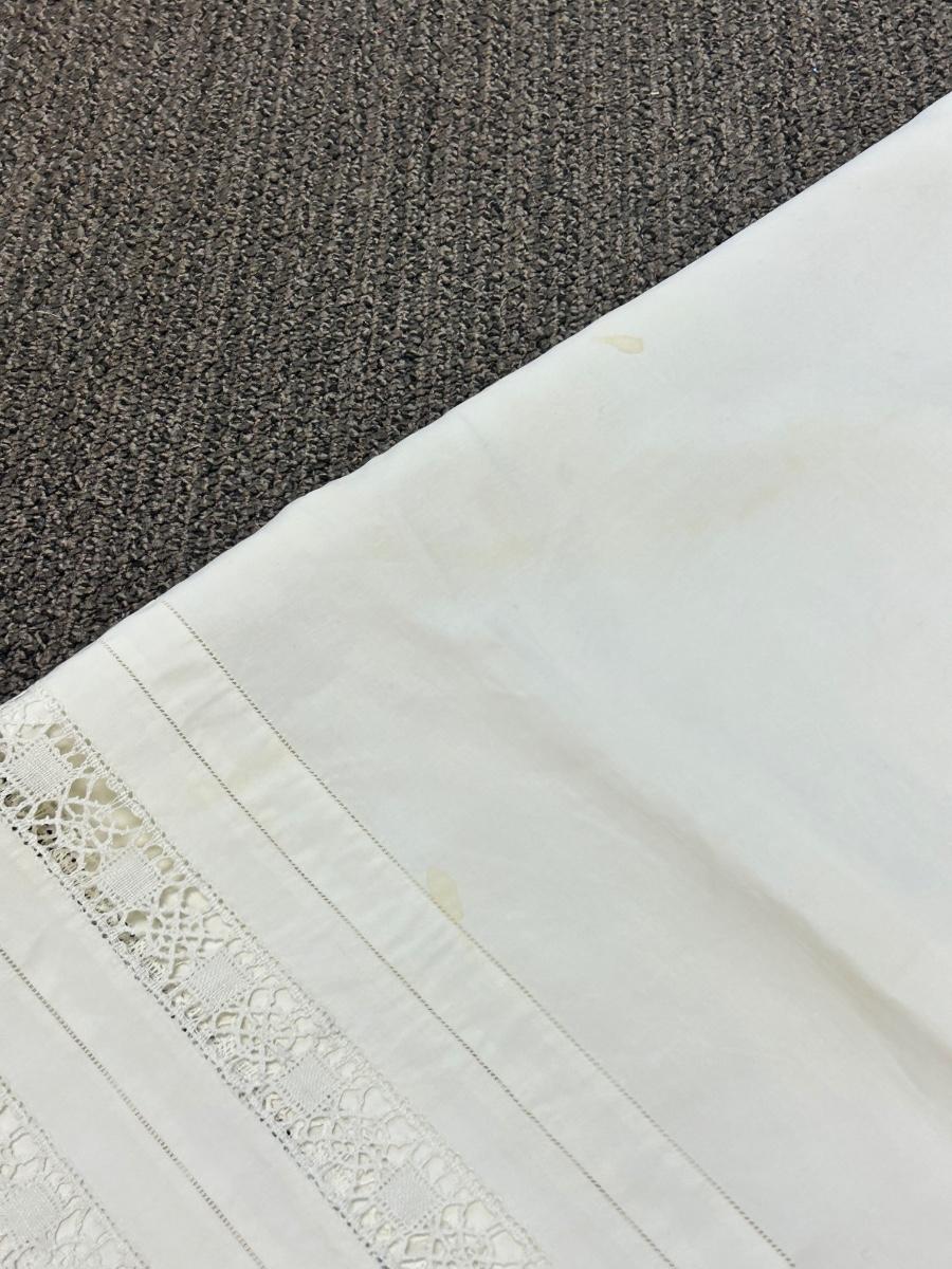 Vintage Lace Edge White Cotton Tablecloth with Dinner Napkins. About 4' square tablecloth. In vintage condition with some discoloration. and light spotting.