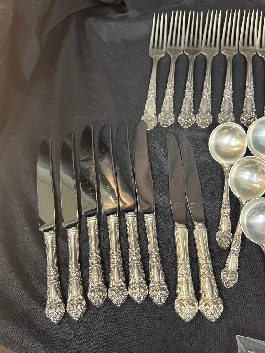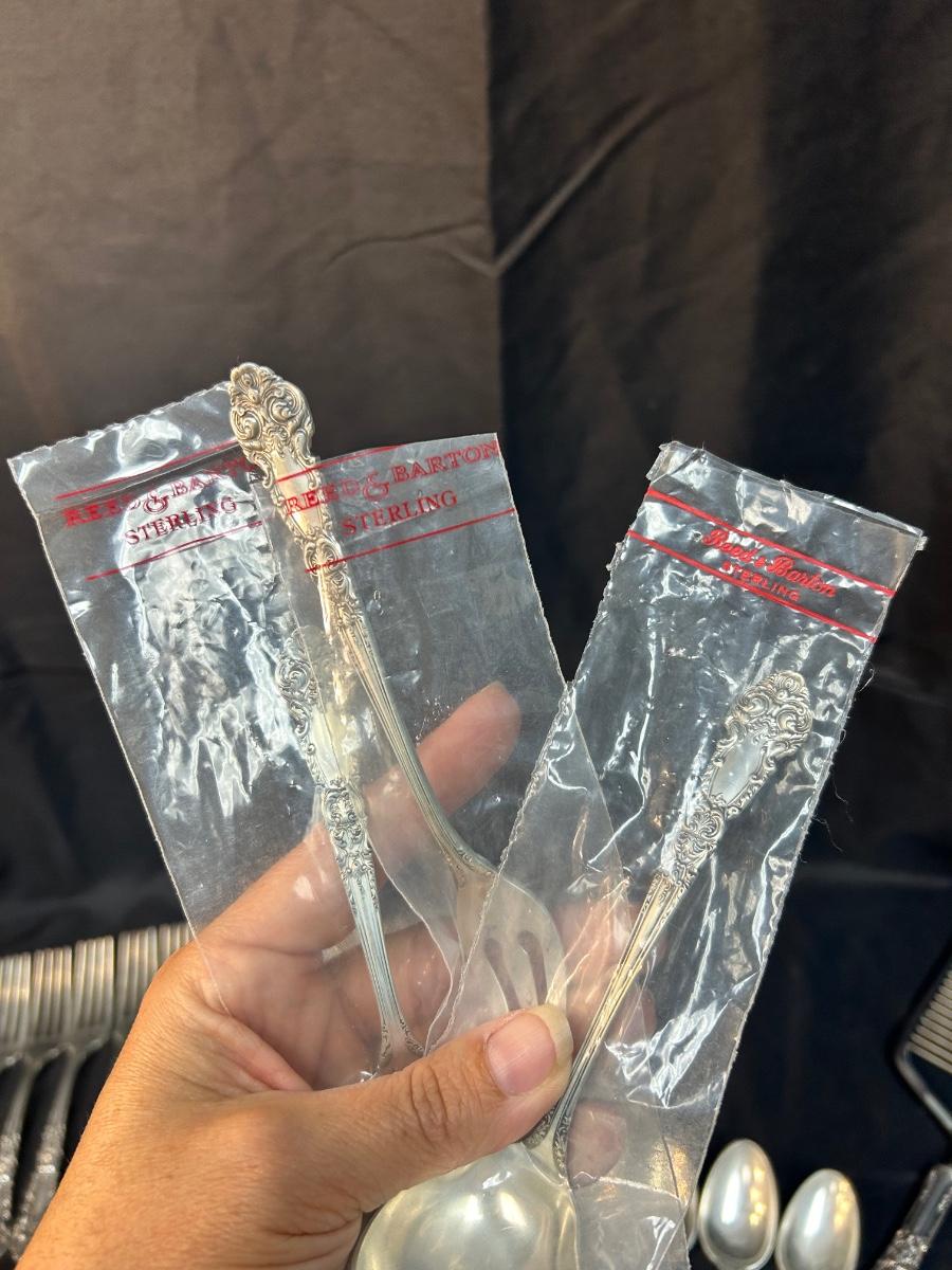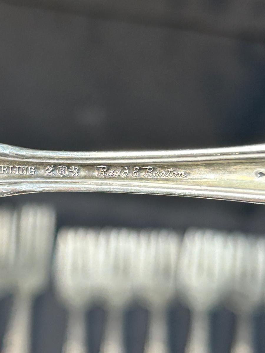 Vintage Reed & Barton Sterling Silver Flatware Set Service for 6 with Serving Pieces and Wood Storage Box. Heavy sterling silver flatware. Service for 6 with a couple extras. Setting includes dinner knife, dinner fork, salad fork, soup spoon, teaspoon, and butter knife. Hostess serving set, includes meat fork, two serving spoons, slotted spoon, slicing fork, lemon fork, small ladle, ladle, and jelly spoon. French Renaissance pattern. Comes with cloth covers and display storage box. Flatware weighs approx. 2556g; hollow handle pieces weigh 872g.
