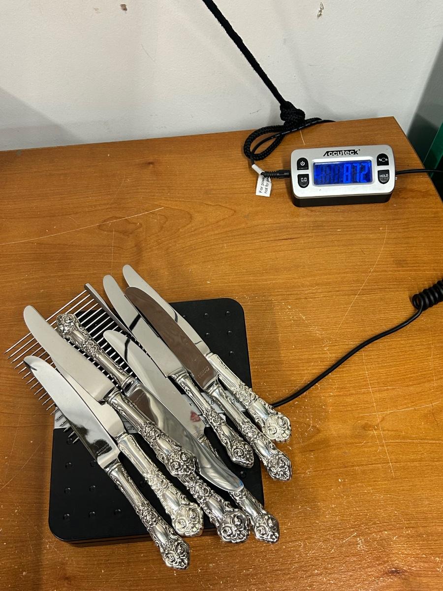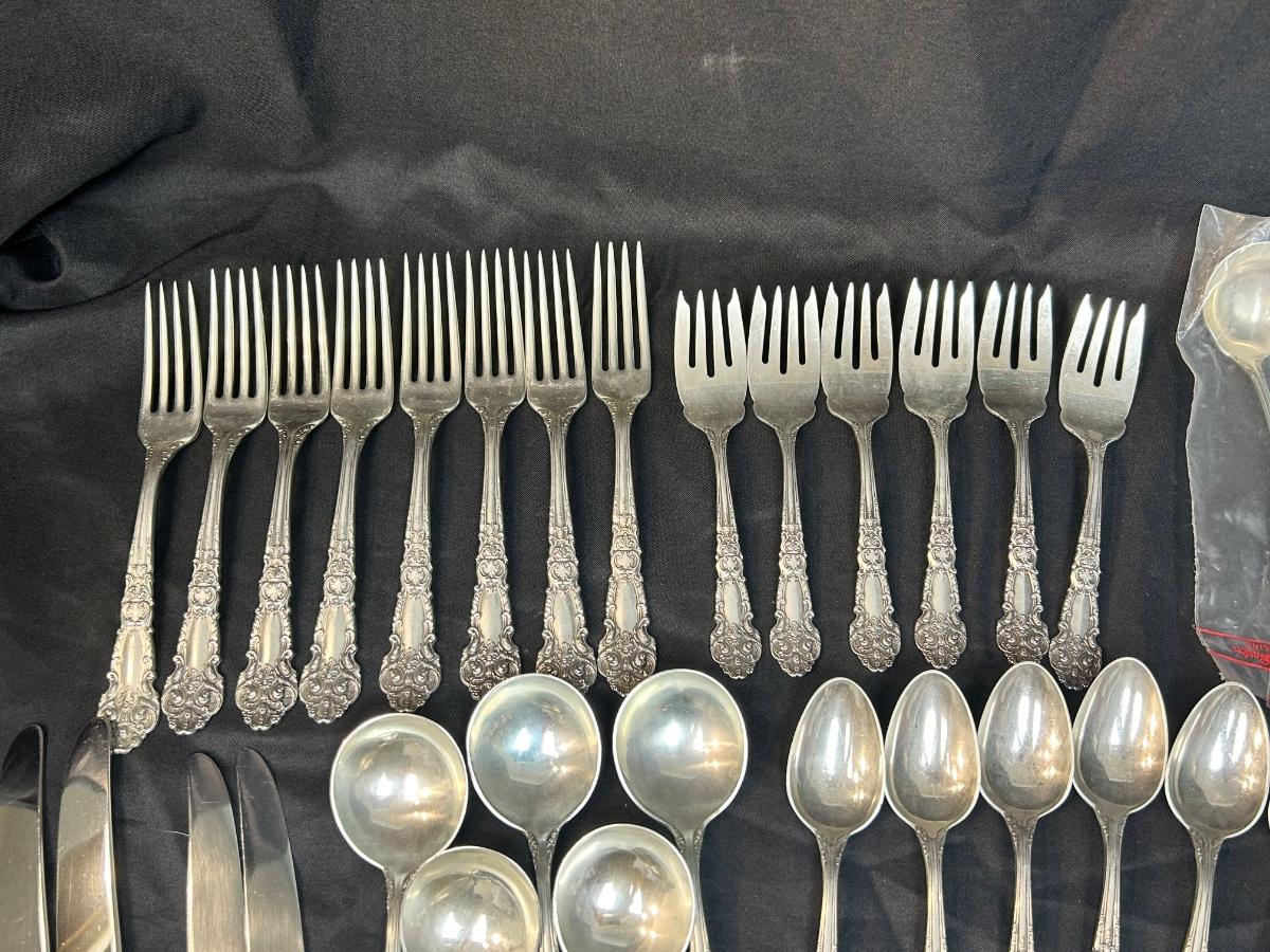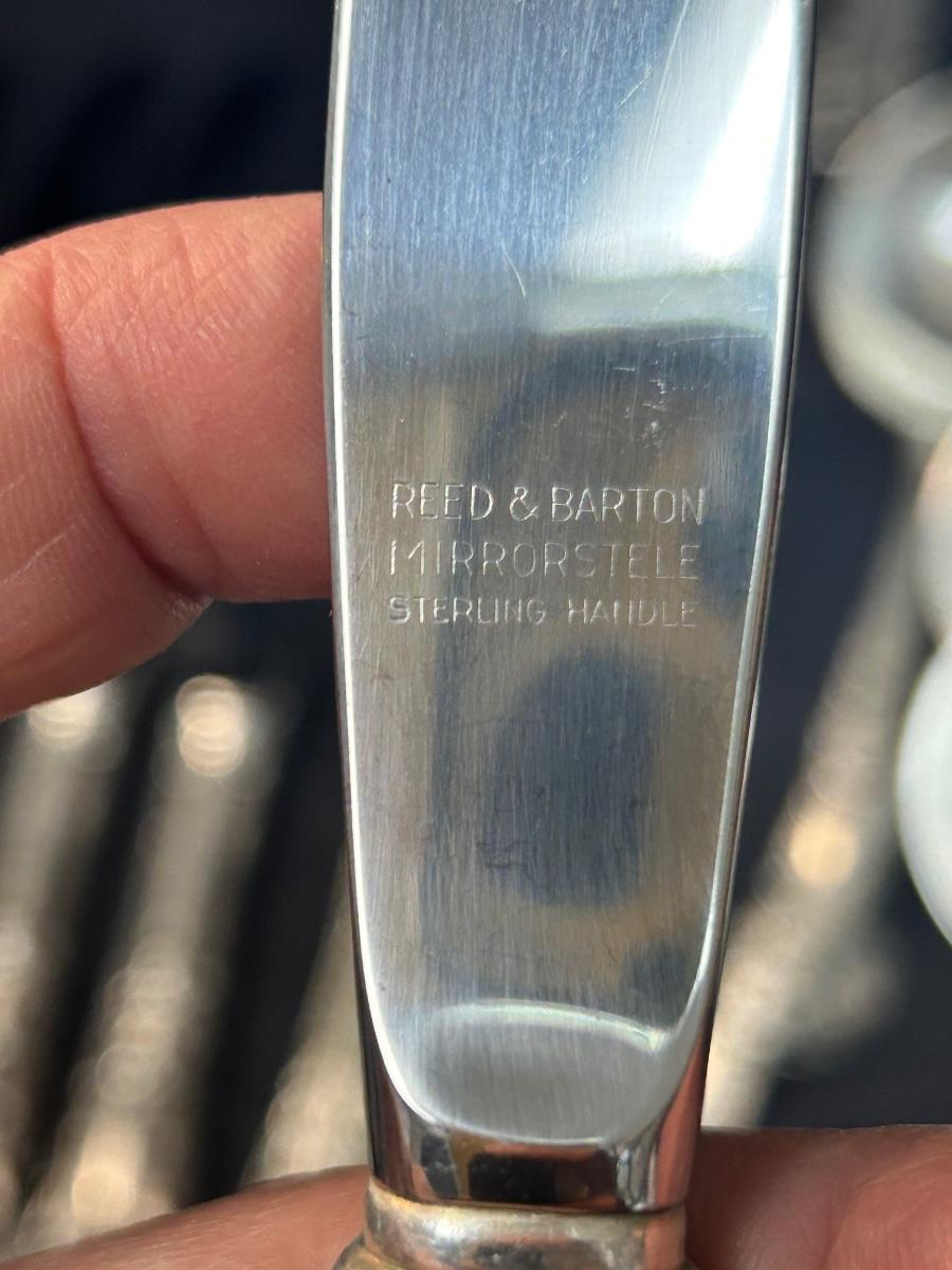Vintage Reed & Barton Sterling Silver Flatware Set Service for 6 with Serving Pieces and Wood Storage Box. Heavy sterling silver flatware. Service for 6 with a couple extras. Setting includes dinner knife, dinner fork, salad fork, soup spoon, teaspoon, and butter knife. Hostess serving set, includes meat fork, two serving spoons, slotted spoon, slicing fork, lemon fork, small ladle, ladle, and jelly spoon. French Renaissance pattern. Comes with cloth covers and display storage box. Flatware weighs approx. 2556g; hollow handle pieces weigh 872g.