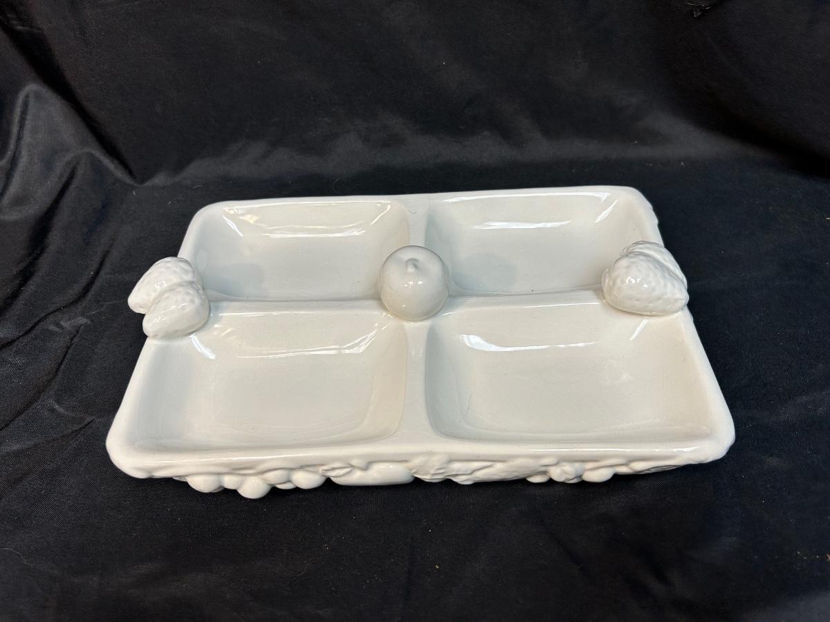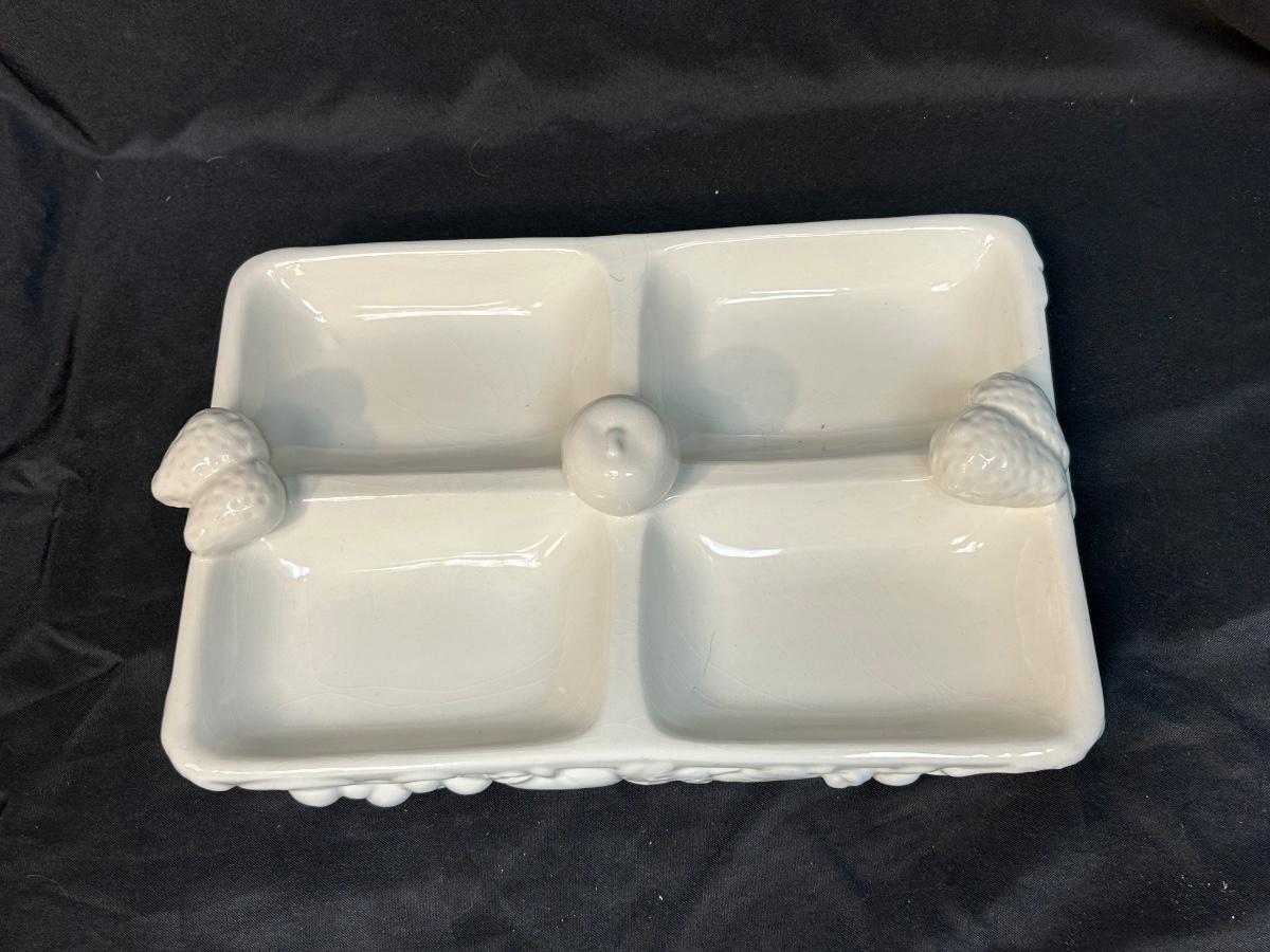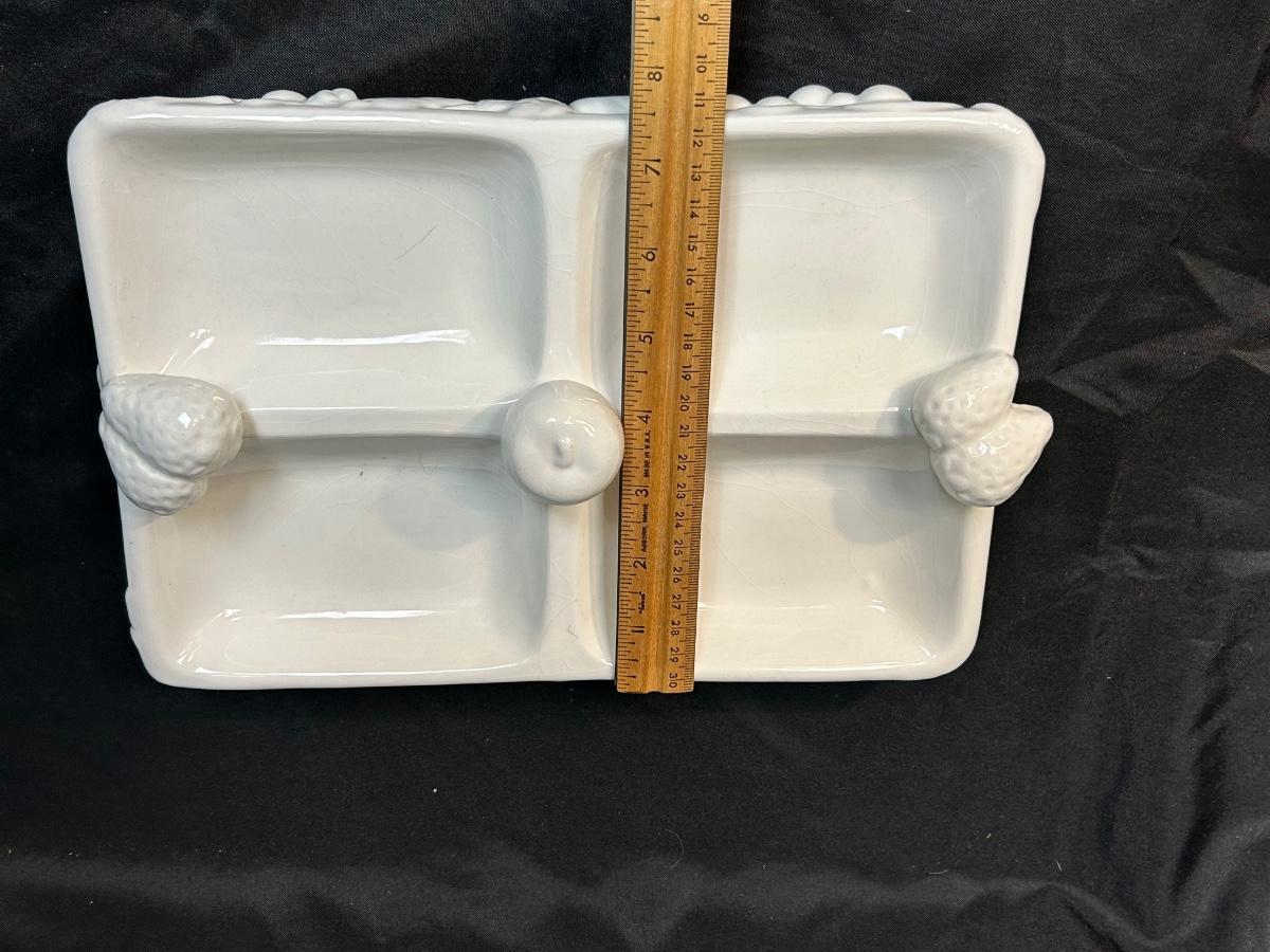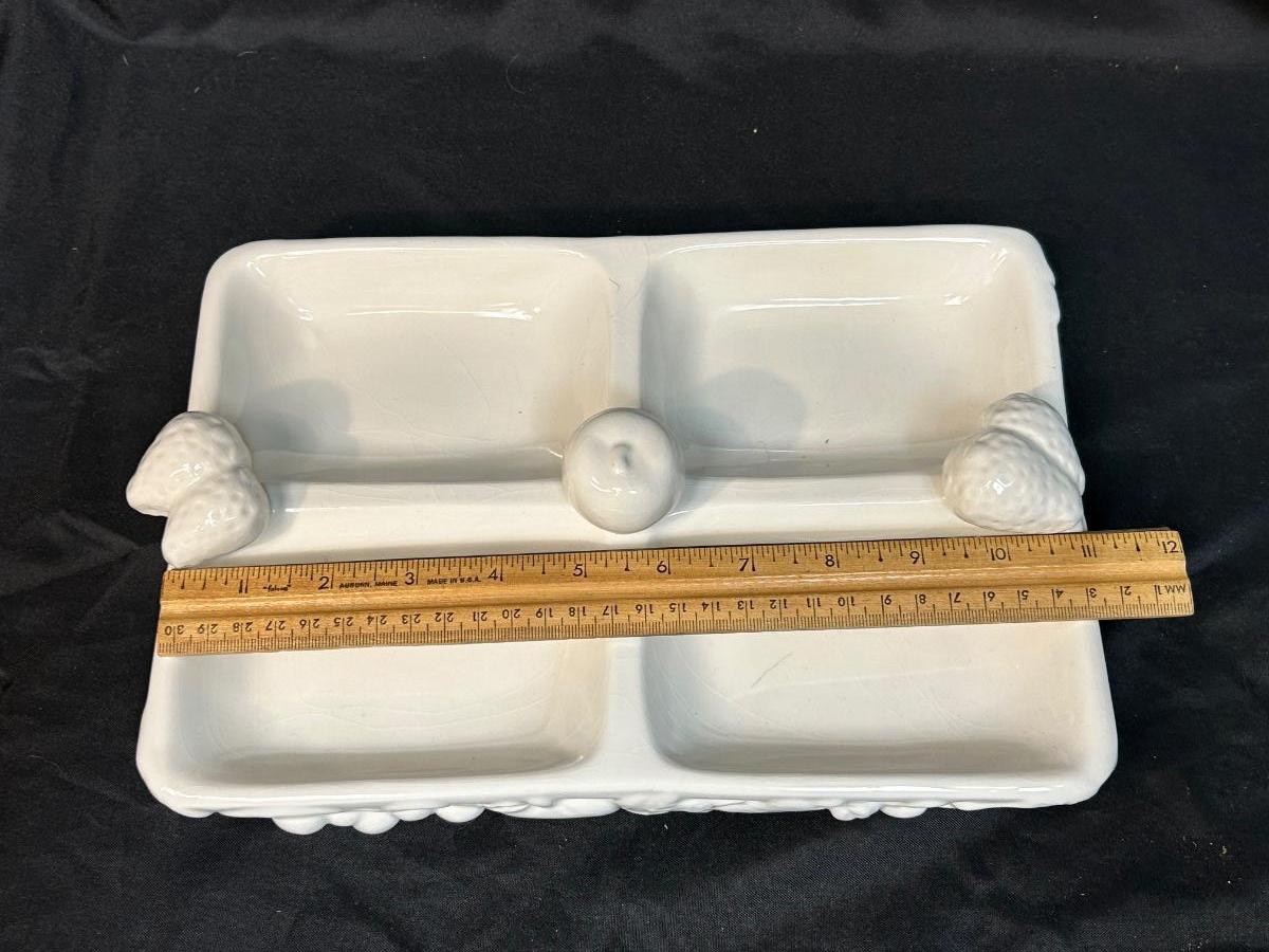 White Gibson Housewares Divided Candy Nut Condiment Dish with Berries. In fair condition. No chips but there is crazing.