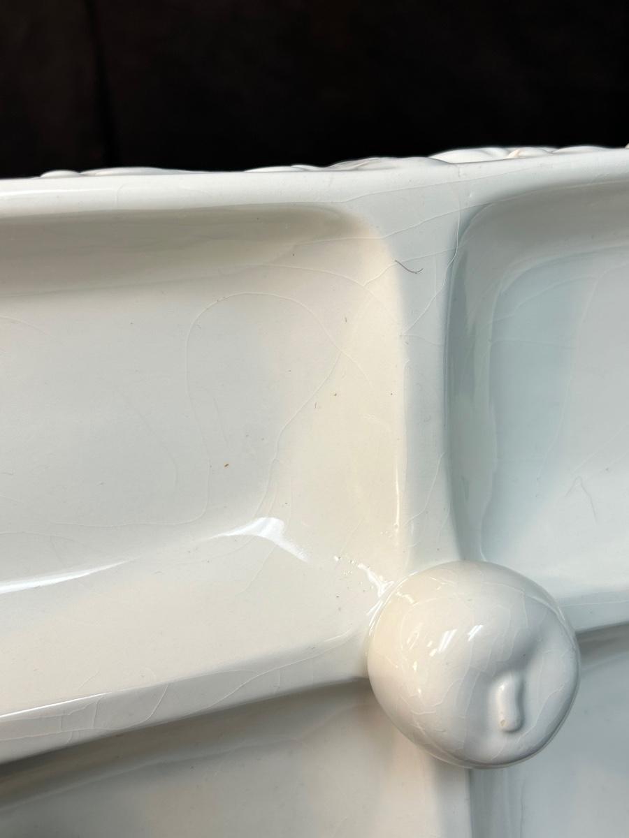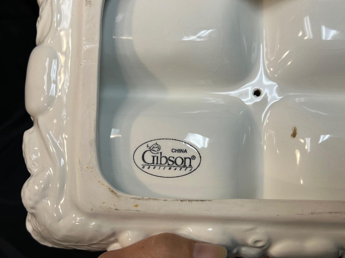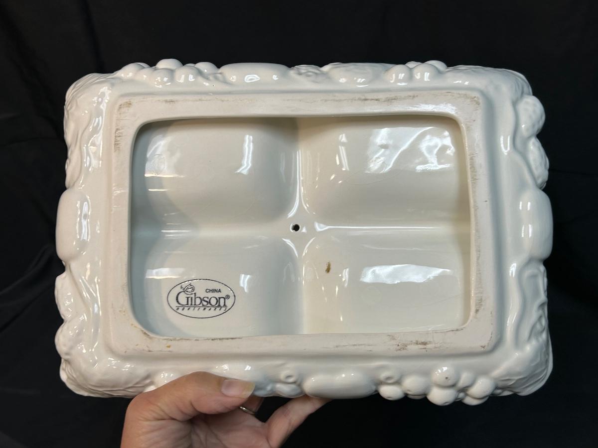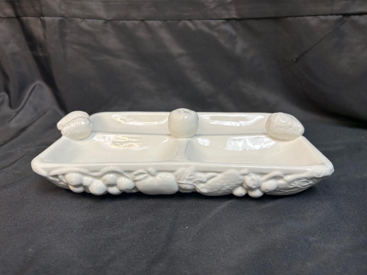 White Gibson Housewares Divided Candy Nut Condiment Dish with Berries. In fair condition. No chips but there is crazing.