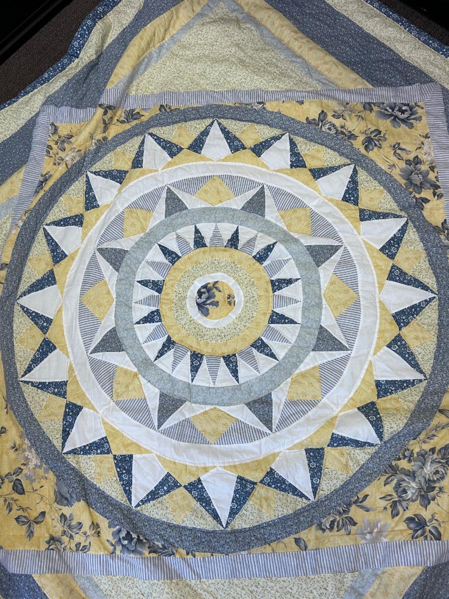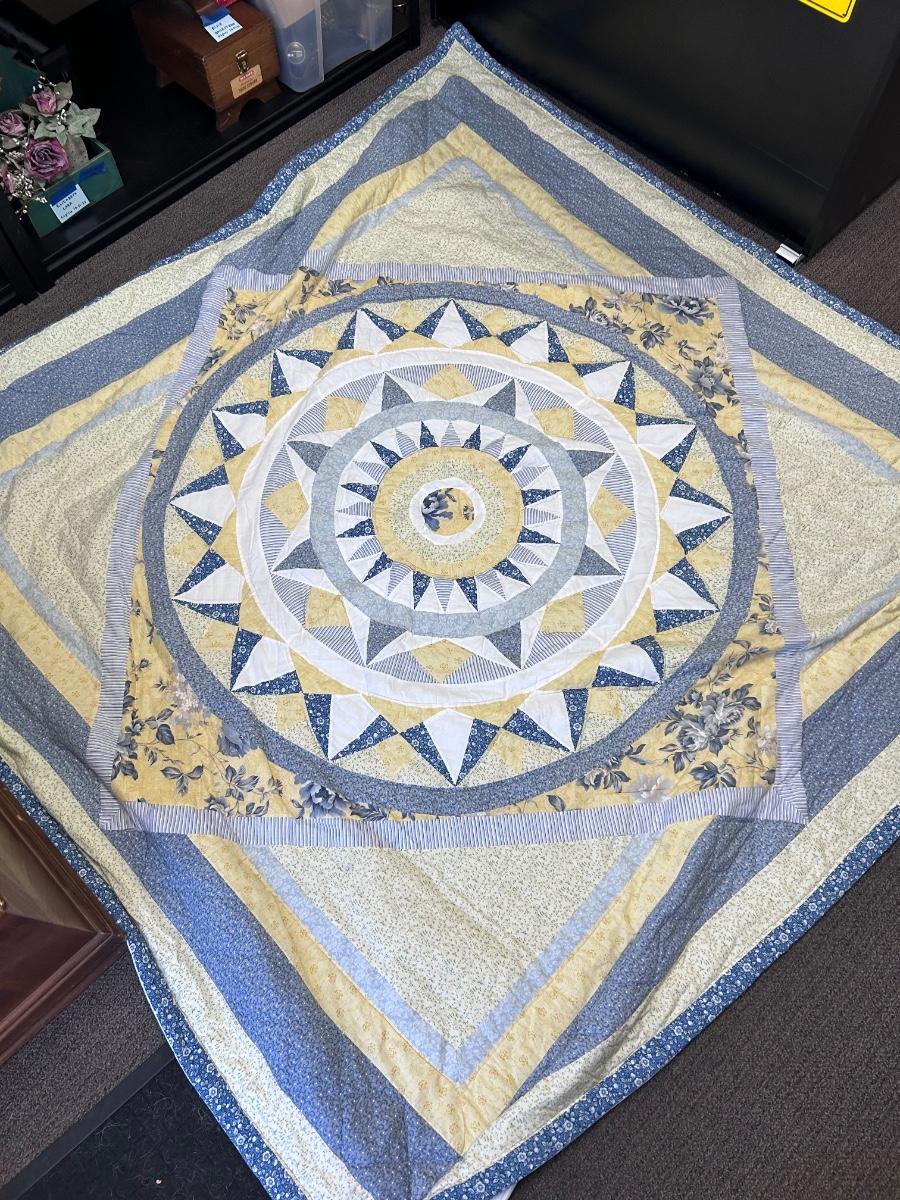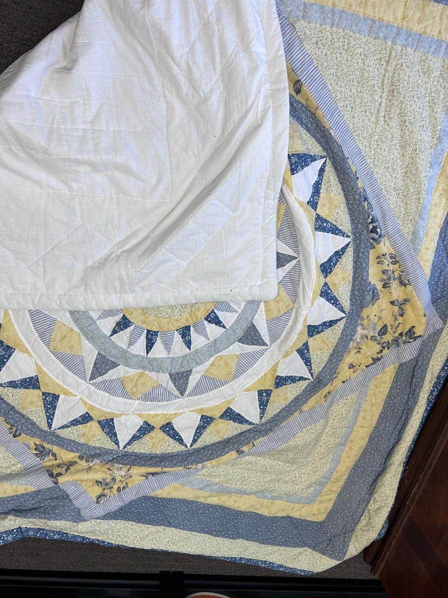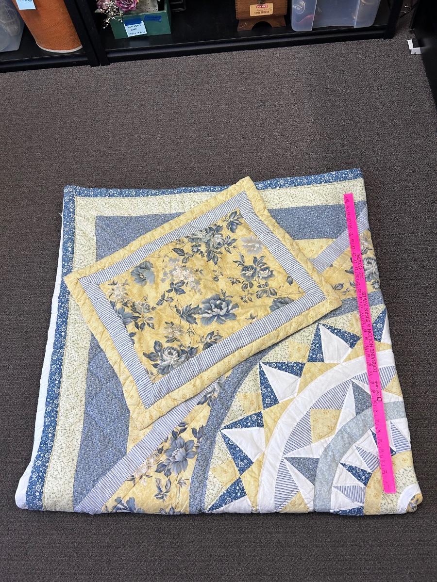 Yellow and Blue French Country Style Comforter Bedspread with Two Matching Pillowcase Covers. In good condition. Photo only shows one pillowcase, a second was found after the fact. No spots or stains noticed. About 6'x6' size.