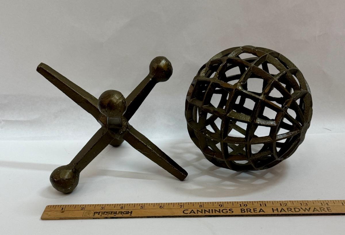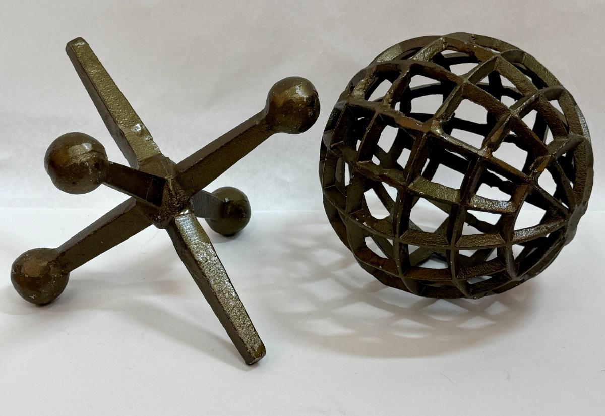 Mid-century style cast iron open-lattice globe and jack sculptures. Jack is approx. 10" long, globe is approx. 7" across. Both in good, solid condition.