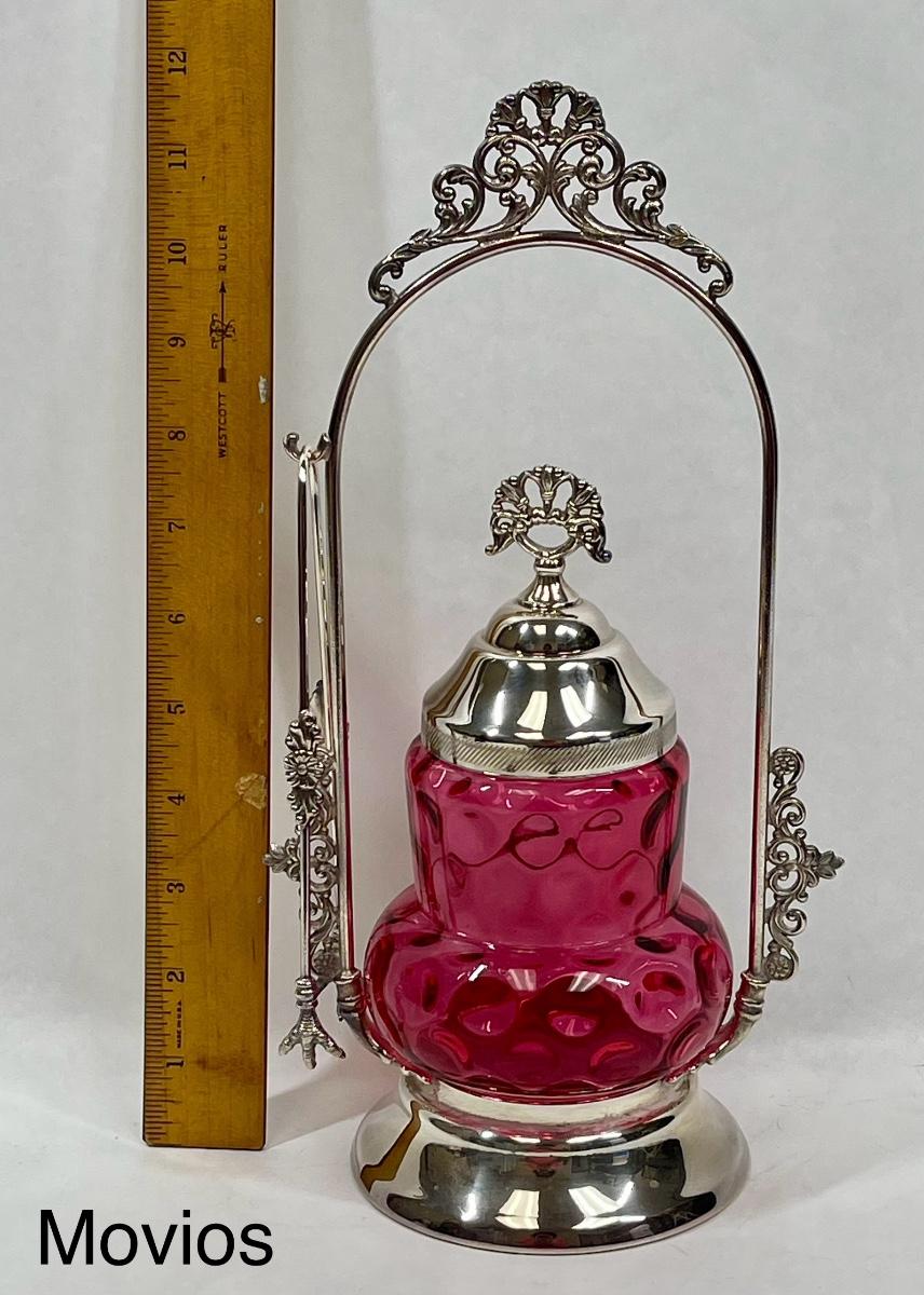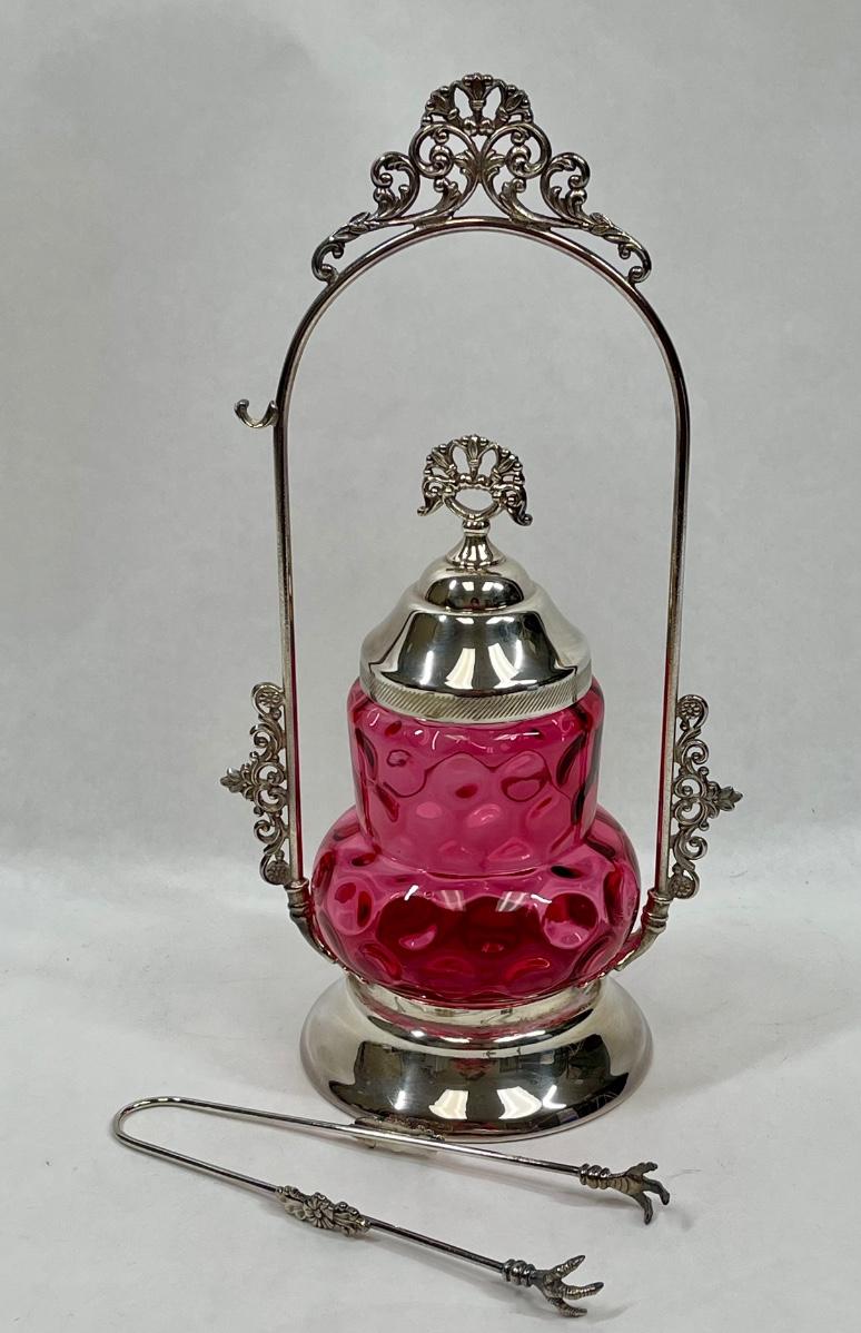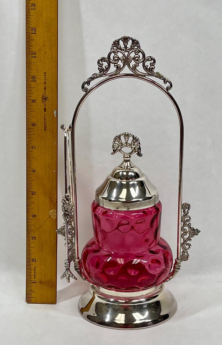 Cranberry Glass Thumbprint Dot Pattern Pickle Cruet Jar on Silver Stand with tongs
