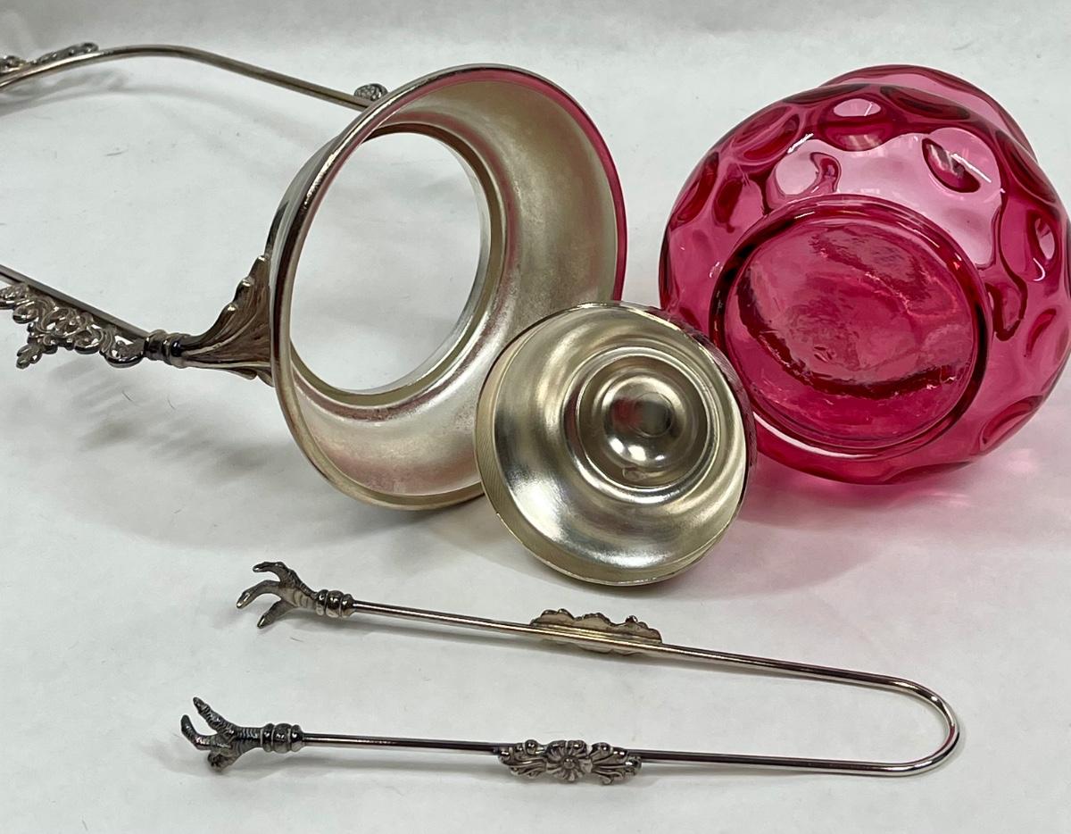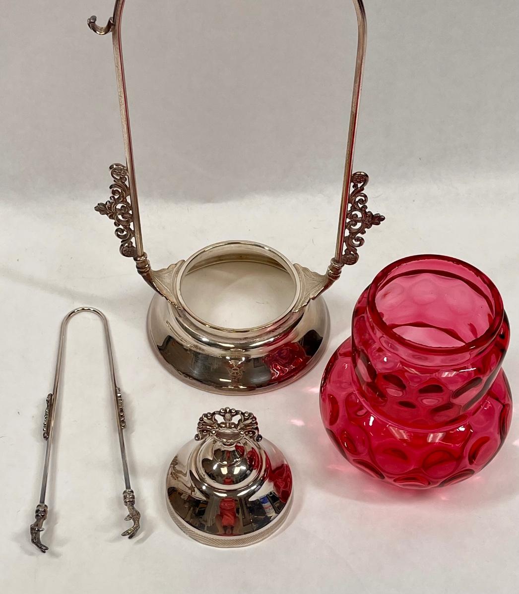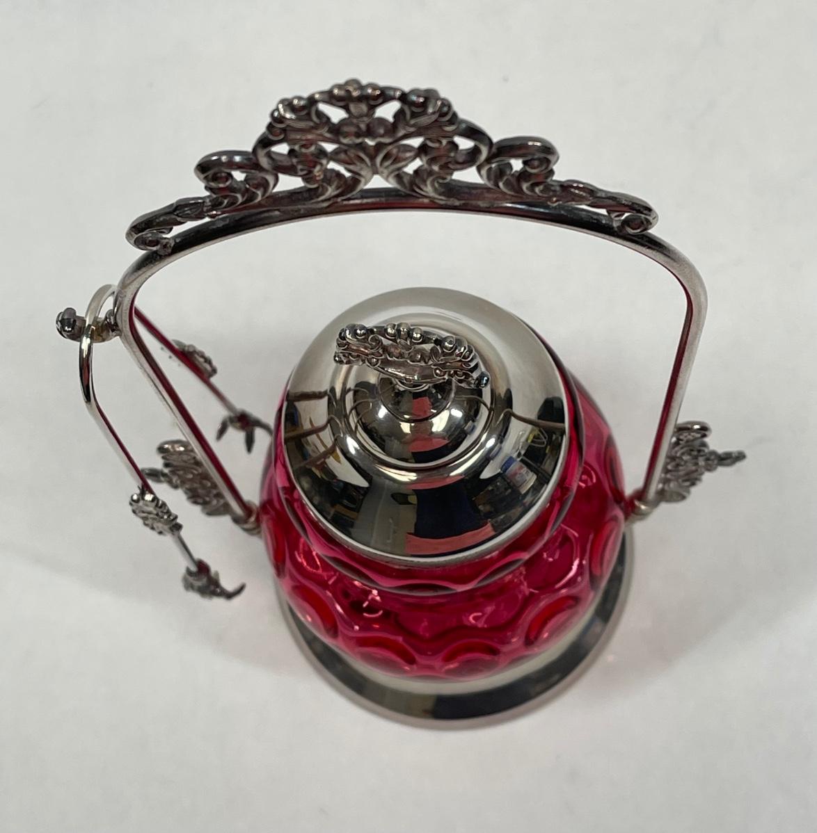 Cranberry Glass Thumbprint Dot Pattern Pickle Cruet Jar on Silver Stand with tongs