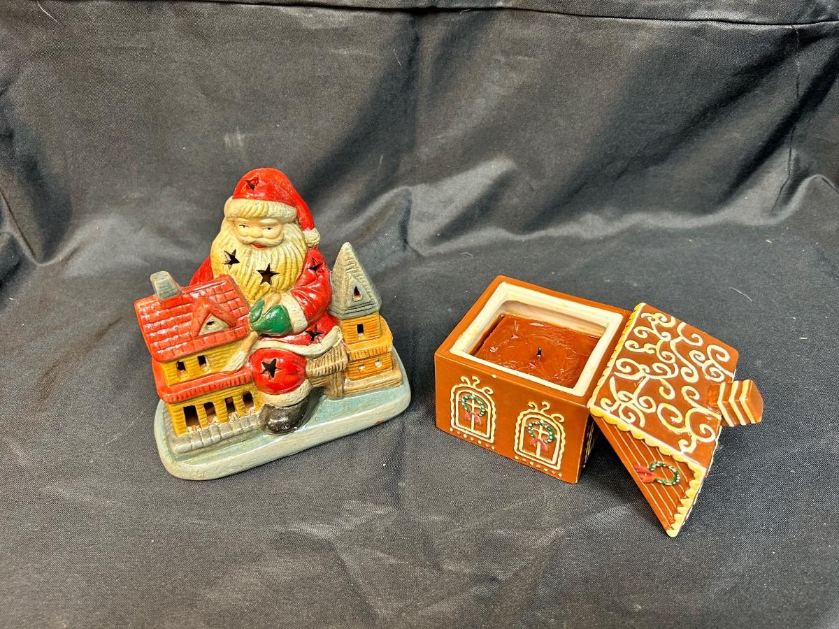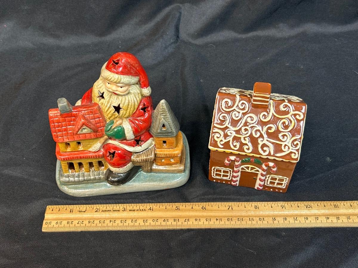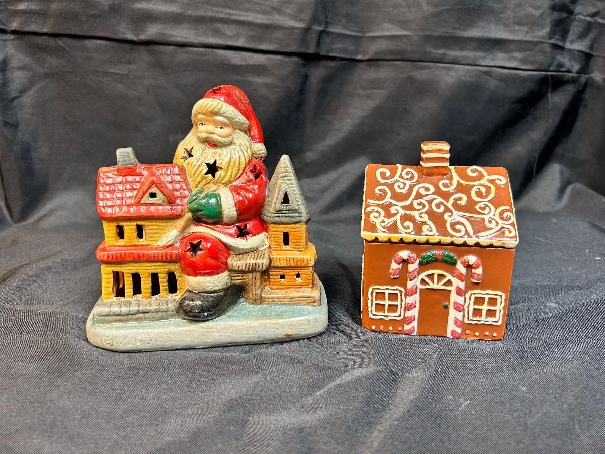 Pair of Ceramic Christmas Holiday Candle Holders Santa Claus Gingerbread House. In good condition. the gingerbread house has a candle inside that has been previously lit.