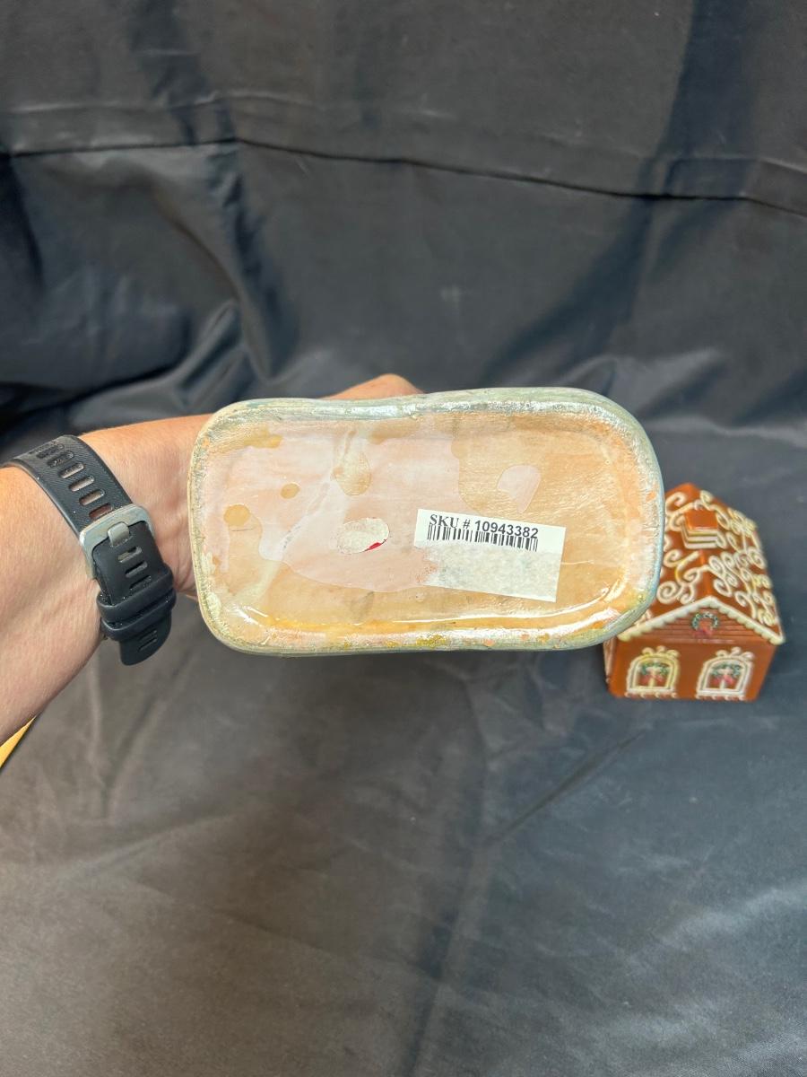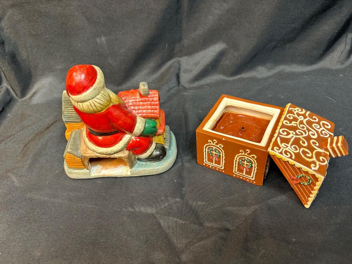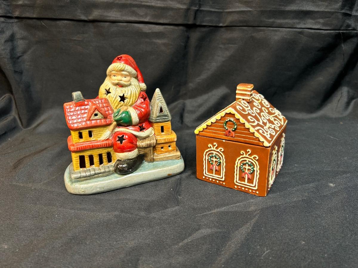 Pair of Ceramic Christmas Holiday Candle Holders Santa Claus Gingerbread House. In good condition. the gingerbread house has a candle inside that has been previously lit.