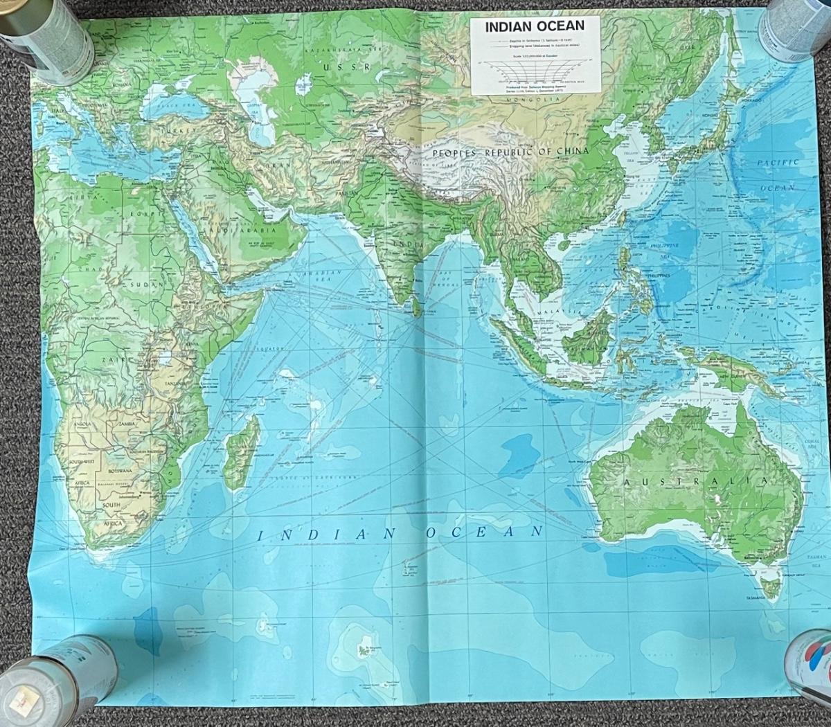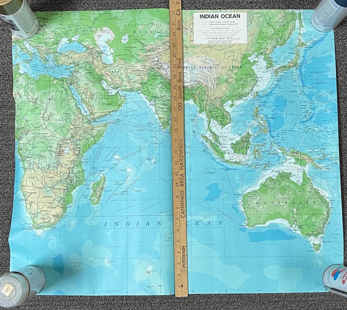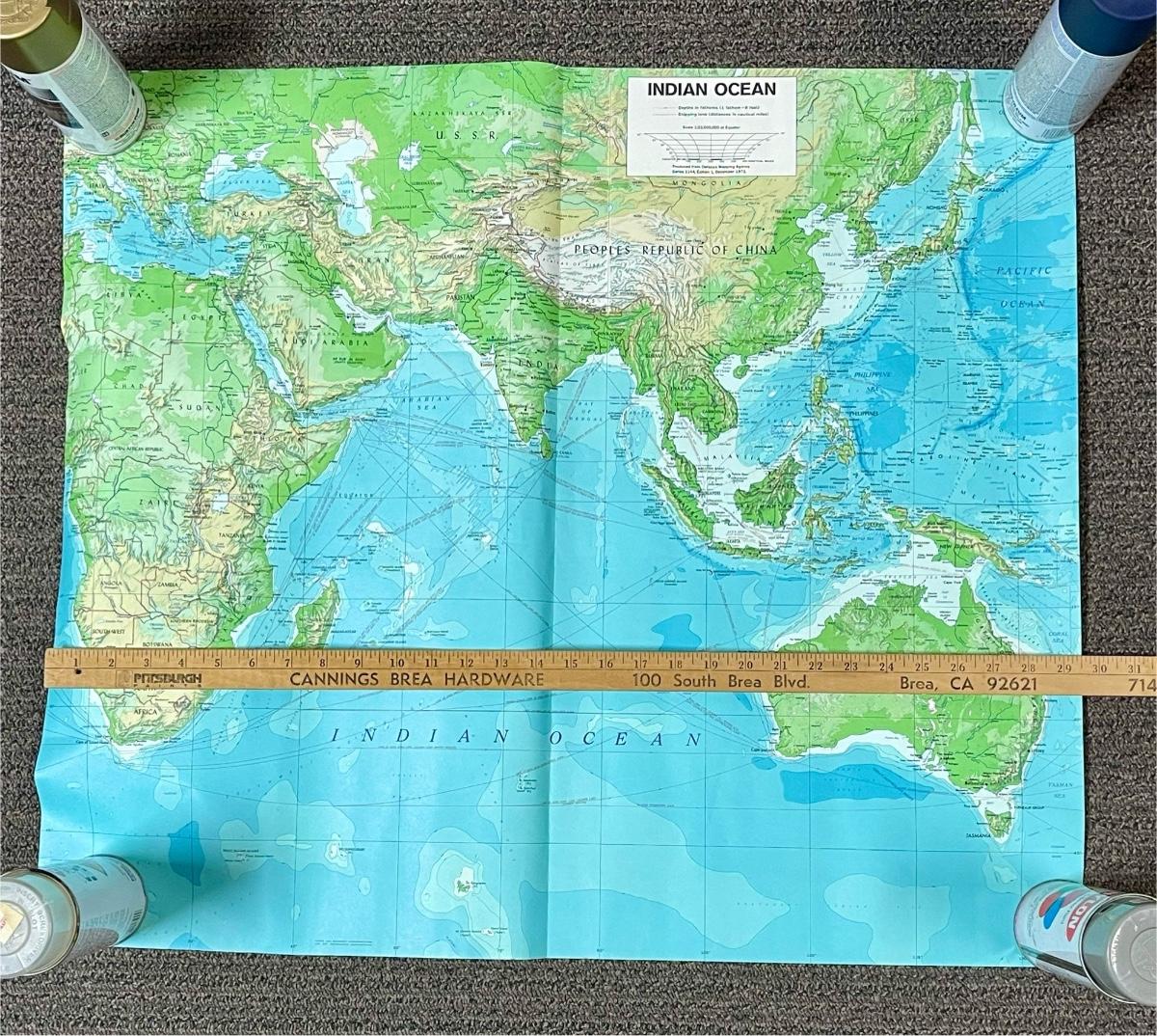 Mercator projection style. Includes land areas of Australia, Eastern AfricaIndia, China, and surrounding countries. Approx. size 26" x 30", from 1974. Most likely a wall map for classrooms.