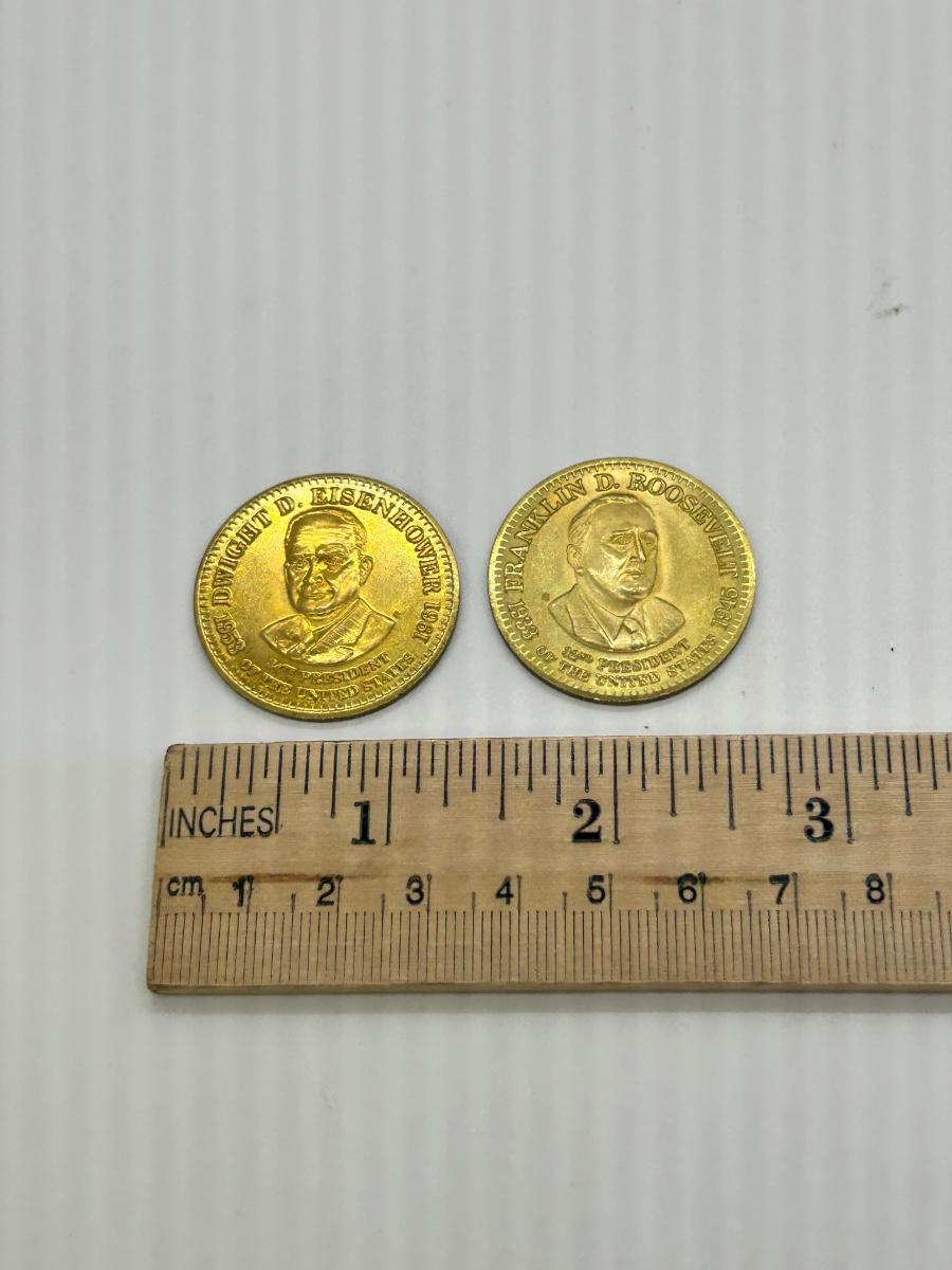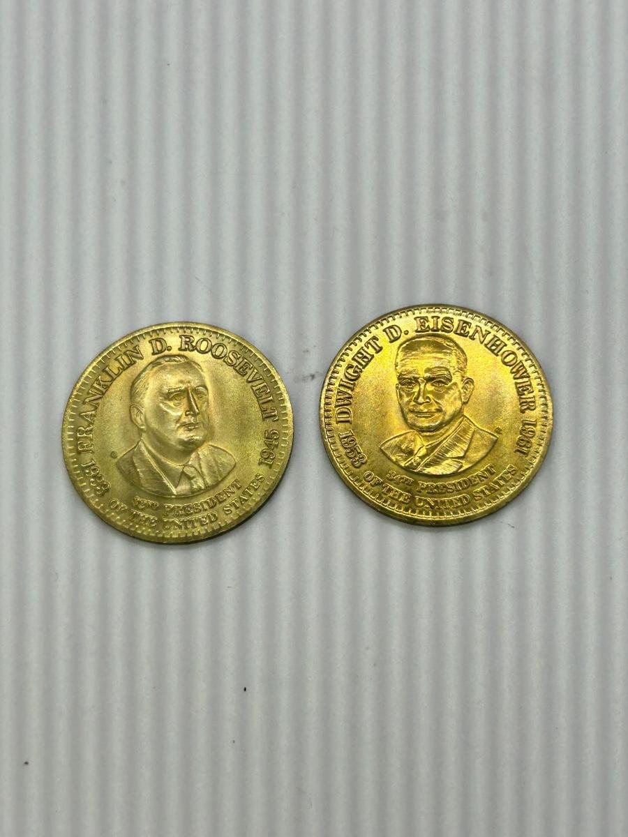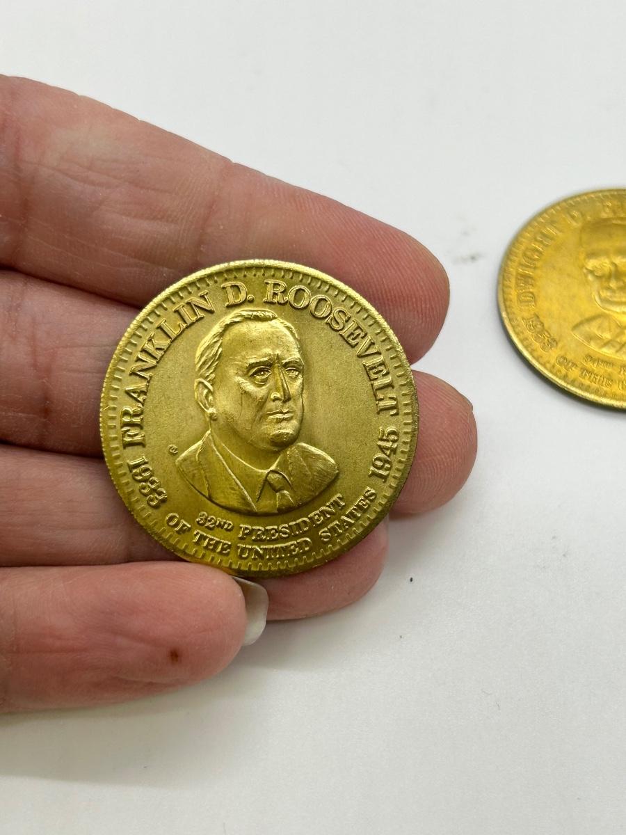 Pair of Gold Tone Presidential Collector Medallion Coins Roosevelt & Eisenhower. In good condition. Token style coins, no monetary value.