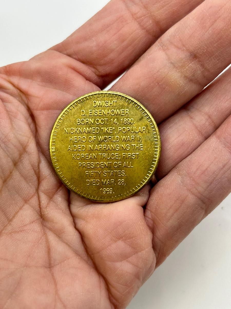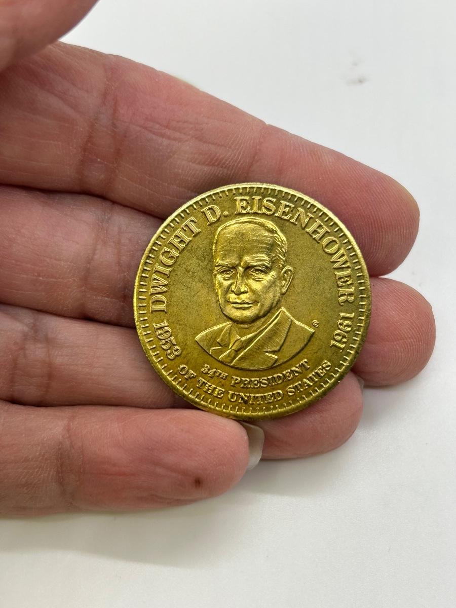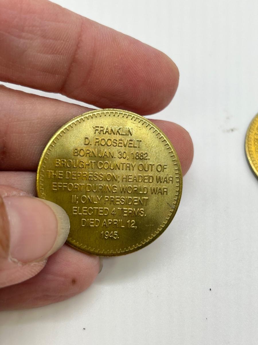 Pair of Gold Tone Presidential Collector Medallion Coins Roosevelt & Eisenhower. In good condition. Token style coins, no monetary value.