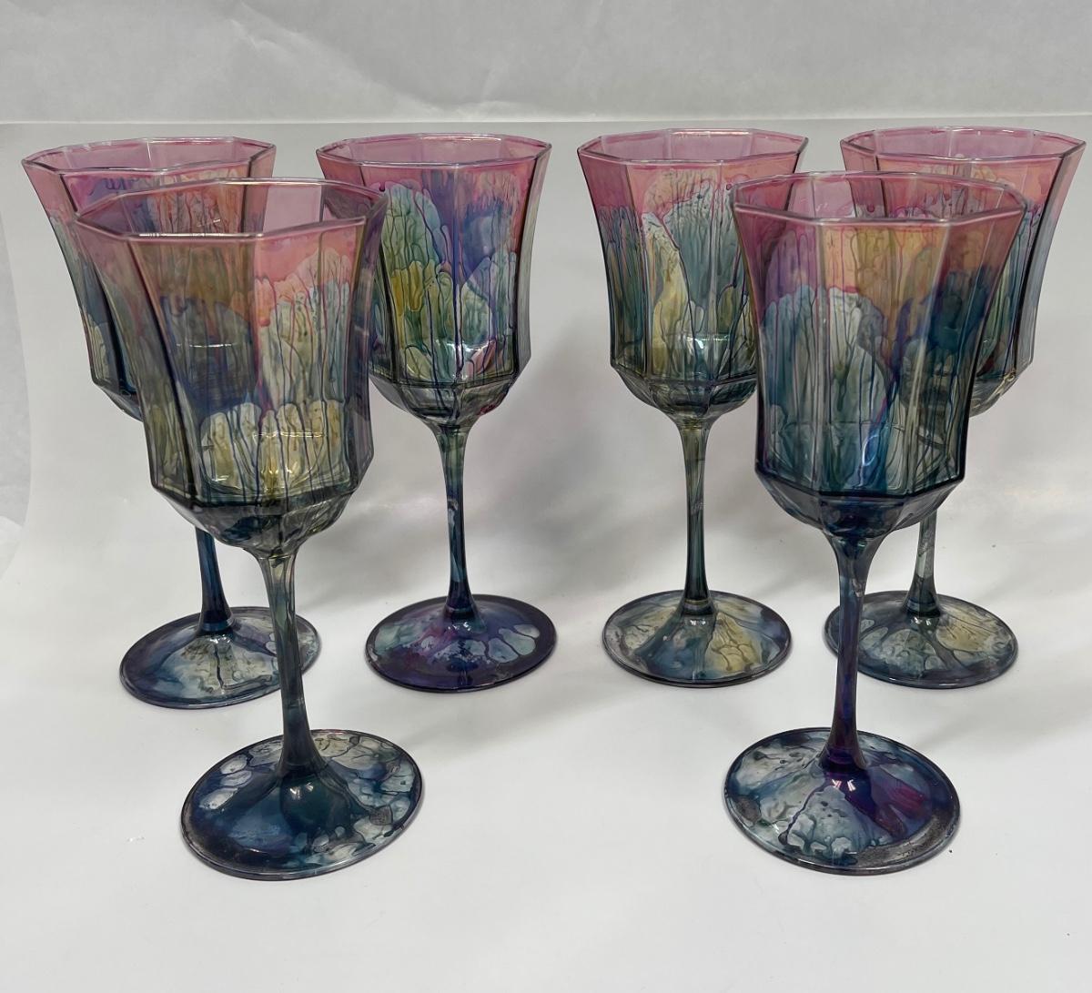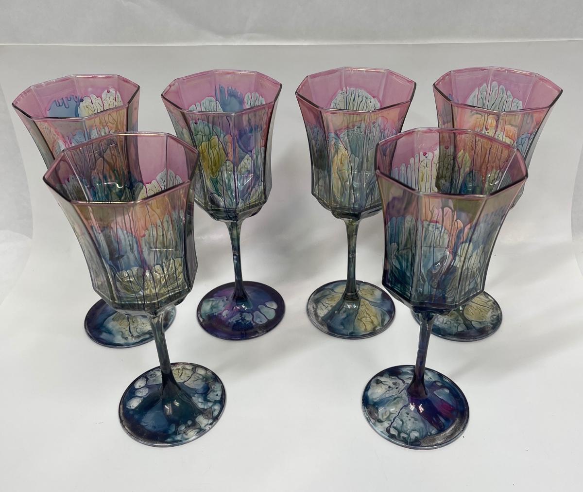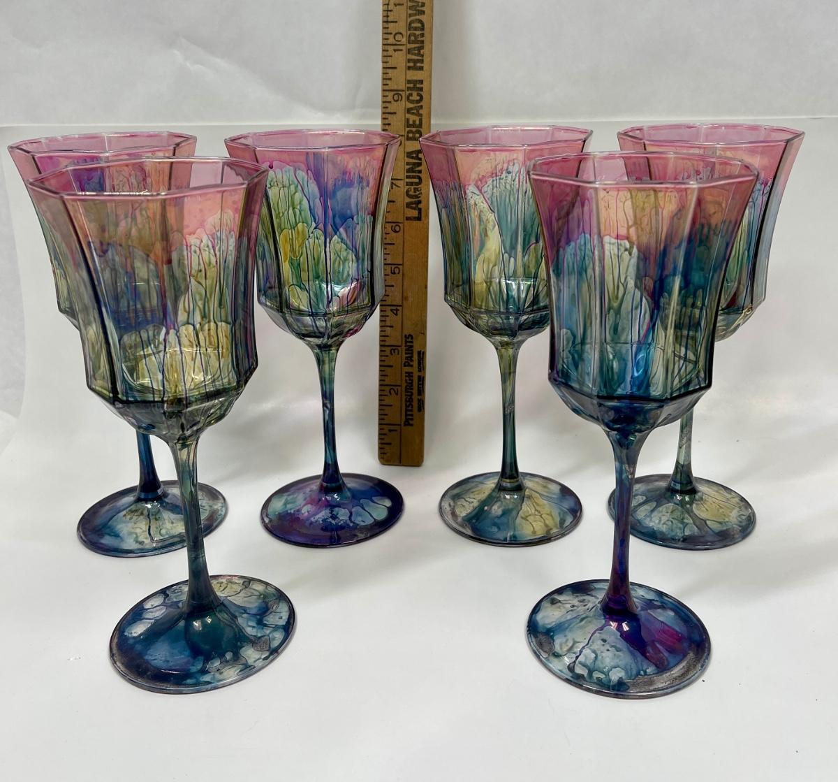 Set of 6 Rueven, Nouveau Art Glass Vaporwave Luminarc Octagonal Wine Glasses
