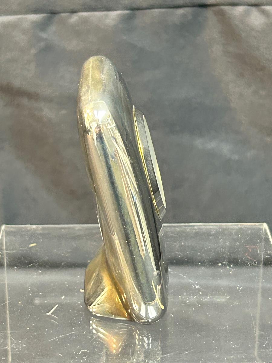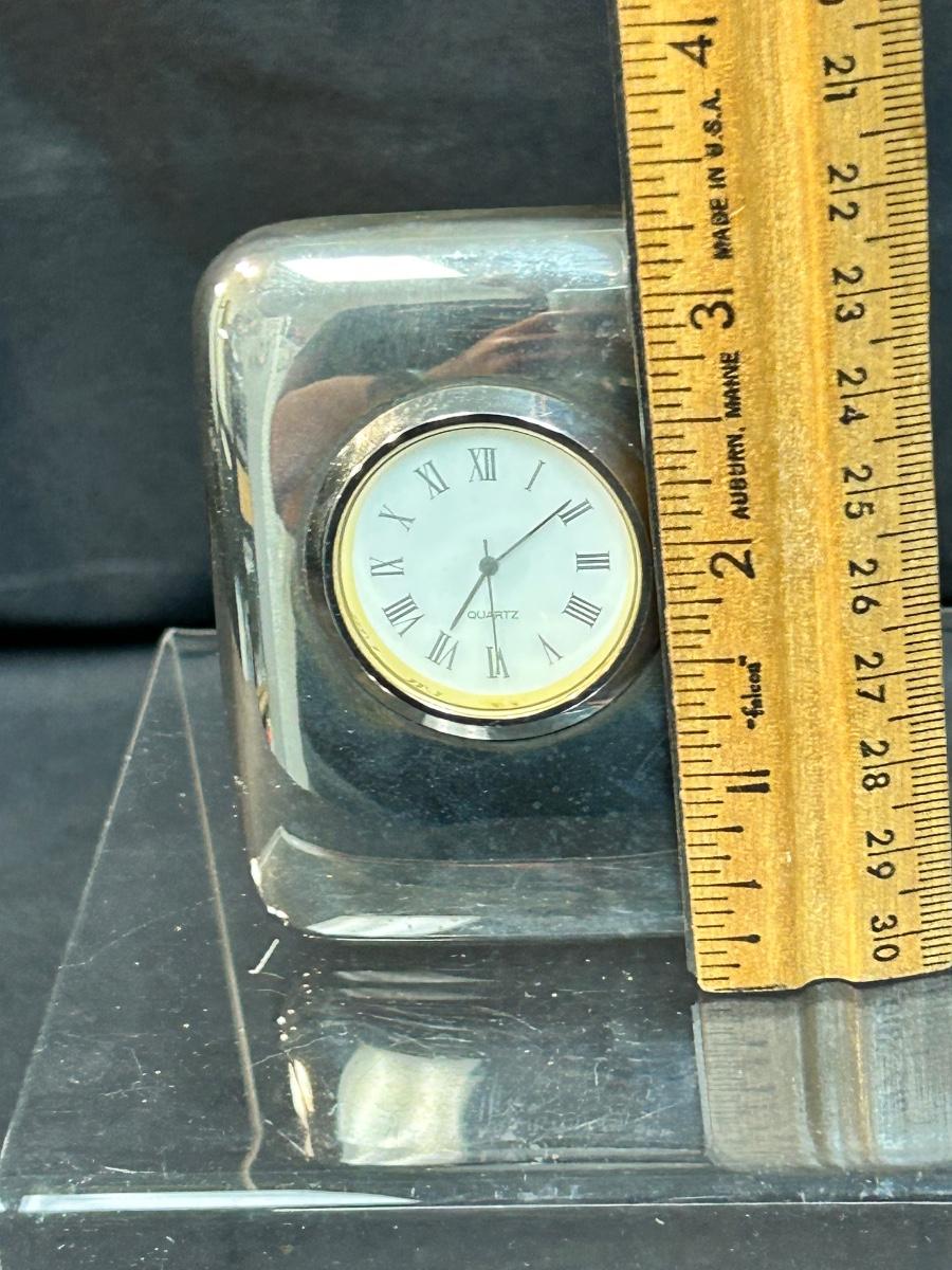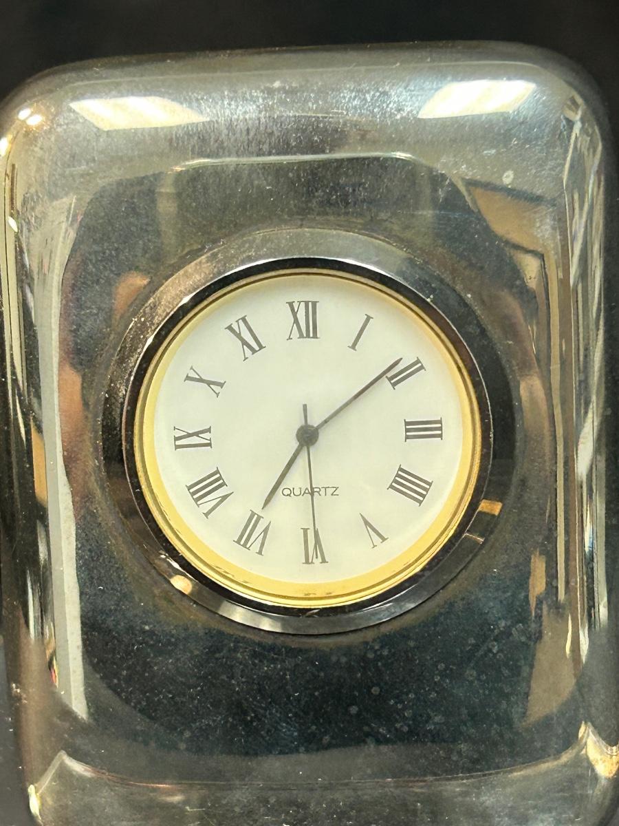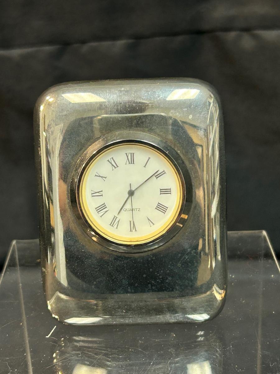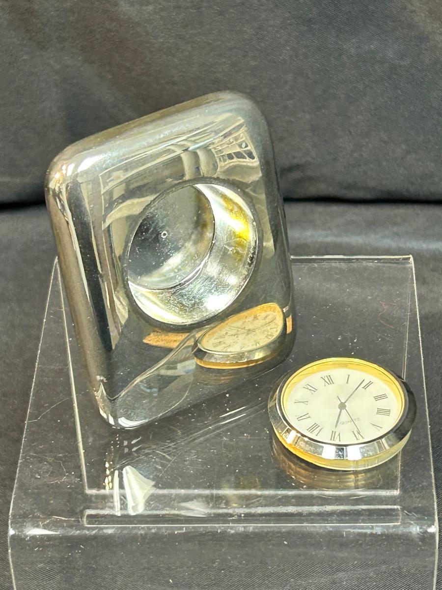 Small Battery Operated Silver Plate Desk Nightstand Shelf Sitting Clock. Not running. Clock face pops out of silver plate frame. Takes a watch style battery. About 3" size.