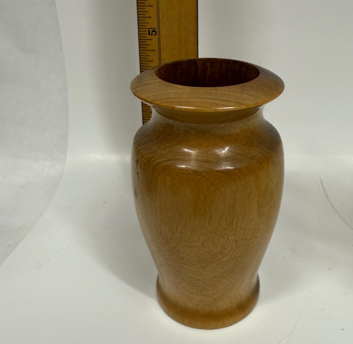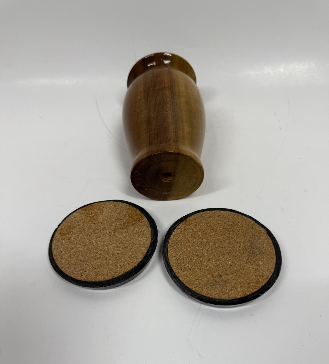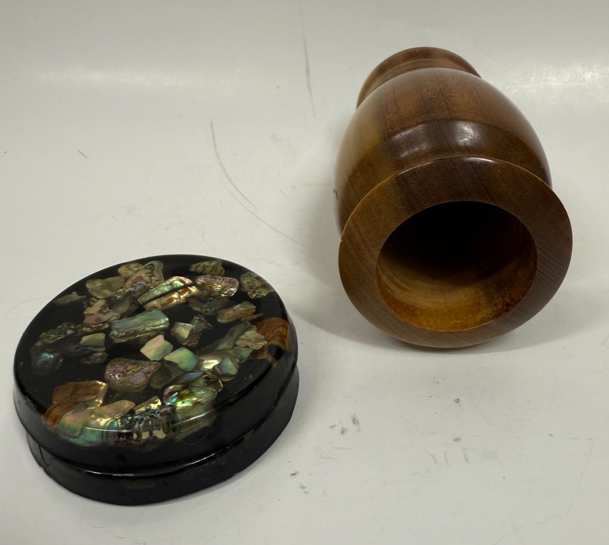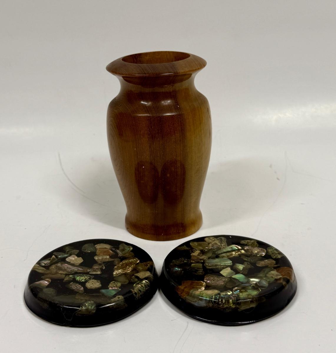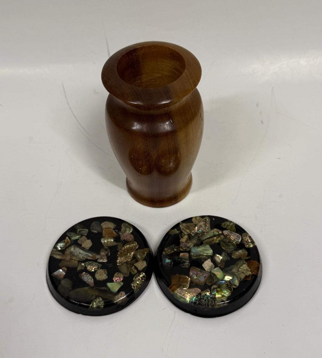 Hardwood Vase approx. 4.75" tall & 2 resin coasters with embedded mother of pearl chips approx. 3" across, all in good condition.