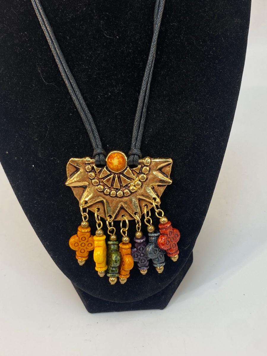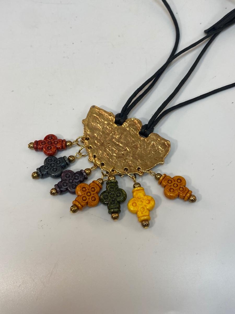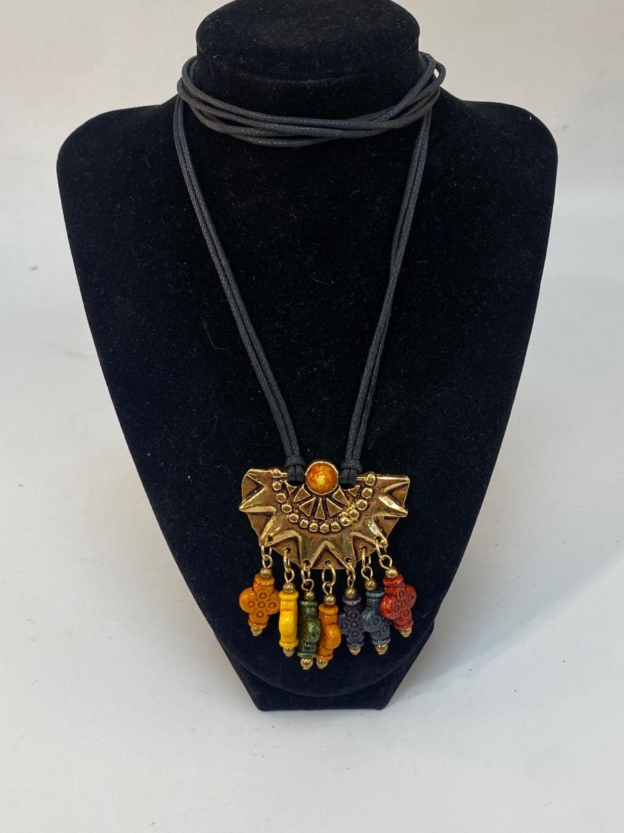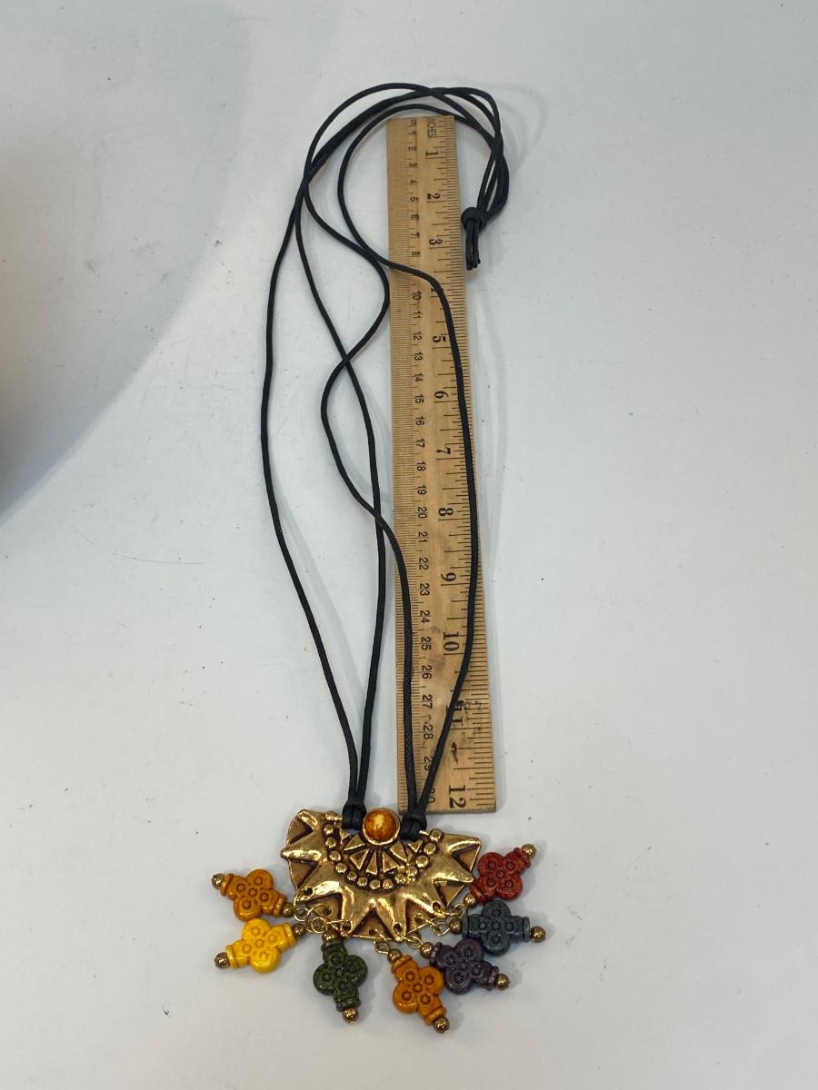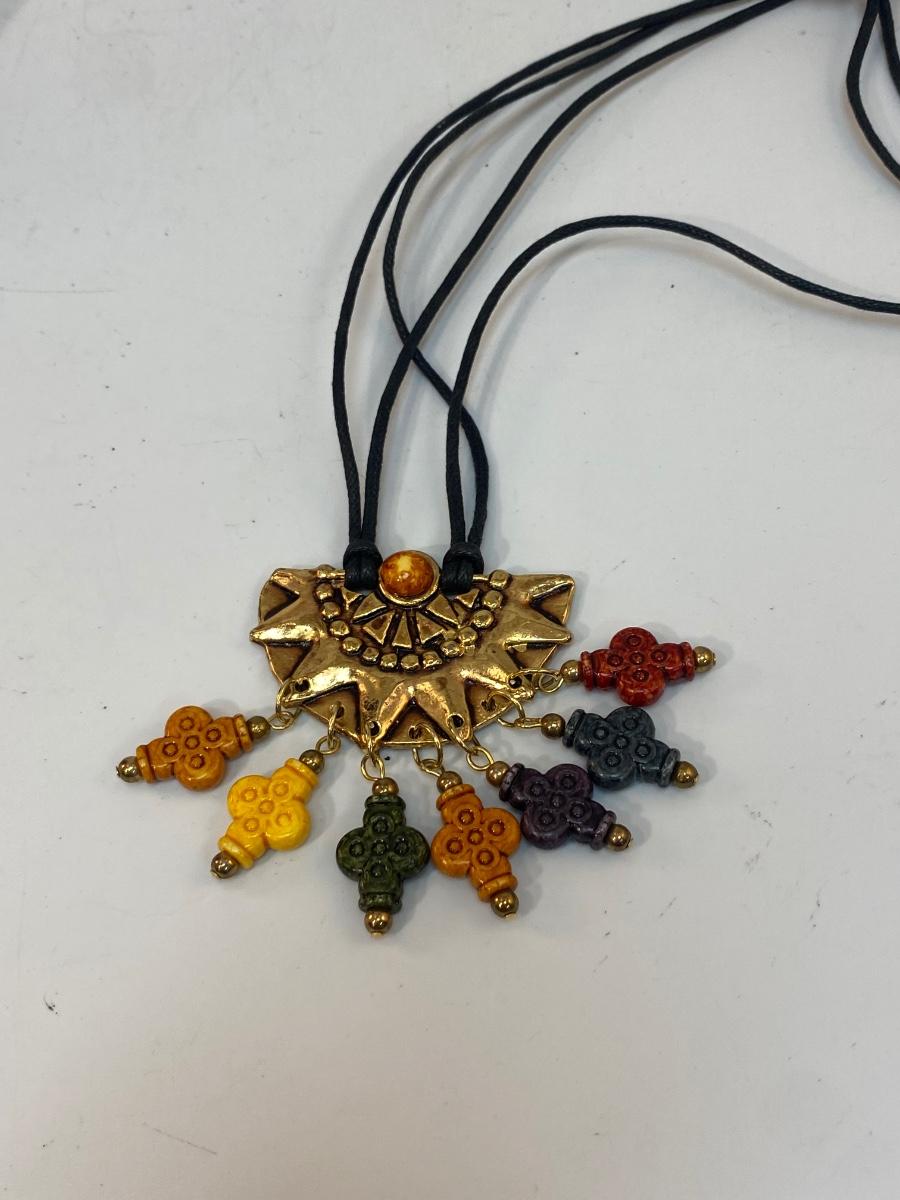 Gold Tone Half Medallion with Colorful Clay Crosses Statement Necklace. In good condition. Has black cording holding medallion in place. About 15" length not including the medallion piece.