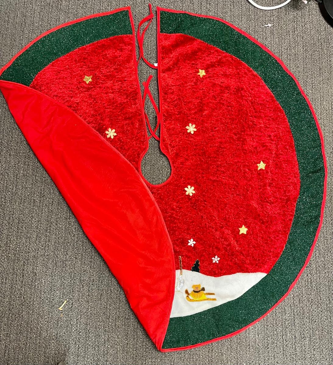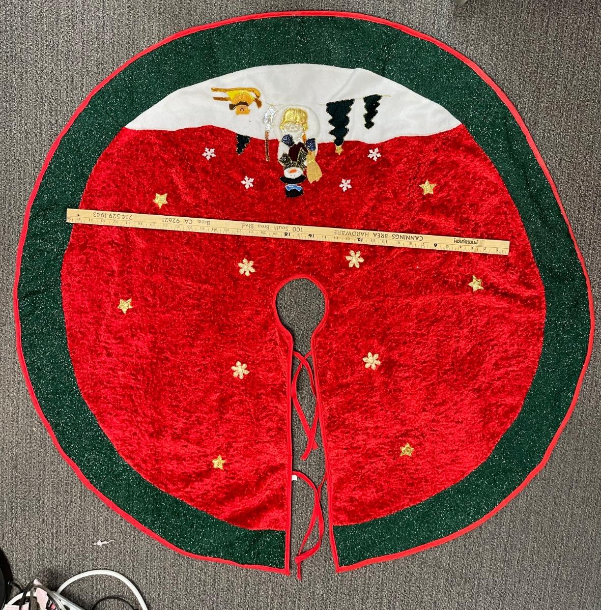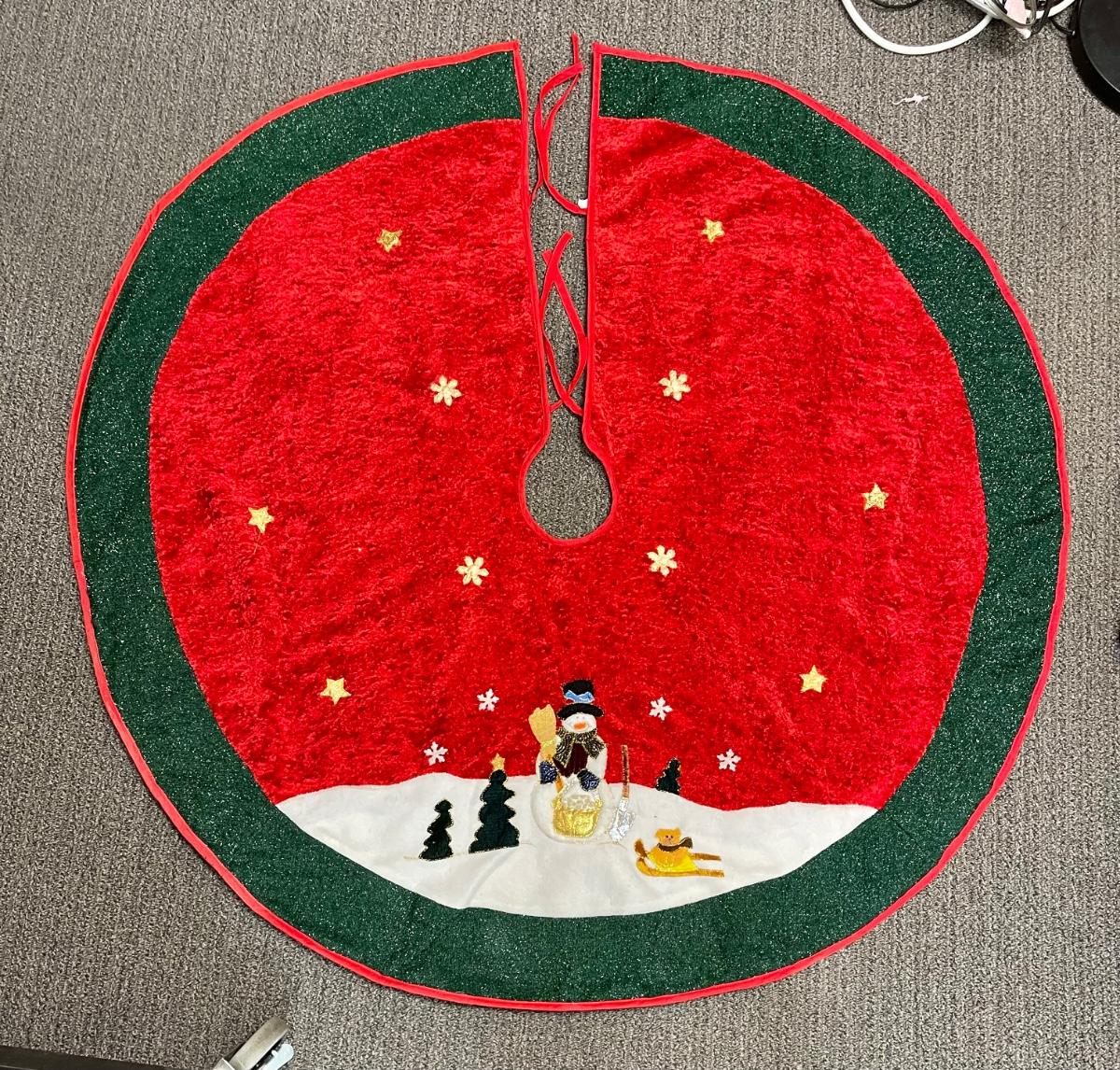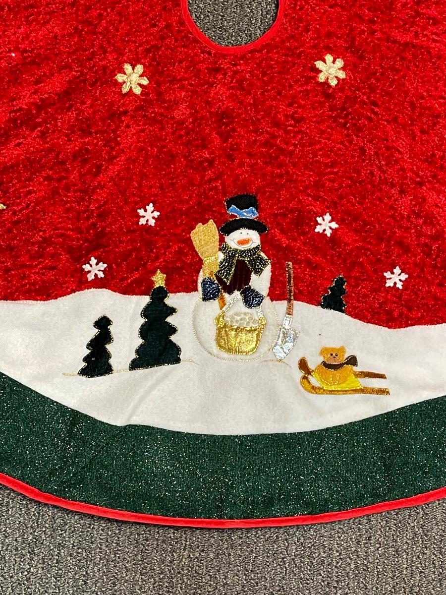Cute Traditional Red and Green Snowman Christmas Tree Skirt. In good condition.