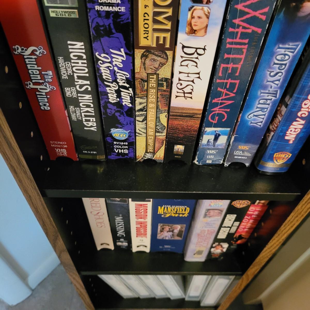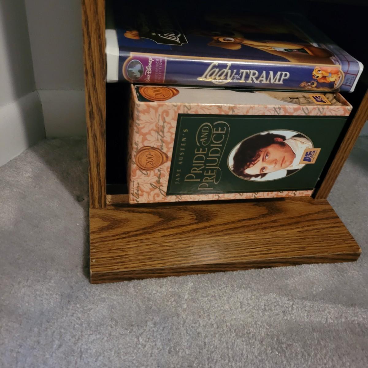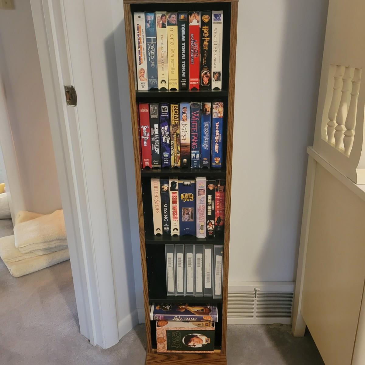 Over 30 vhs tapes and a tower to store them on in good condition. Storage tower has adjustable shelves and could be used to store other items. Tower is made of pressed wood with a paper veneer and measures approximately 11" x 9.5" x 45" Local pickup only