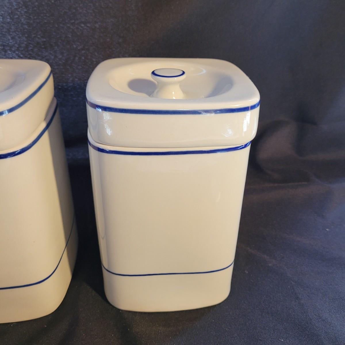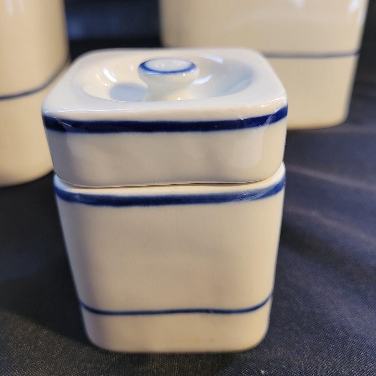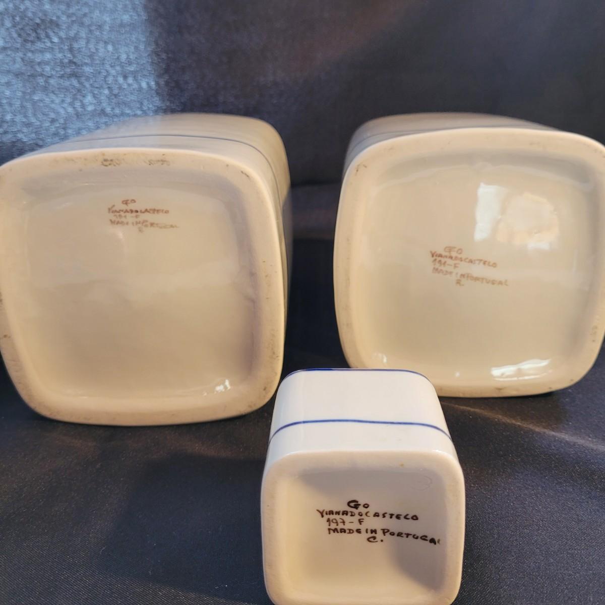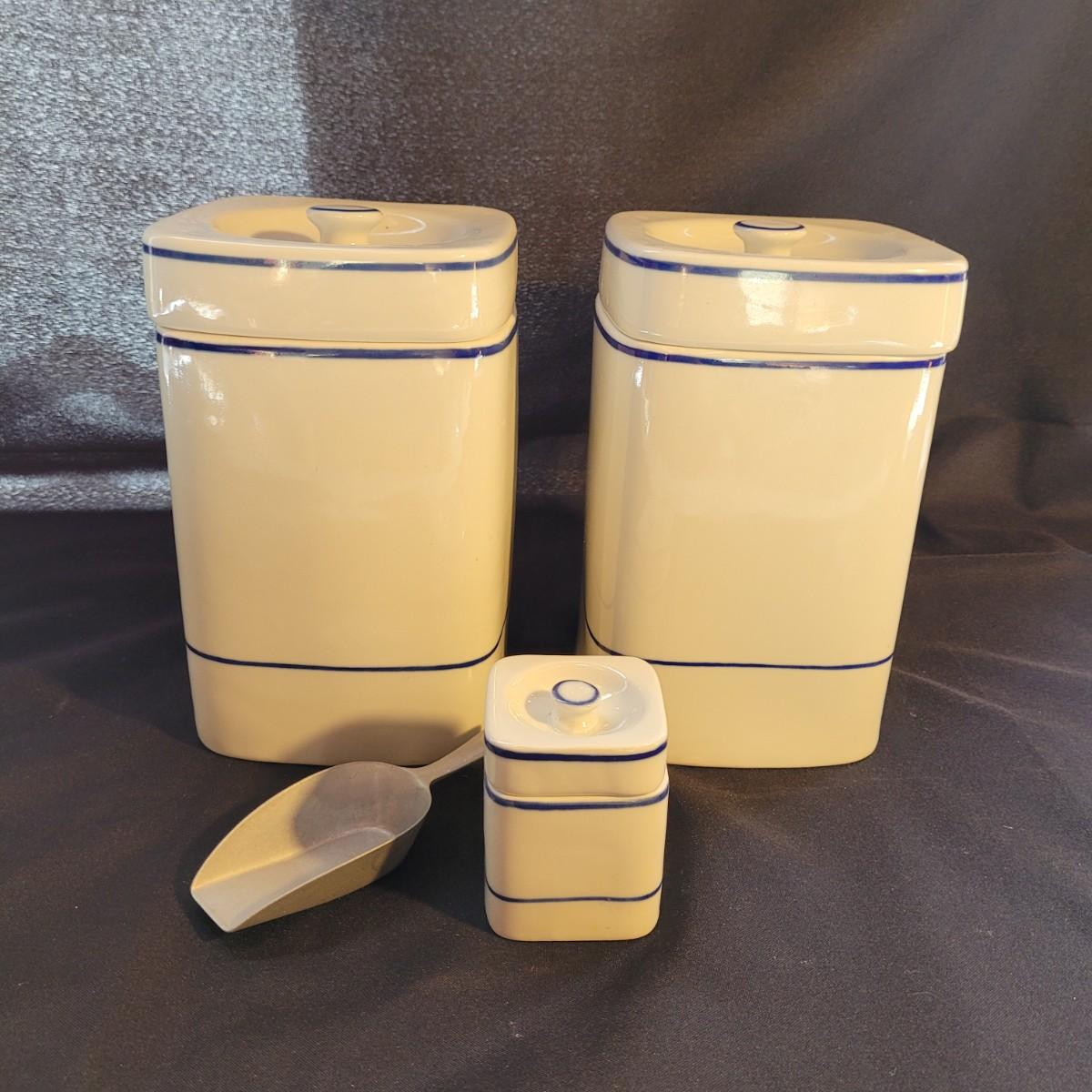 A beautiful set of lidded jars is made by Viana do Castelo of Portugal. Plus a scoop. Large jars measure approximately 5.5”SQ x 9”H. Shipping available.