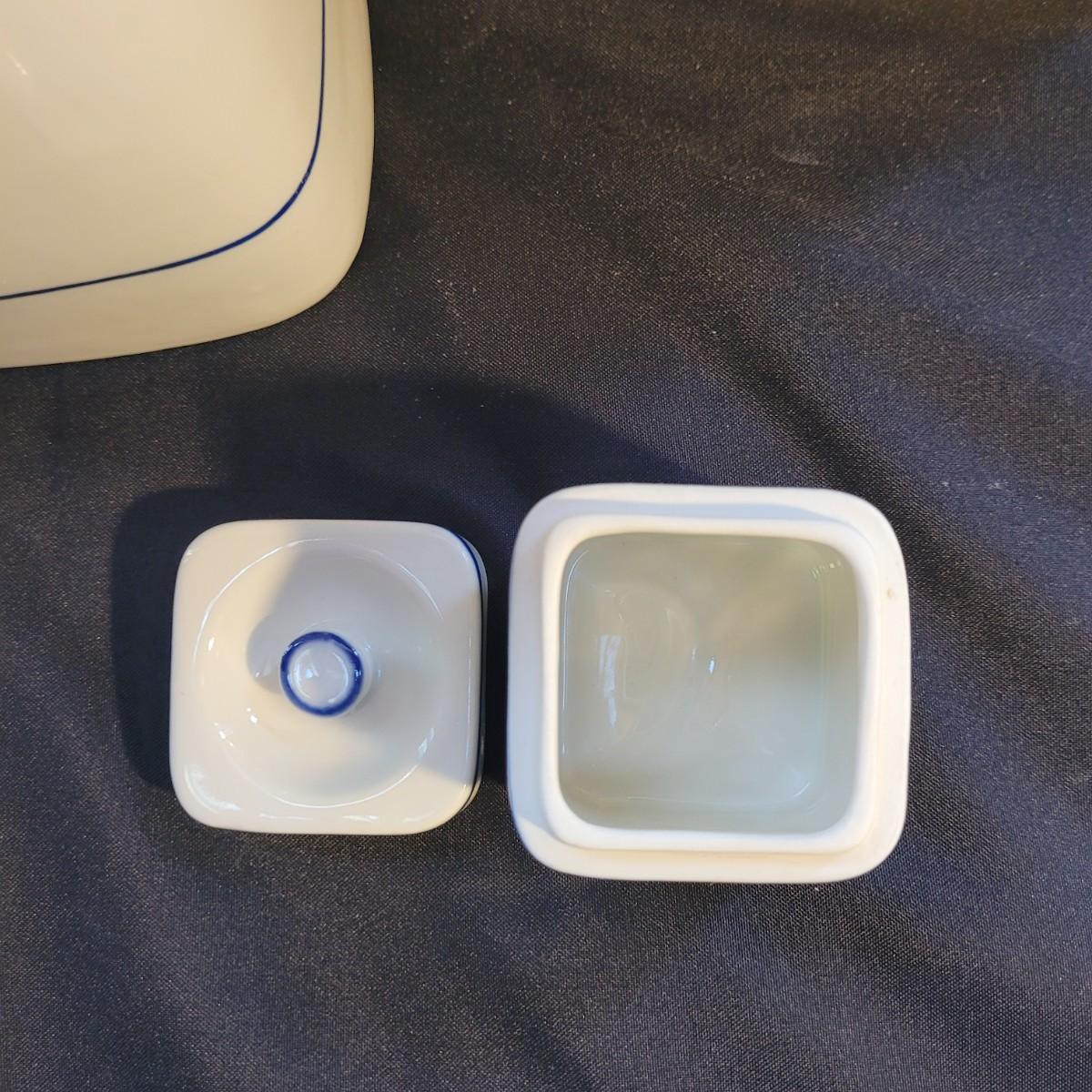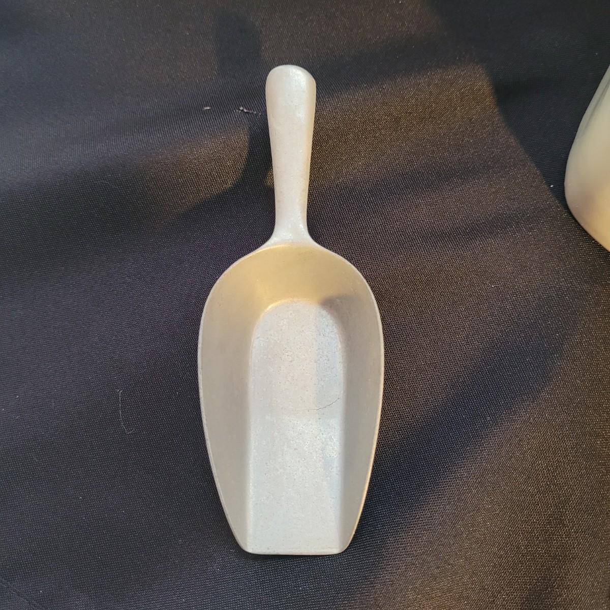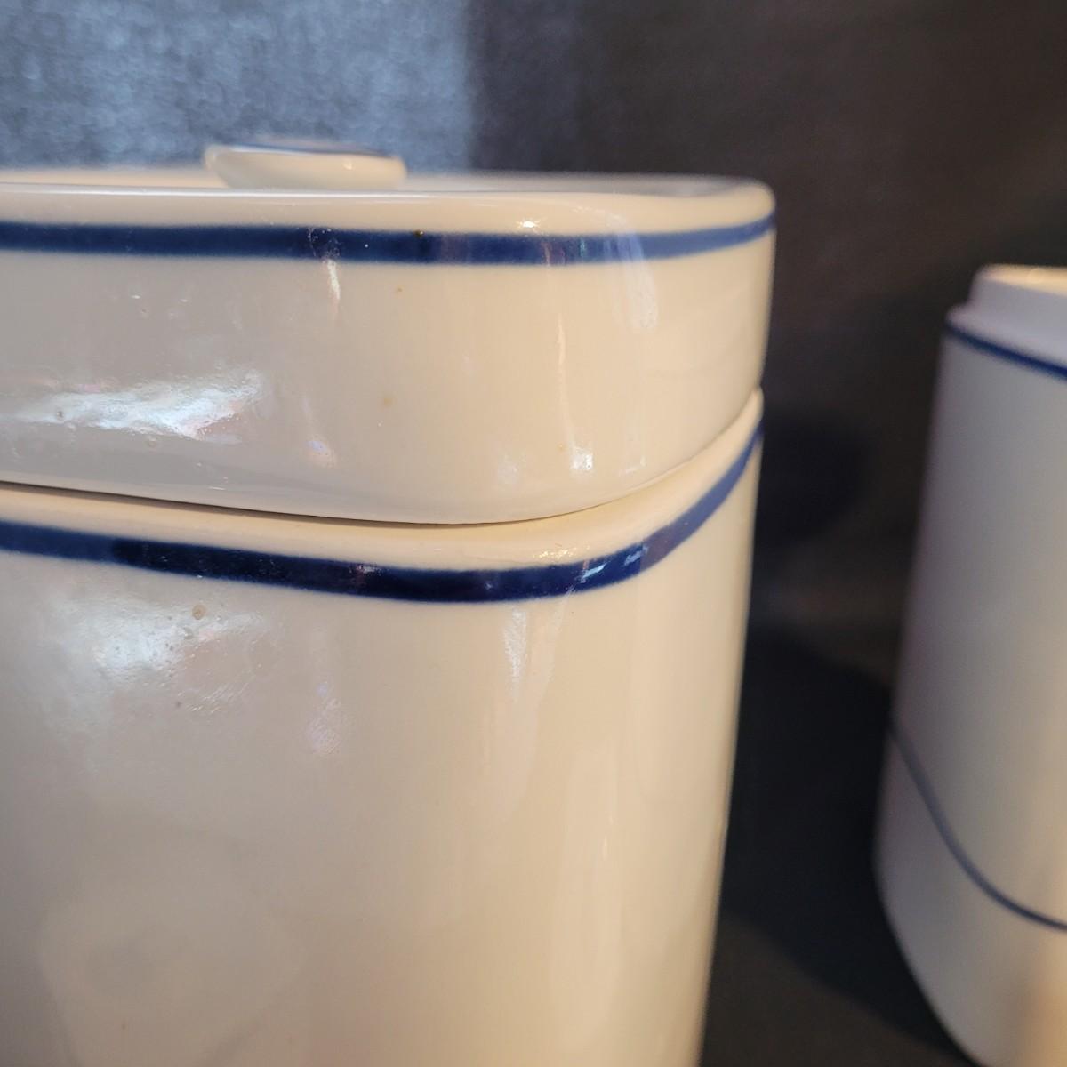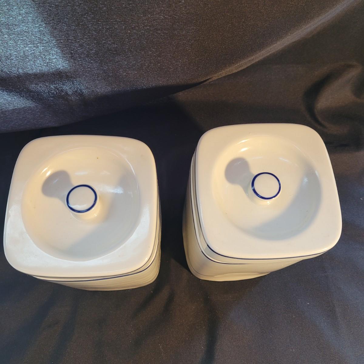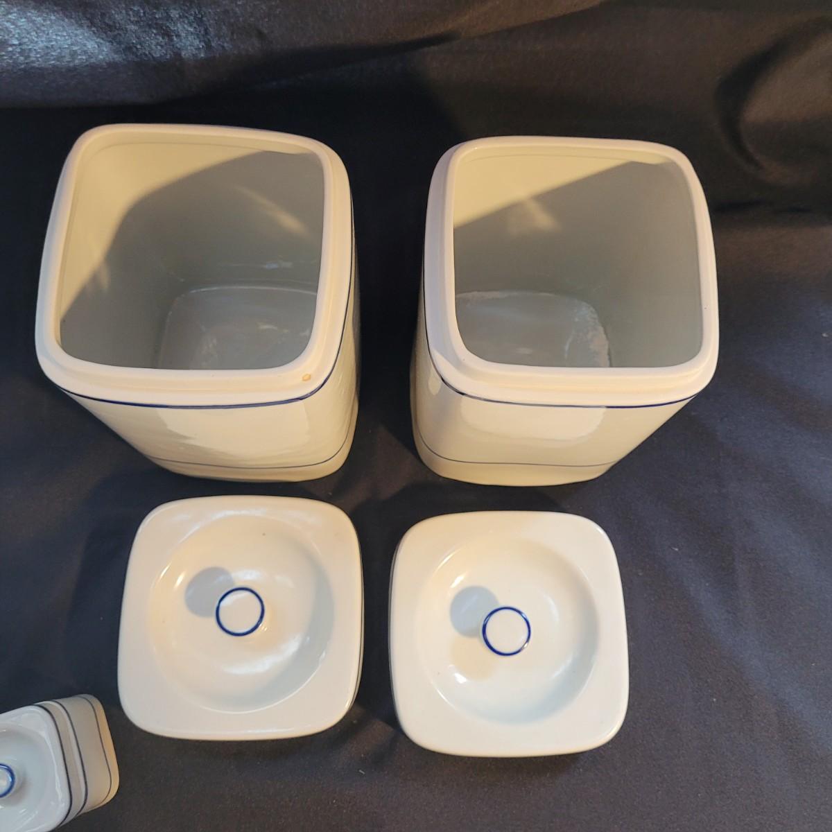 A beautiful set of lidded jars is made by Viana do Castelo of Portugal. Plus a scoop. Large jars measure approximately 5.5”SQ x 9”H. Shipping available.