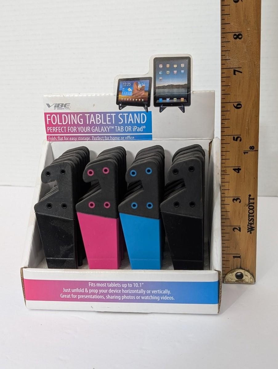 Boxed lot of Vibe E-Ssential folding tablet stands designed for Galaxy Tab, iPad, and other tablets up to 10.1 inches. Sturdy black stands with colorful accents fold flat for easy storage, making them ideal for presentations, photo sharing, or video viewing. Comes in original retail display box.