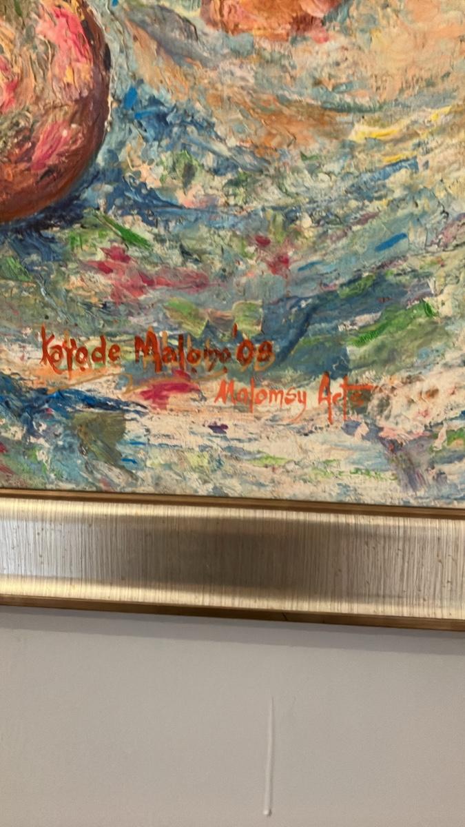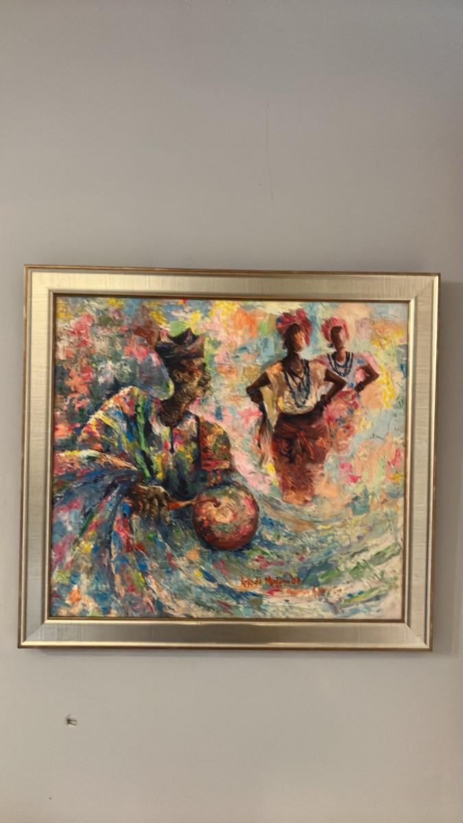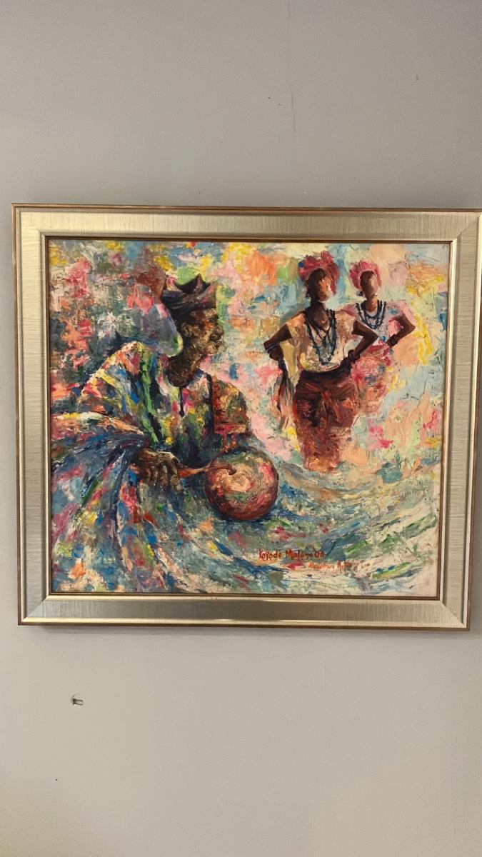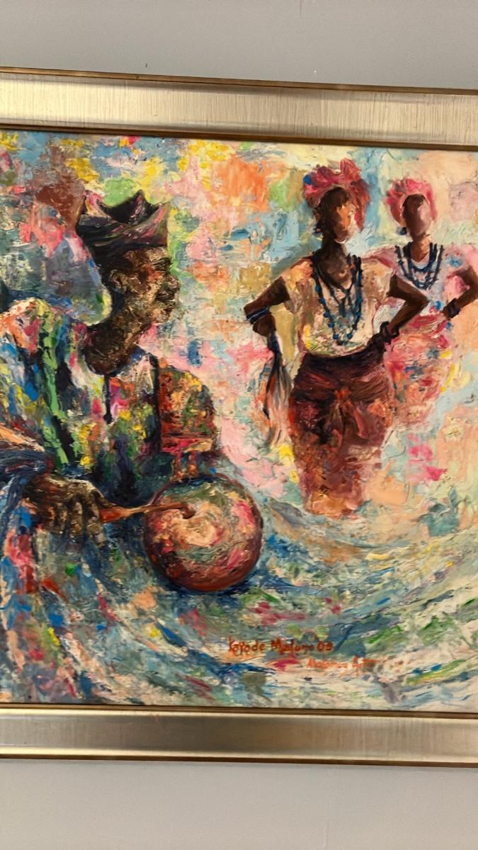 Celebrate the rhythm of African heritage with this stunning 2008 oil on canvas by acclaimed Nigerian-born, Pennsylvania-based multimedia artist Kayode Malomo. Titled implicitly through its dynamic scene of a drummer and dancing figures in flowing, colorful robes and headwraps, this piece bursts with Malomo's signature vibrancy—layers of turquoise, crimson, gold, and emerald evoking happiness, hope, and cultural beauty. The central male figure, adorned in intricate patterns, plays a traditional drum while ethereal female dancers swirl in motion, their beaded necklaces and skirts alive with energy against a dreamlike, swirling background.