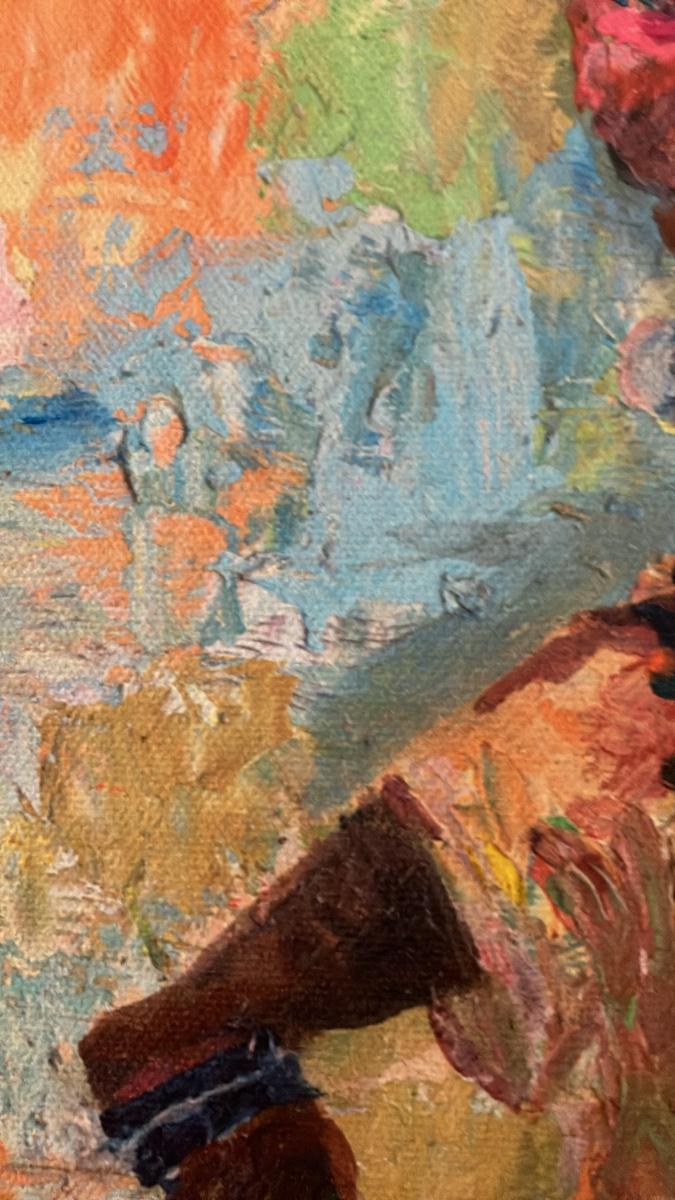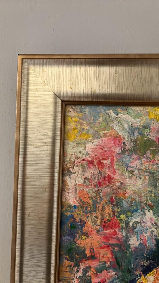 Measuring 28 inches high by 30 inches wide including the elegant gold frame (canvas approx. 24x20 inches), this signed lower-right original