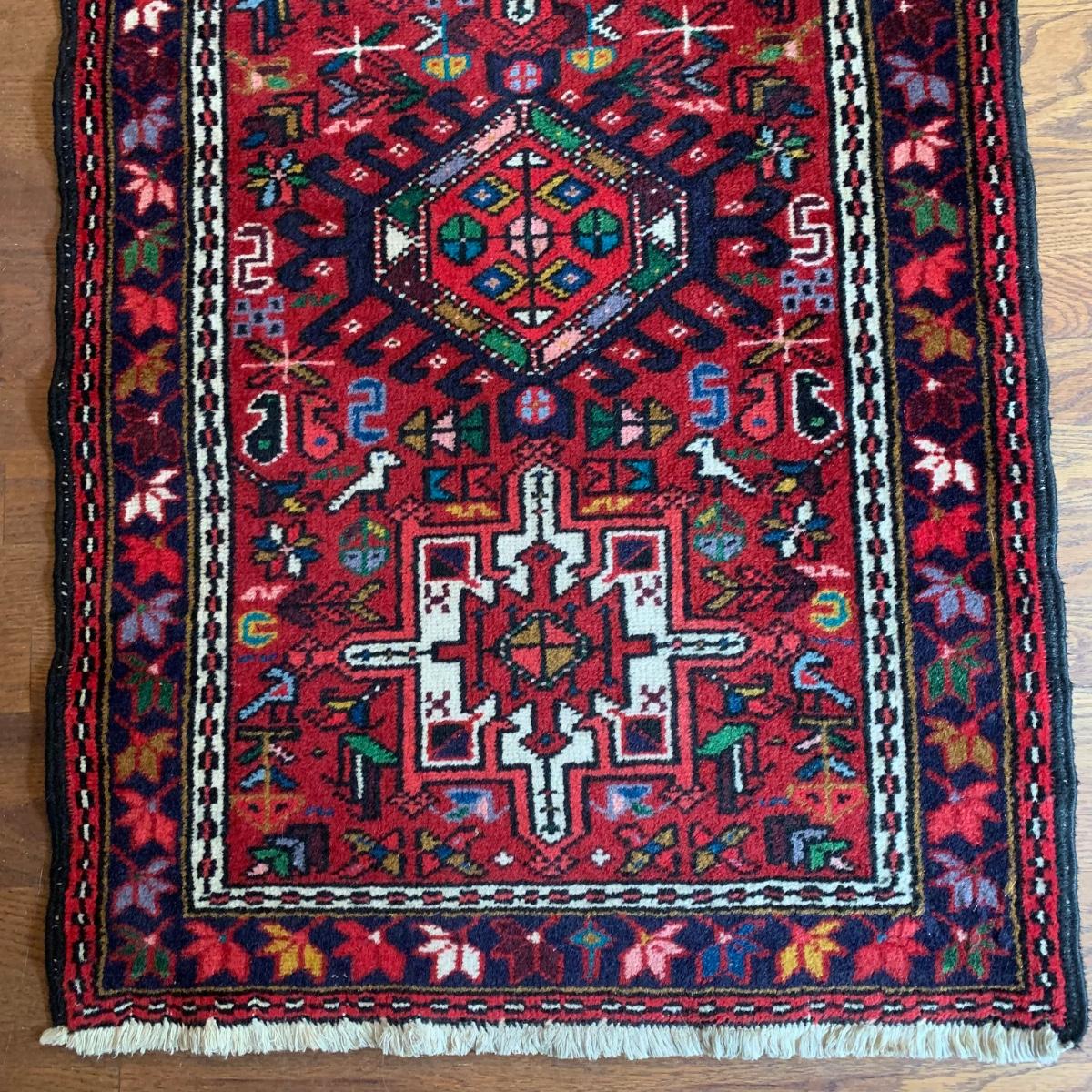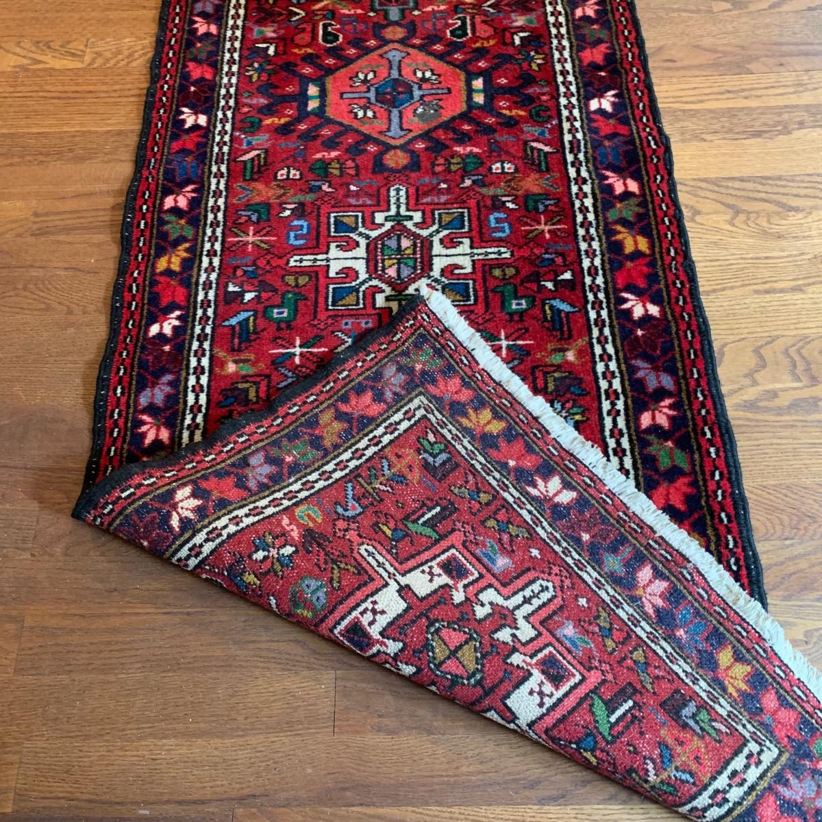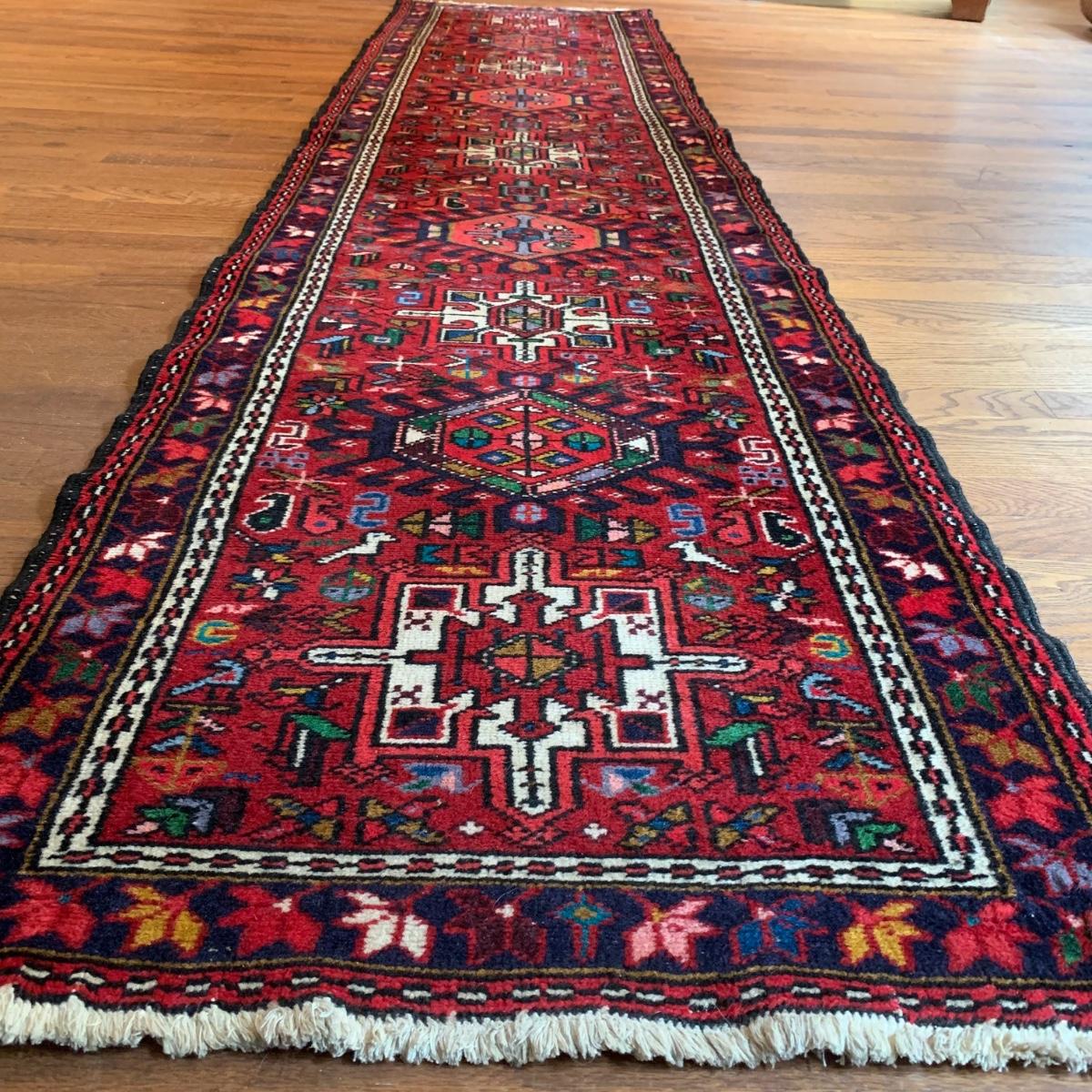 This vibrant red runner rug measures approximately 9.5' x 1.5'. It is in good condition and features colorful leaf and bird patterns. Local pick-up only.