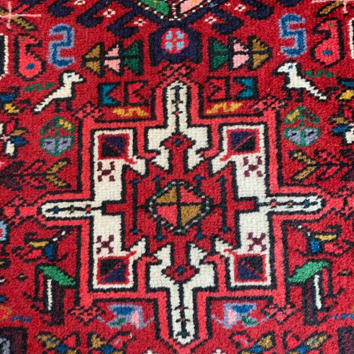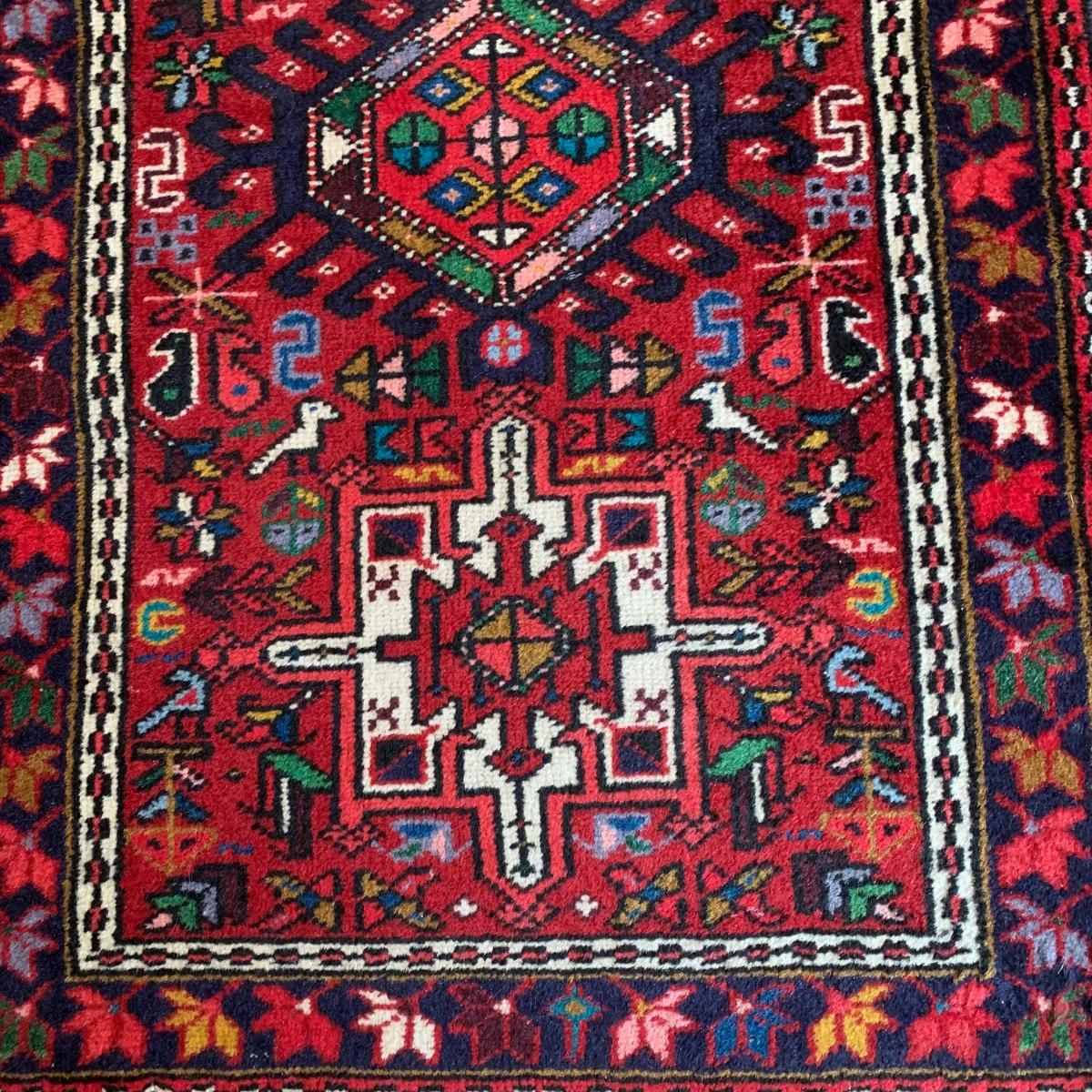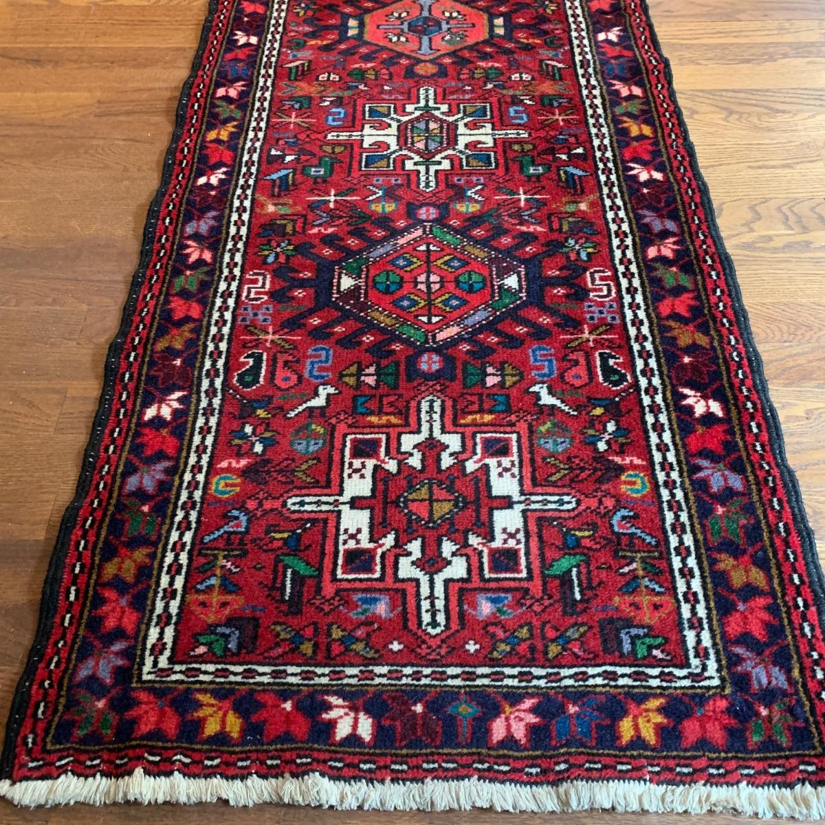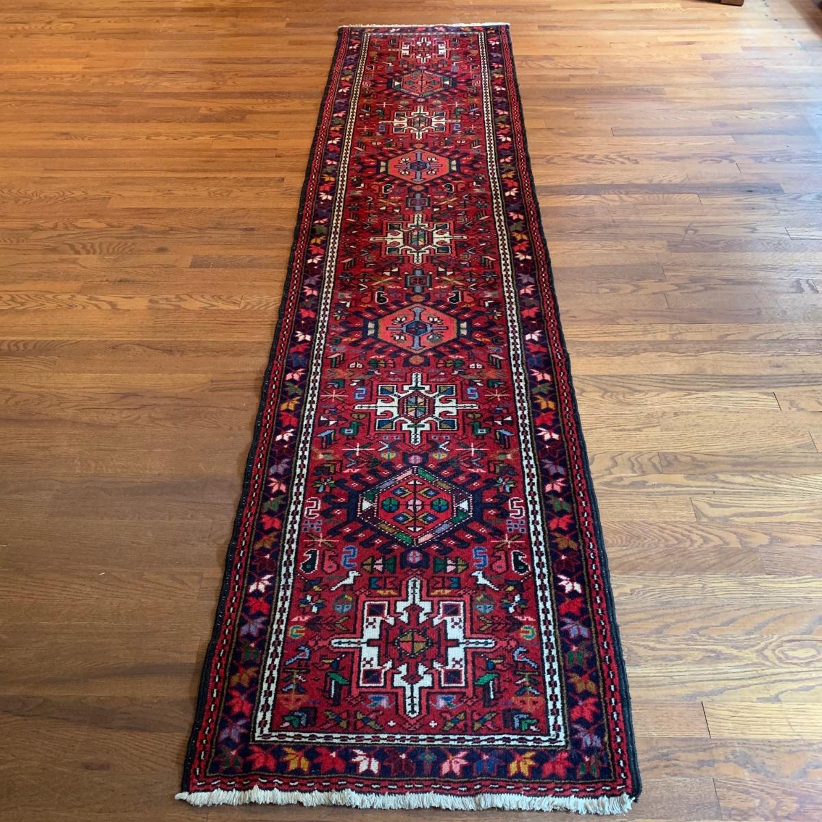 This vibrant red runner rug measures approximately 9.5' x 1.5'. It is in good condition and features colorful leaf and bird patterns. Local pick-up only.