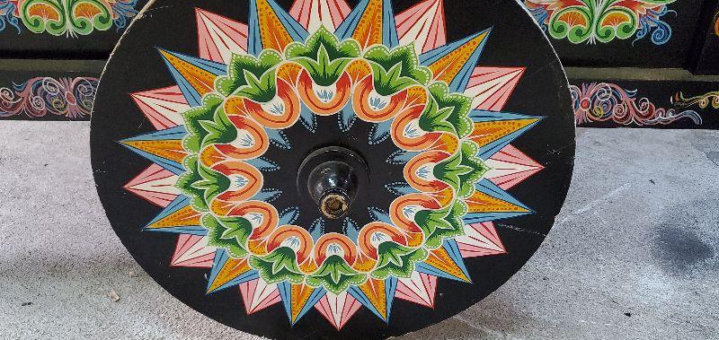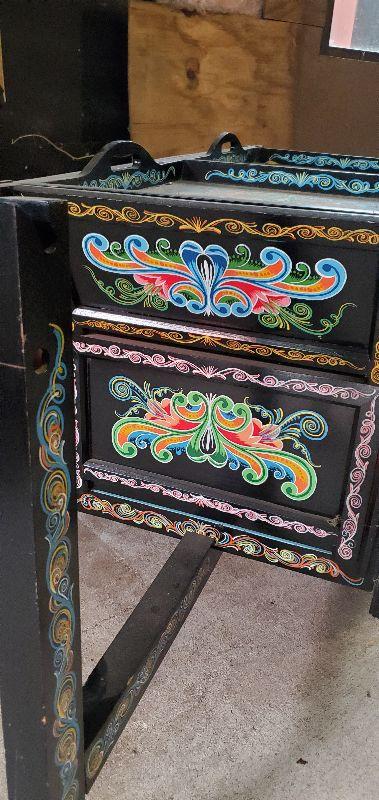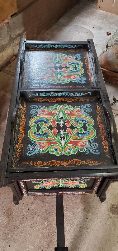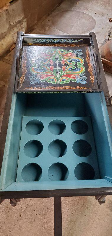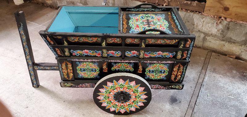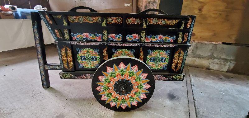This is a unique piece you don't see here in the US very often. This was brought back from Costa Rica in the 80's, nice solid piece. Absolutely gorgeous hand painted with very vibrant colors. It features two removable trays and a drink storage in the bottom of the cart. It measures 47" x 28" x 28" tall.