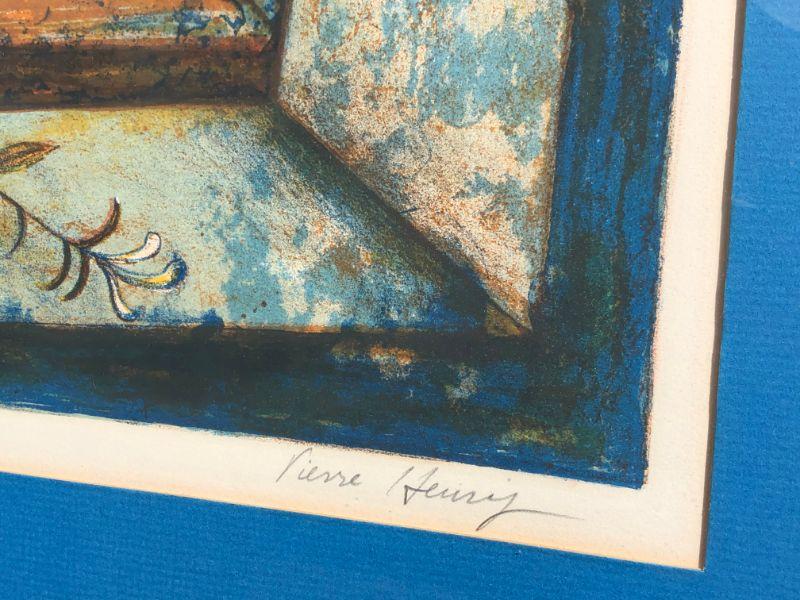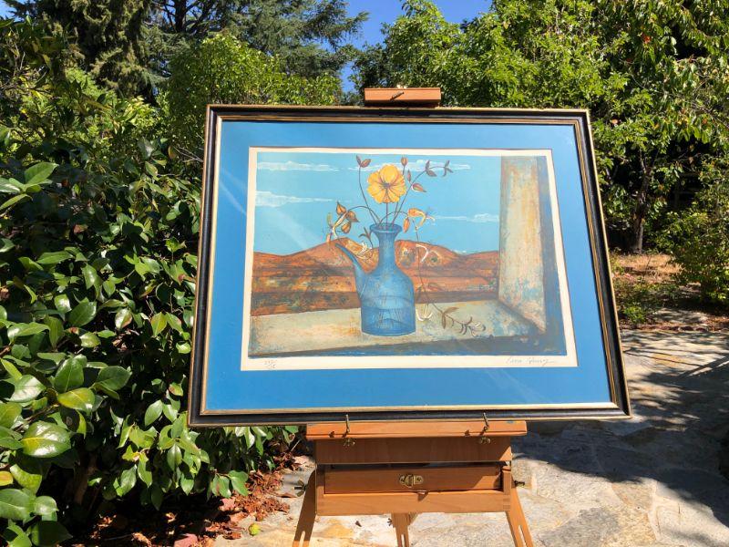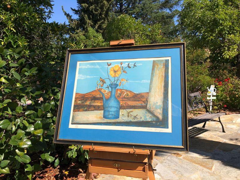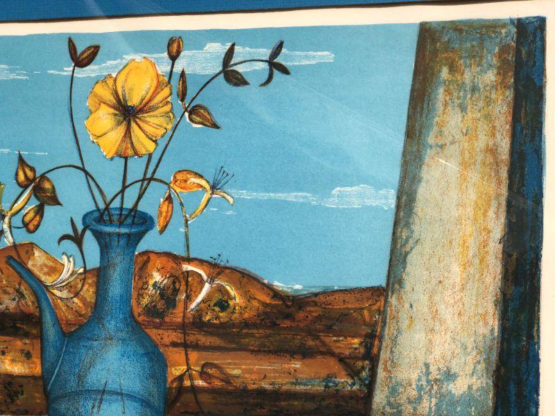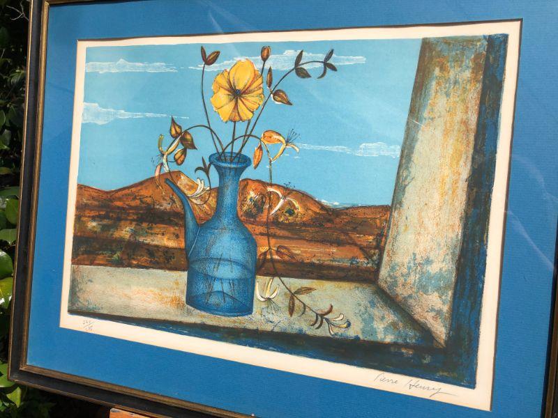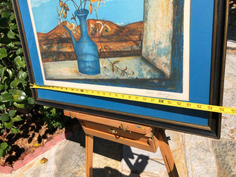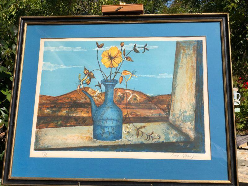A beautiful and vibrant work of art! This signed and numbered lithograph by Pierre Henry (artist info shown in photos) is of some beautiful wild flowers in a blue pitcher vase, sitting on a windowsill overlooking golden brown hills. Framed with blue to accentuate the colors. A very happy and beautiful piece of art for any home! In very good condition.