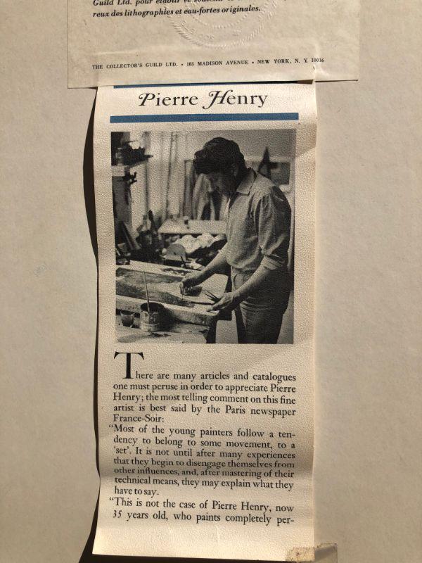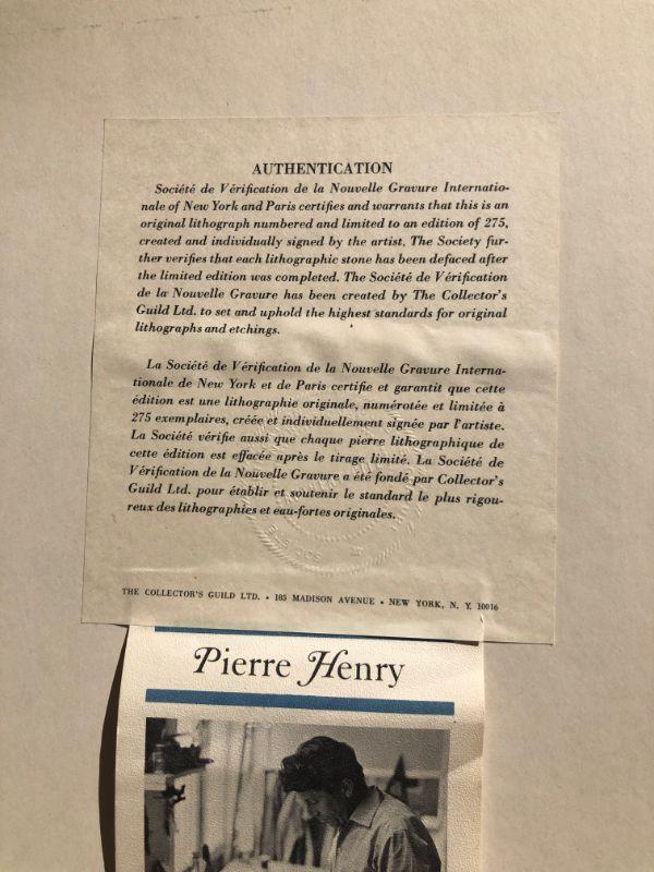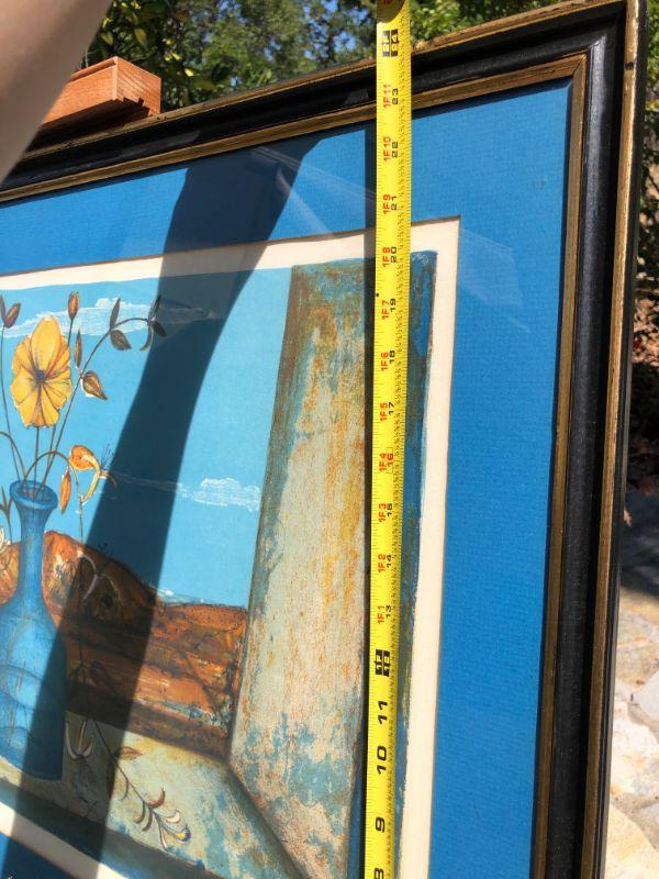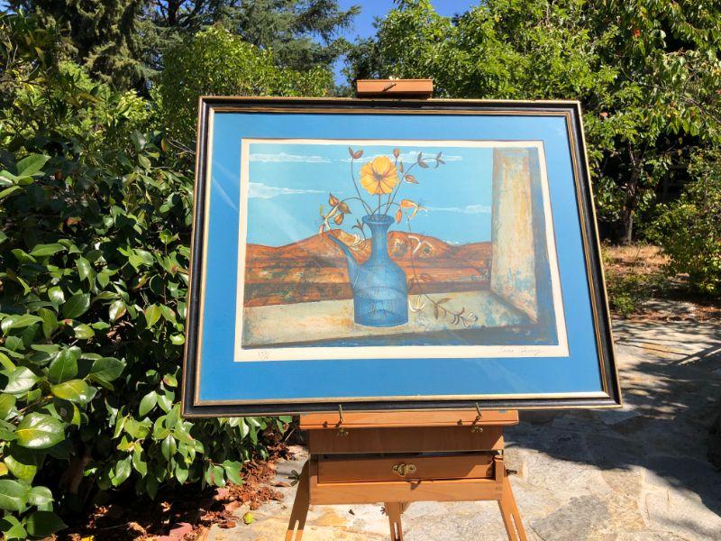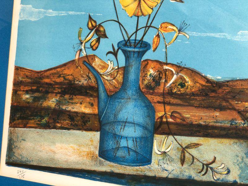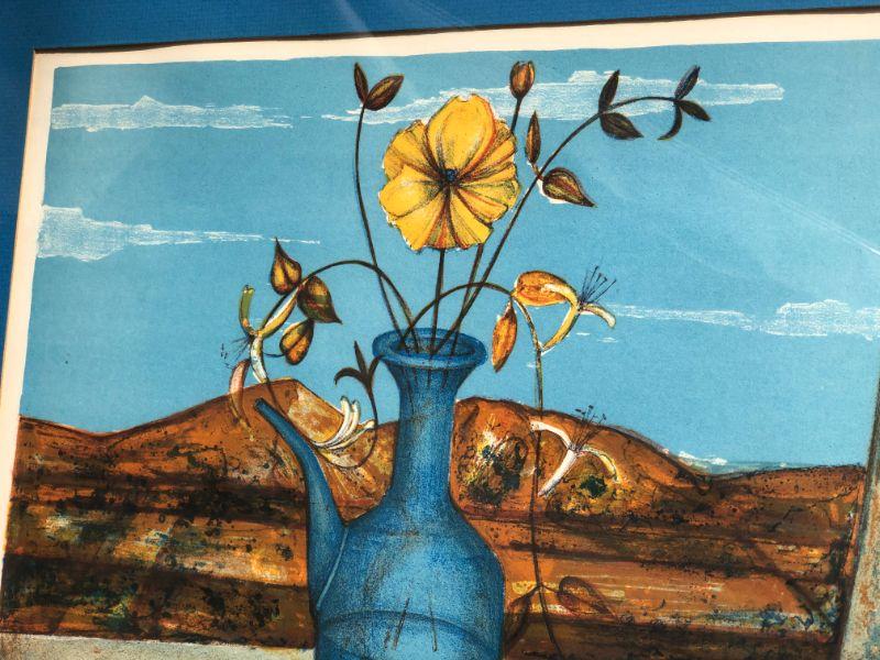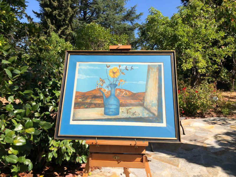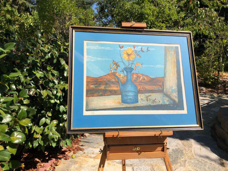 A beautiful and vibrant work of art! This signed and numbered lithograph by Pierre Henry (artist info shown in photos) is of some beautiful wild flowers in a blue pitcher vase, sitting on a windowsill overlooking golden brown hills. Framed with blue to accentuate the colors. A very happy and beautiful piece of art for any home! In very good condition.
