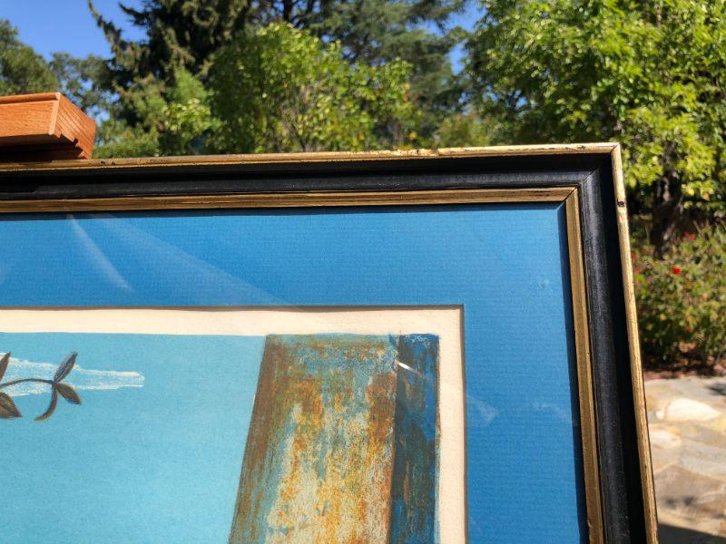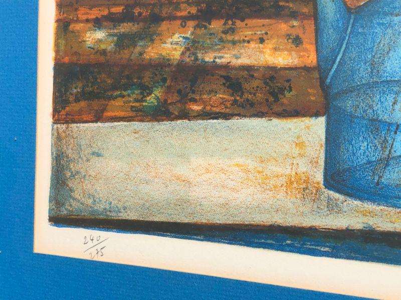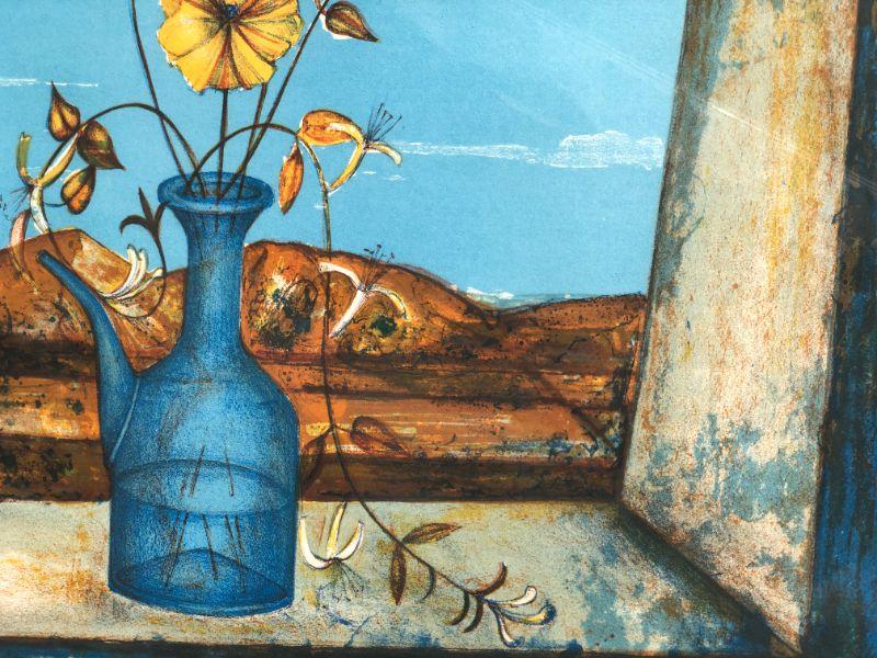 Vibrant Blue Pierre Henry Signed Lithograph Art of Flowers on a Windowsill