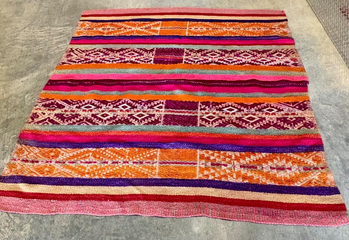 Jewel-toned rug features stripes and geometric motifs. Could be reversible. Appears to be wool or wool blend and to be two woven pieces seamed in the middle. 63” x 66” Slight mildew odor.